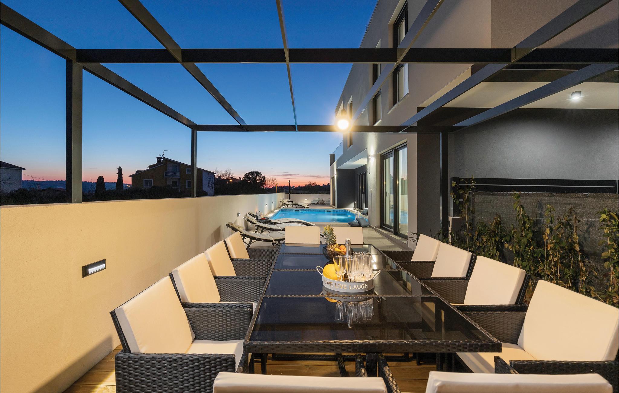 Das beeindruckende Ferienhaus mit Pool, in einem angenehmen Wohnviertel der Stadt Pula, ist die perfekte Kombination aus heimeliger Gemütlichkeit und modernen Style, die der Schlüssel für einen traumhaften Urlaub sind. Die großzügige Wohnfläche besteht aus drei Wohnungen. Dort befindet sich das zentrale Wohnzimmer mit Küche und Essbereich sowie direktem Zugang zur Außenterrasse, von der sich ein teilweiser Meerblick bietet. Selbstverständlich erwartet Sie auf dem komplett umzäunten Grundstück ein Pool sowie der Sonnen- und Grillbereich. Nach herrlichen Badetagen ist ein Besuch des römischen Amphitheaters empfehlenswert. Eine der Wohnungen im Erdgeschoss ist so gestaltet, dass der Wohnbereich als Spielraum mit Billiard, Darts und Playstation dient.