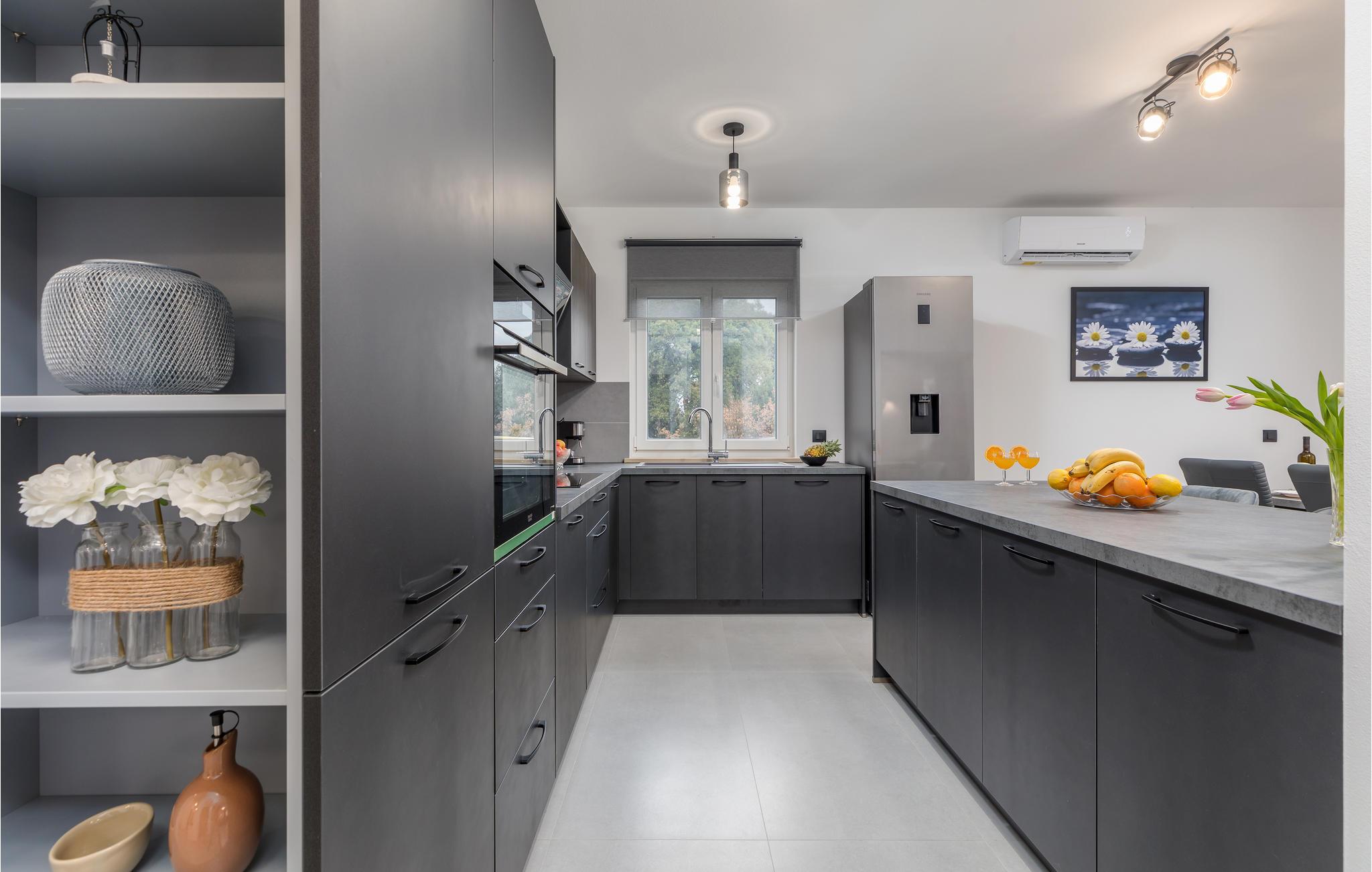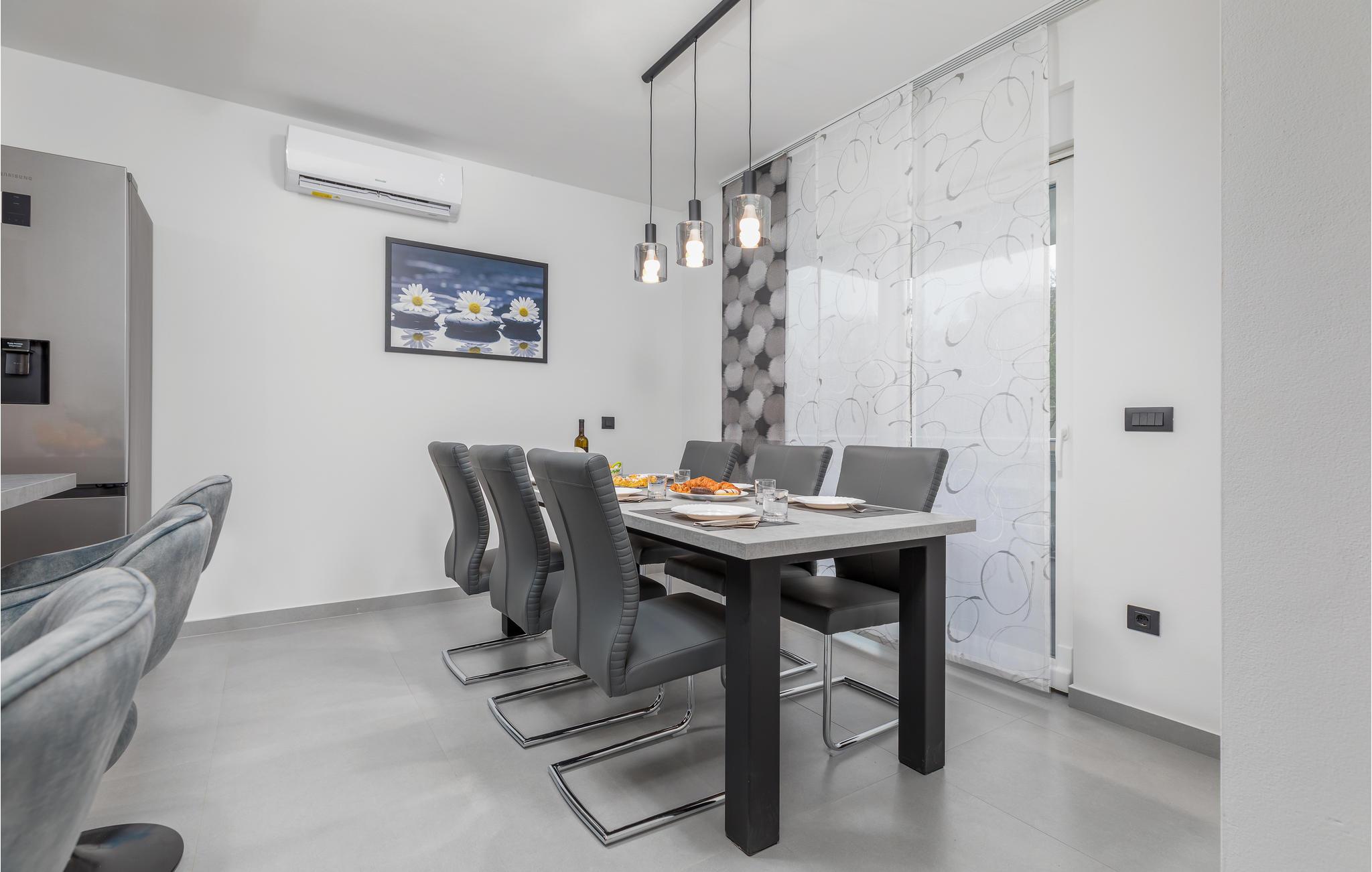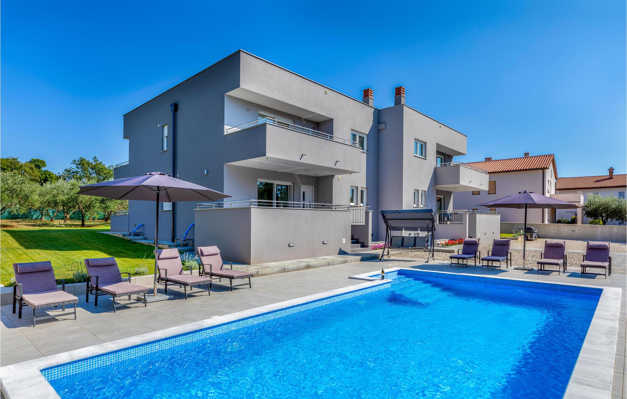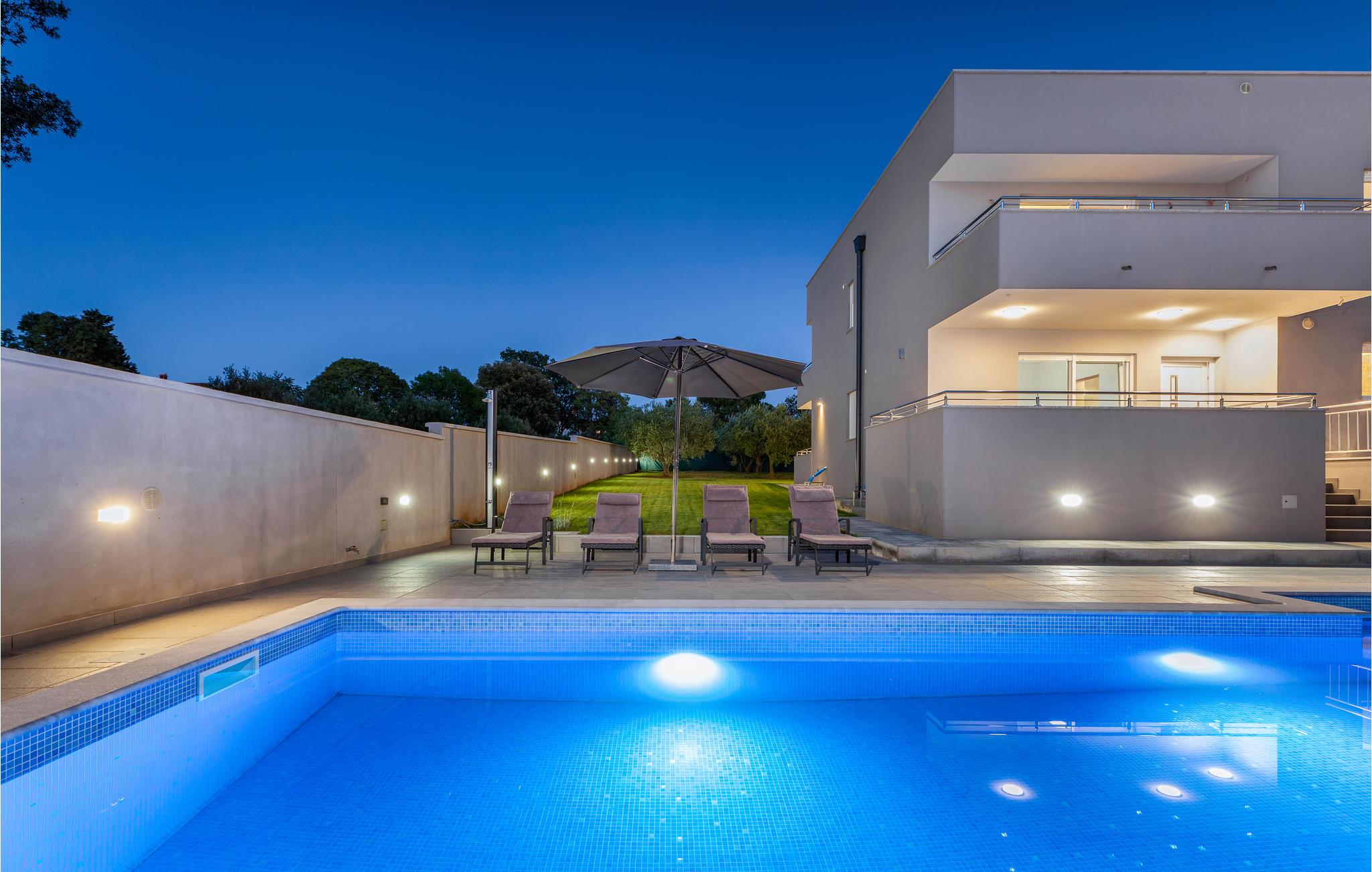 Es verfügt über ein modernes Design und ein elegant eingerichtetes Interieur. Im Erdgeschoss befinden sich das Wohnzimmer mit Zugang zu Terrassen, zwei Badezimmer, ein Schlafzimmer und ein Fitnessraum, während sich im Obergeschoss sechs Schlafzimmer, vier Badezimmer und eine Sauna befinden. Fünf Schlafzimmer haben Terrassen, von denen zwei einen Blick auf den Pool und den nahen Wald haben, während die anderen Terrassen einen Blick auf einen wunderschönen Olivenhain bietet. Billard, Tischtennis und Tischfußball stehen zur Verfügung. Hierkönnen Sie viel Spaß haben, während sich die Kinder auf dem Trampolin und der Schaukeln vergnügen können. Während Ihres Aufenthaltes werden Sie sicherlich viel Spaß beim Sonnenbaden und Schwimmen im großzügigen Pool haben und Ihre Lieblings-Grillgerichte genießen.