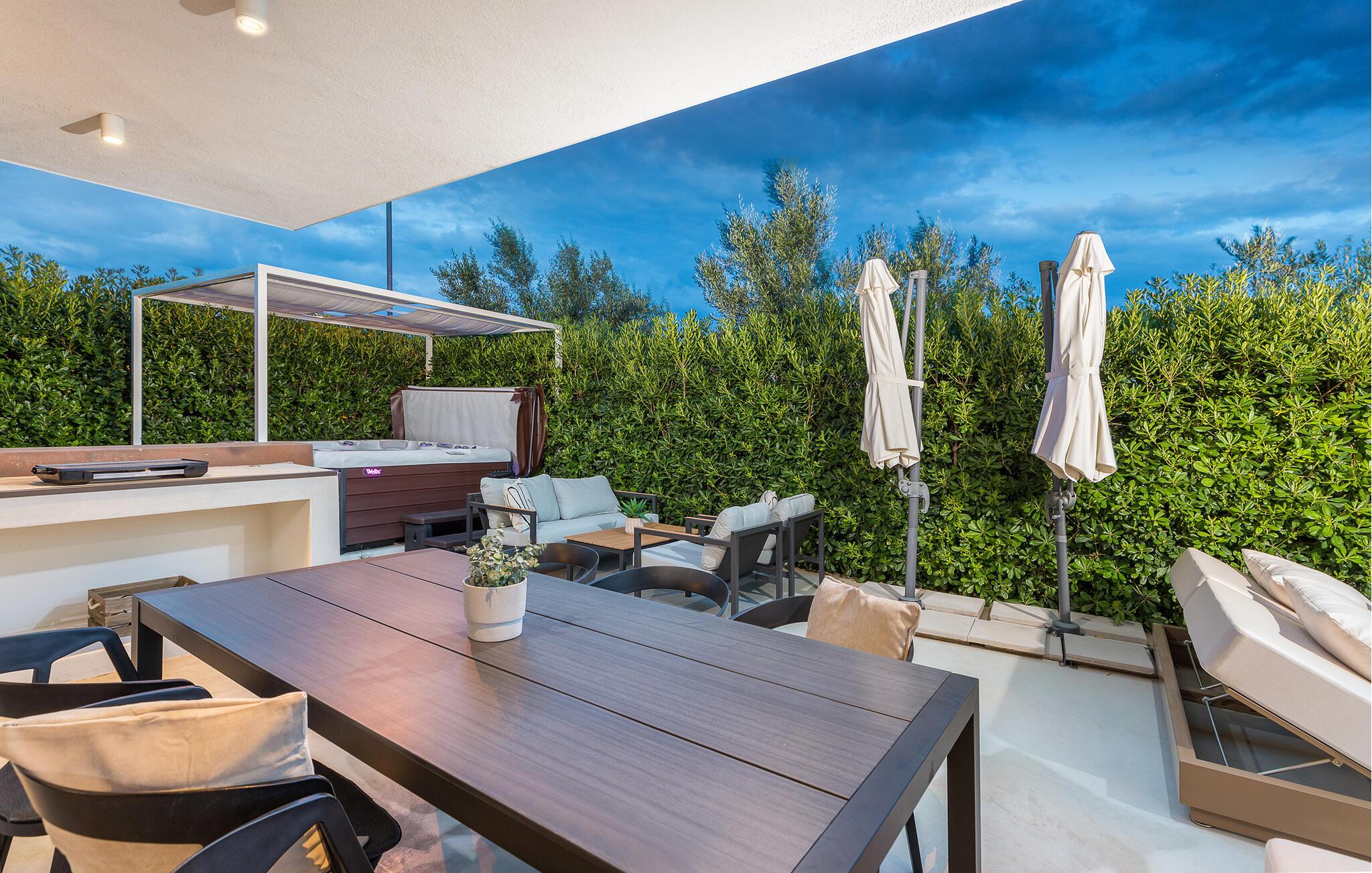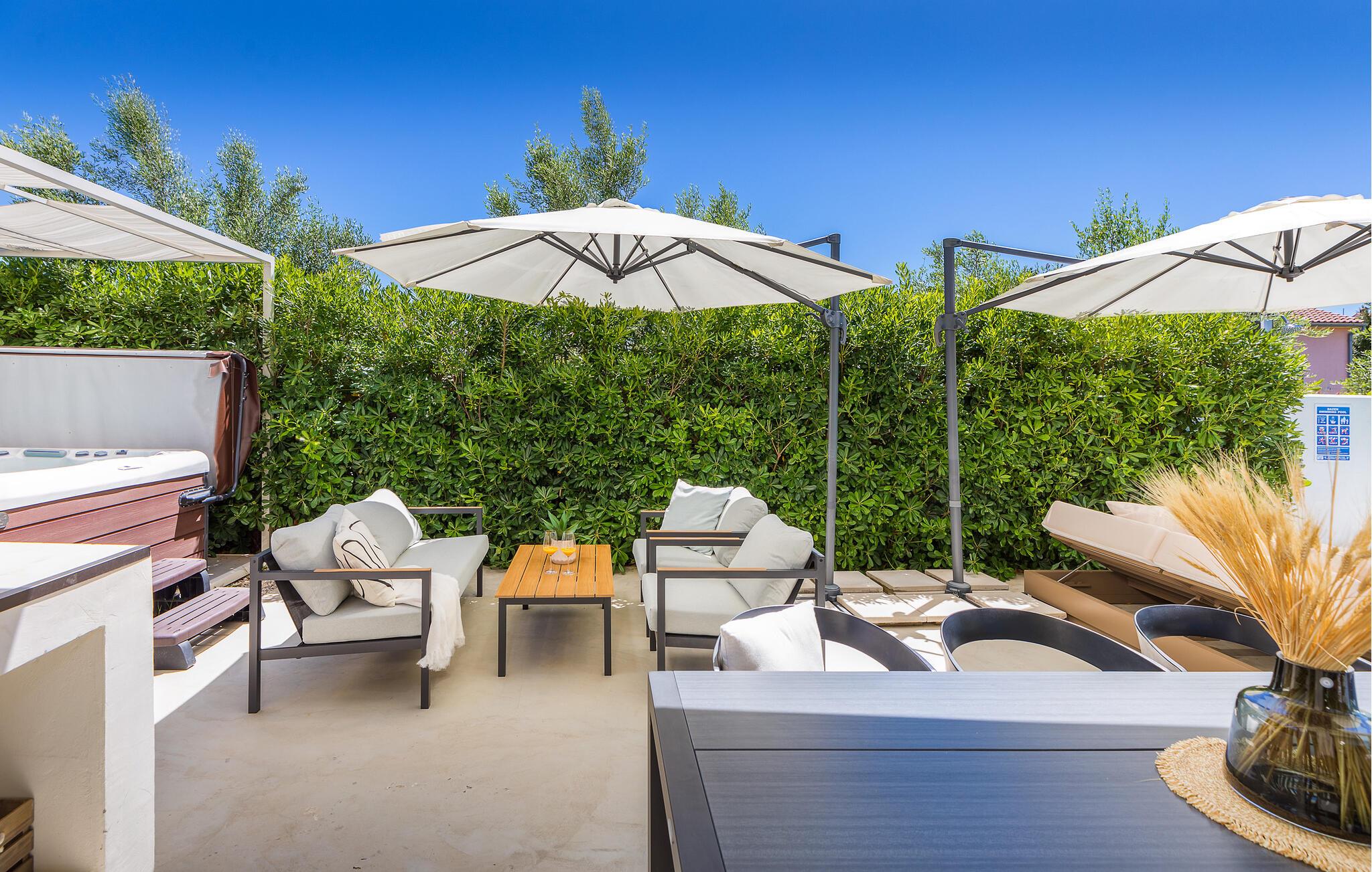 Dieses Ferienhaus eignet sich perfekt für einen Urlaub mit Freunden oder der Familie und besticht durch ein modernes Design und sorgfältig ausgewählte Details, die Sie in jeder Ecke finden werden. Besonders wird Sie der Außenbereich begeistern. Im ersten Stock finden Sie ein großes Sonnendeck. Hier können Sie viele Stunden auf einer der Sonnenliegen verbringen. Die Terrasse verfügt über einen Ruhebereich sowie einen Essbereich. Hier können Sie gemeinsam frühstücken oder den Tag bei einem Glas Wein ausklingen lassen. Ein Grill für gemütliche Grillabende steht Ihnen natürlich auch zur Verfügung. Der Pool verfügt über ein Elektrolysesystem und bietet Ihnen auch eine angenehme Massage, da er über eingebaute Düsen verfügt. In und an Ihrem Pool werden Sie viele schöne Stunden verbringen. Suchen Sie zusätzliche Entspannung auf den schönen Liegestühlen am Pool sowie den großen Bett-Liegestühlen. Für die Kleinsten gibt es auch ein Trampolin.