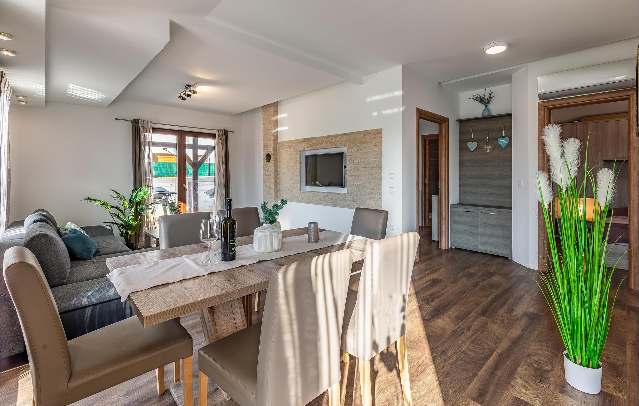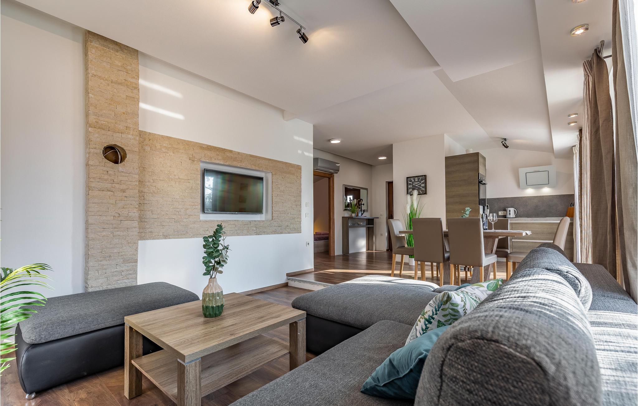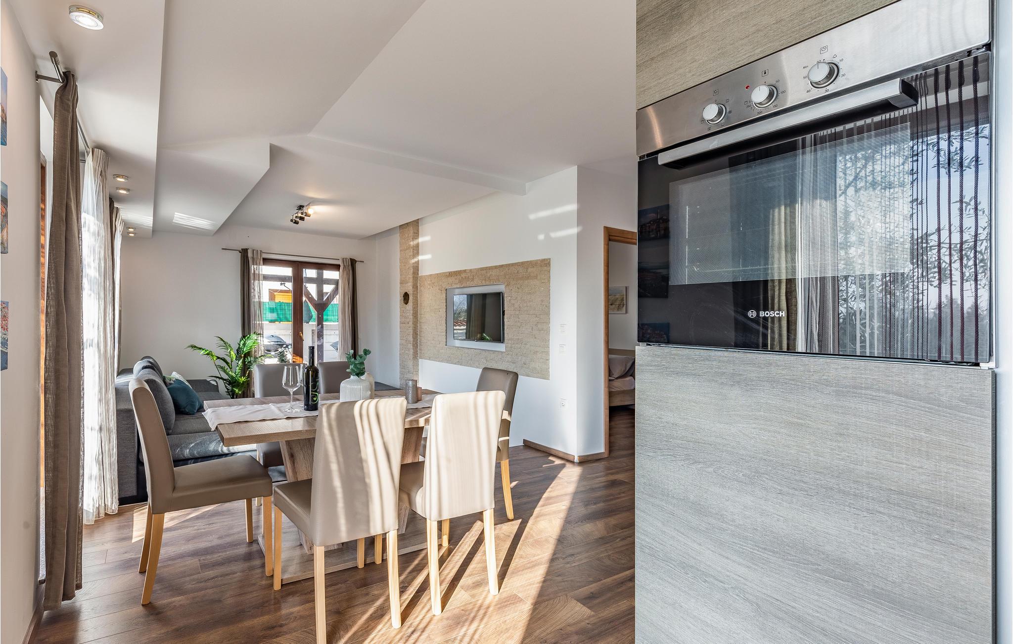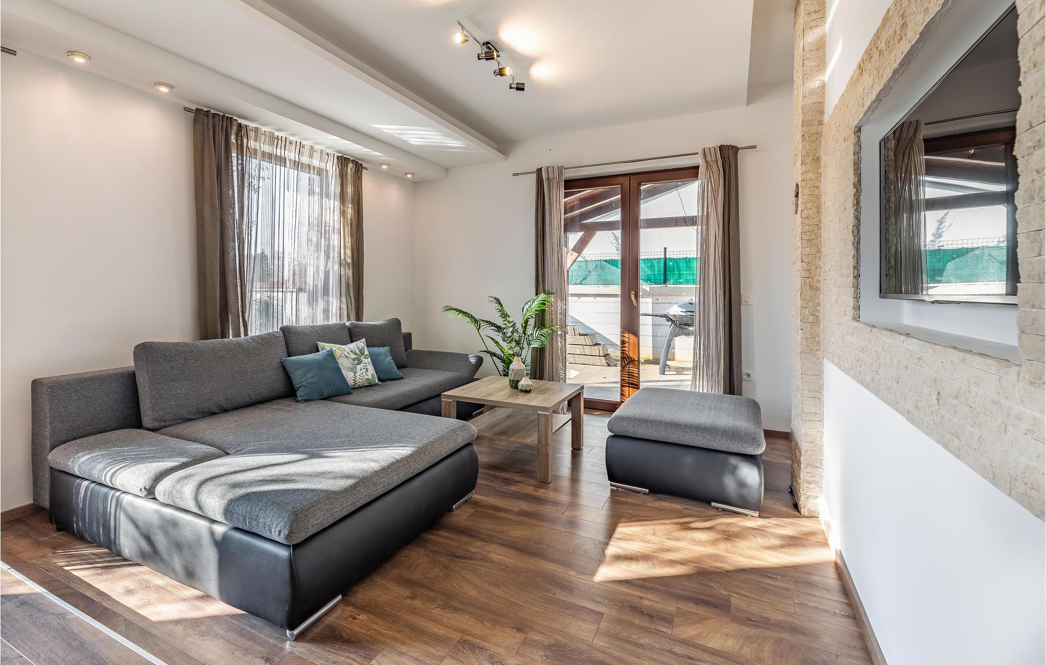 Willkommen in dem schönen Haus in ruhiger Lage nahe Pula. Es bietet mit seinen hellen Räumen, der komfortablen Ausstattung und der modernen Einrichtung mit dezenten Farben den idealen Rahmen für Ihre Erholung. Durch bodentiefe Fenster gelangt viel Licht ins Haus. Entspannen Sie in diesem stilvollen Ambiente auf dem gemütlichen Sofa und genießen Sie die gemeinsame Zeit.