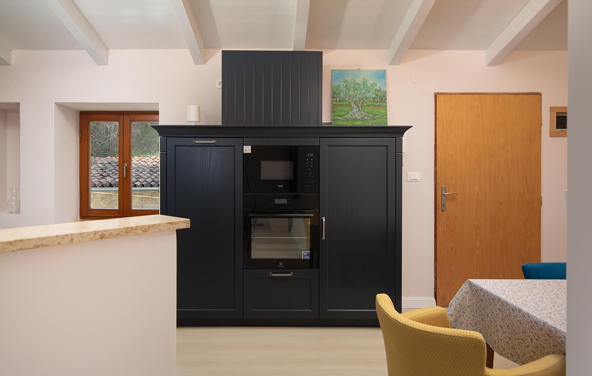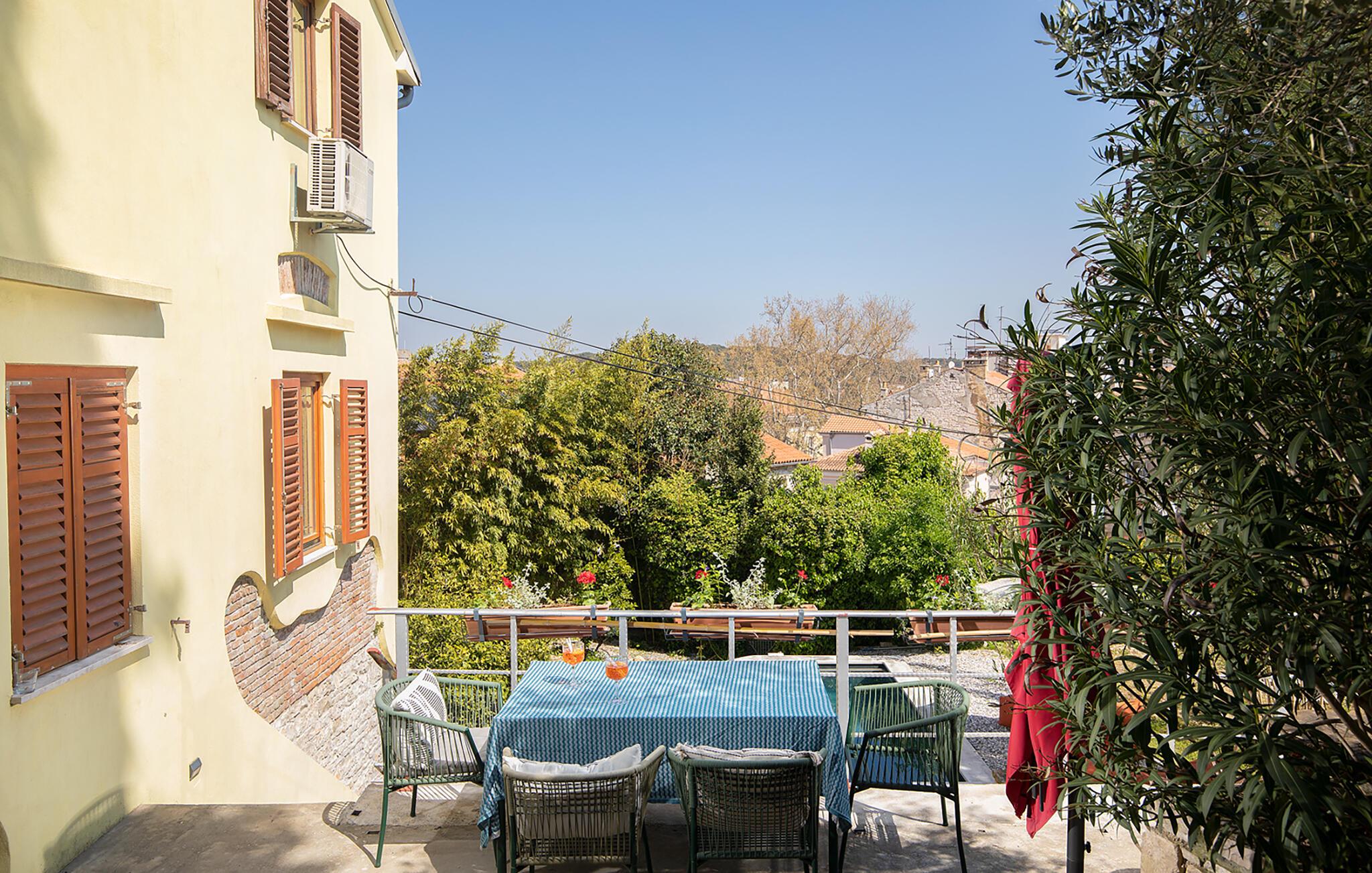 Ihre Steinvilla in der Hauptstadt Istriens ist der ideale Ort für einen erholsamen Urlaub. Beginnen Sie Ihren Tag mit einem Frühstück auf der gemütlichen Terrasse, umgeben von üppigem Grün und bunten Blumen. Der Blick auf die malerische Umgebung und die historische Stadt im Hintergrund schafft eine friedliche Urlaubsatmosphäre. Drinnen erwartet Sie ein geschmackvoll eingerichteter Wohnbereich mit gemütlichen Sitzmöbeln, ideal für entspannte Abende nach einem Tag voller Abenteuer. Nutzen Sie die gut ausgestattete Küche mit Esstisch, um leckere Mahlzeiten zuzubereiten.