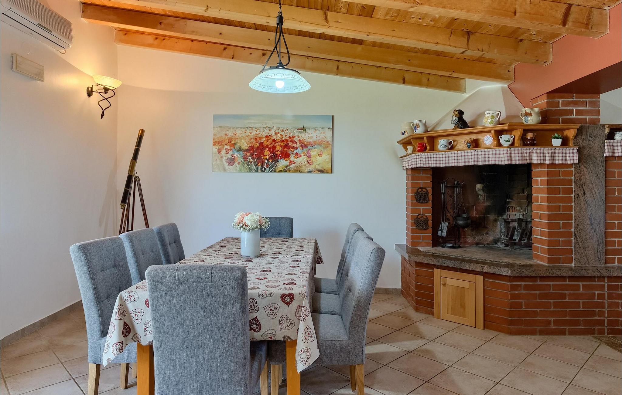 Das große Esszimmer ist im rustikalen Stil eingerichtet, mit einem offenen Kamin und einer Holzdecke, die der Atmosphäre des Hauses Wärme verleihen. Die Küche ist modern und komplett ausgestattet.