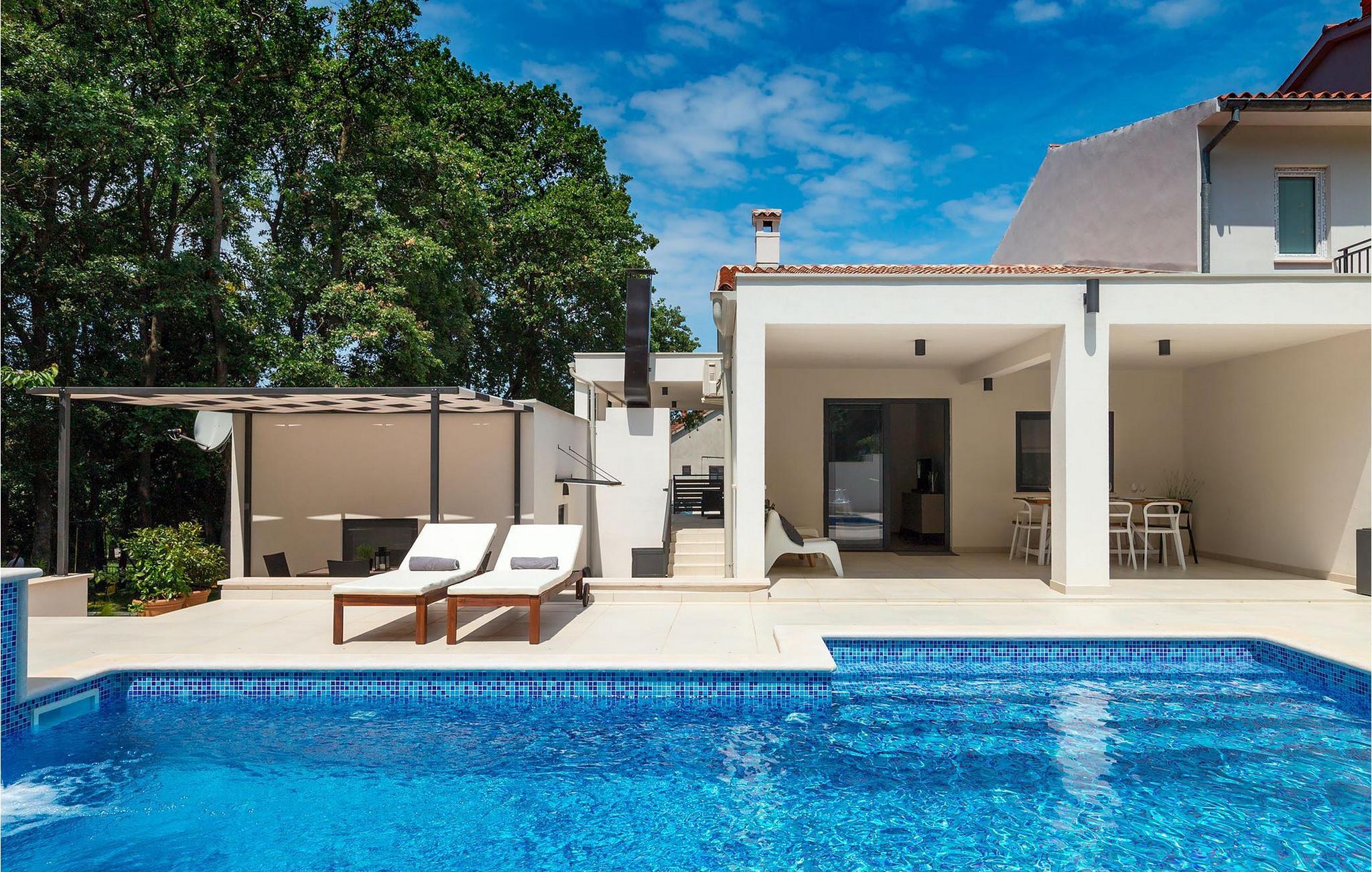 In einer ruhigen Wohngegend gelegen, umgeben von einem wohltuendem Eichenwald und doch in unmittelbarer Nähe des bezaubernden historischen Zentrums von Pula, bietet die Villa Del Sole einen erholsamen Ausgangspunkt, um alle Sehenswürdigkeiten zu erkunden, die diese wunderschöne Region zu bieten hat. Alle notwendigen Annehmlichkeiten sind nur wenige Gehminuten entfernt und einige der schönsten Strände in Istrien sind nur wenige Kilometer entfernt. Im Inneren ist die Unterkunft in zwei getrennte einstöckige Einheiten unterteilt. Das Haupthaus verfügt über eine Open-Space Küche mit Esszimmer. Diese führt zur schönen Terrasse mit einem weiteren Ess-und Lounge-Bereich, wo Sie faule Nachmittage im Schatten genießen könnrn. Es gibt auch ein gemütliches Wohnzimmer mit direktem Zugang zum Pool und Garten, sowie zwei Schlafzimmer, ein Doppelzimmer und ein Zweibettzimmer und ein Badezimmer. Das unabhängige Studio-Apartment befindet sich direkt neben dem Pool und verfügt über ein Schlafzimmer mit Doppelbett und ein zusätzliches Schlafsofa, eine kleine Küche mit Essbereich sowie ein eigenes Bad.