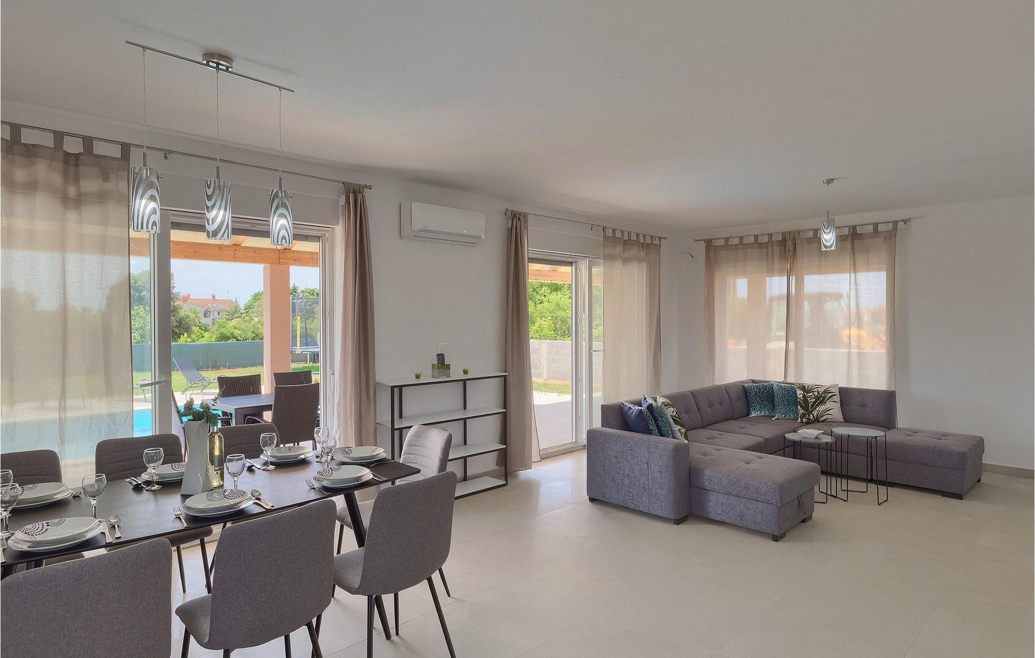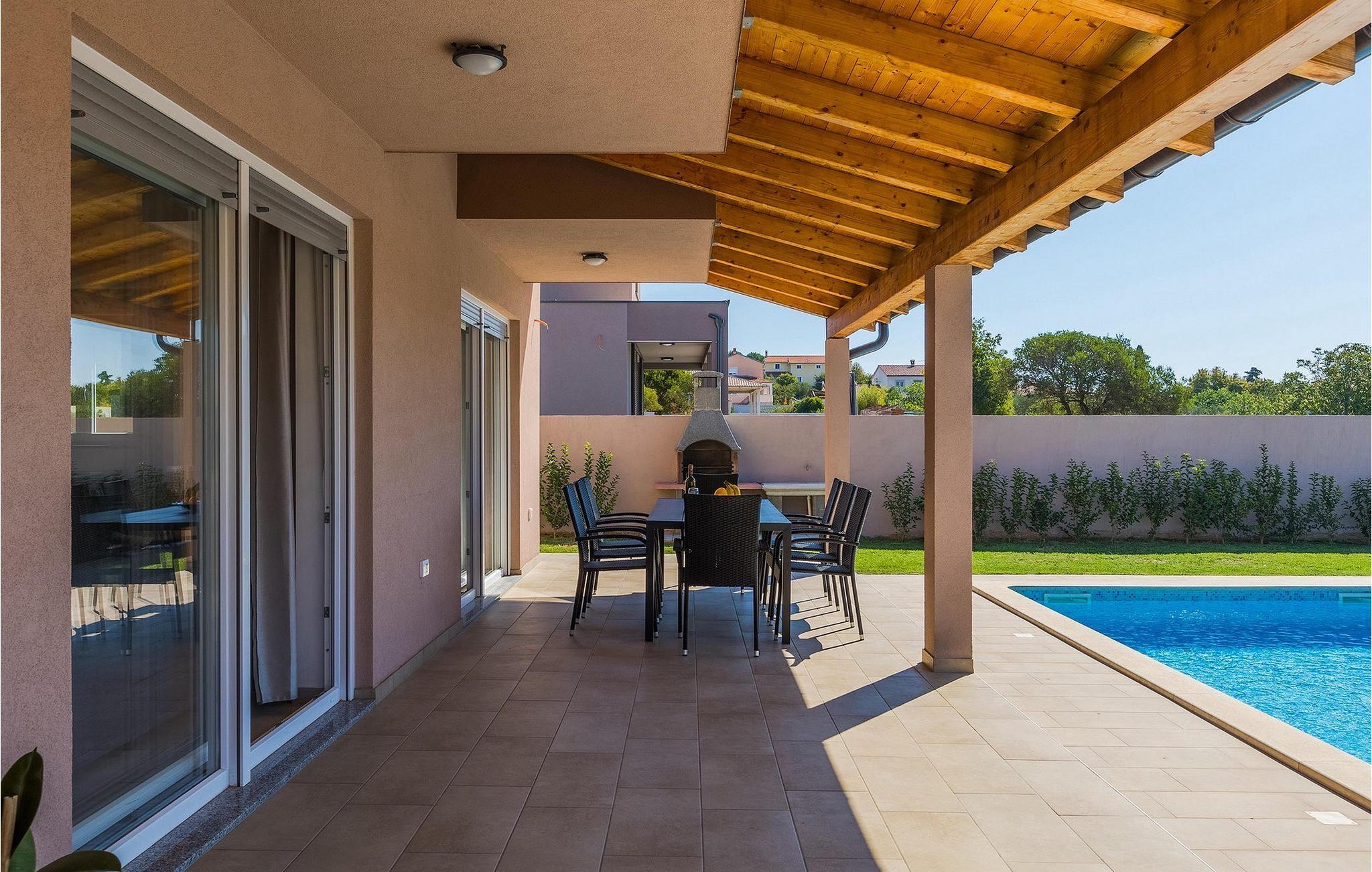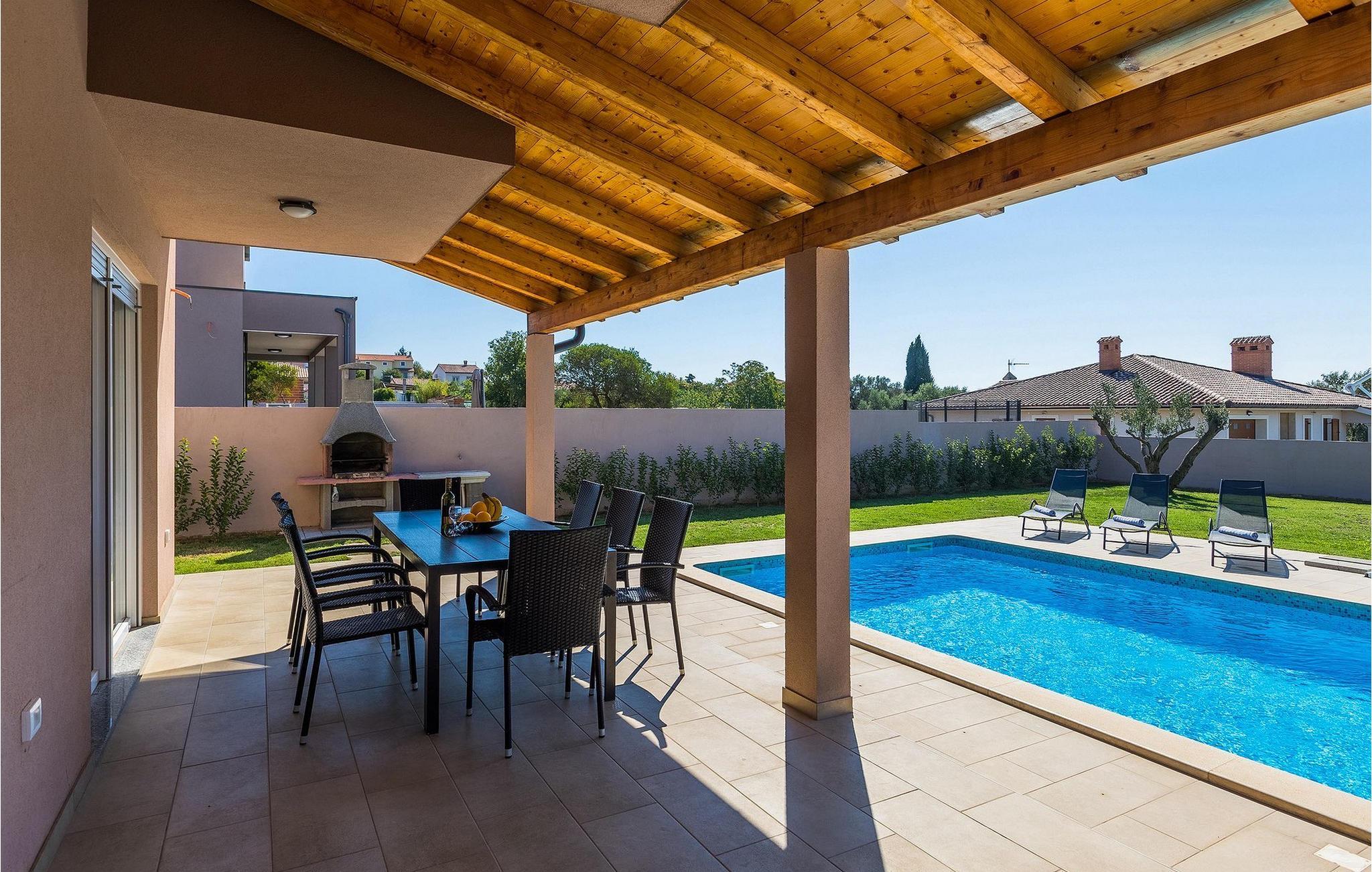 Im Sommer werden Sie bestimmt den wunderschönen Außenbereich zu schätzen wissen. Erfrischen Sie sich im Pool und genießen Sie danach die warmen Sonnenstrahlen auf einer der Sonnenliegen. Ihre Kinder werden begeistert sein zu hören, dass es im Garten ein Trampolin gibt. Von den Liegestühlen aus können Sie Ihre Kinder leicht im Auge behalten, während sie auf dem Trampolin spielenDie Lage dieser Villa ist wirklich günstig - nur wenige Kilometer vom nächsten Strand entfernt und in der Nähe von den Städten Pula und Medulin. Gleichzeitig befindet sich die Villa in einer relativ ruhigen Gegend. Pula ist der größte Hafen und das touristische Zentrum der Halbinsel Istrien. Pula ist reich an Kultur, Tradition und wunderschöner Natur und bietet alle Arten von Freizeitaktivitäten, darunter Sportanlagen, Restaurants sowie organisierte Ausflüge. Das Wahrzeichen dieser Stadt ist definitiv die zwanzig Jahrhunderte alte Stadtarena, in der während der Römerzeit Gladiatorenkämpfe und Jagdspektakel stattfanden. Heute ist es das sechstgrößte Amphitheater der Welt. Pula bietet tolle Möglichkeiten für den Urlaub. Außer der Stadt allein sollten Sie unbedingt die Umgebung besuchen - die üppig grüne Landschaft Südistriens, die Schönheit der umliegenden Strände, den Naturpark Kamenjak oder den Nationalpark Brioni.