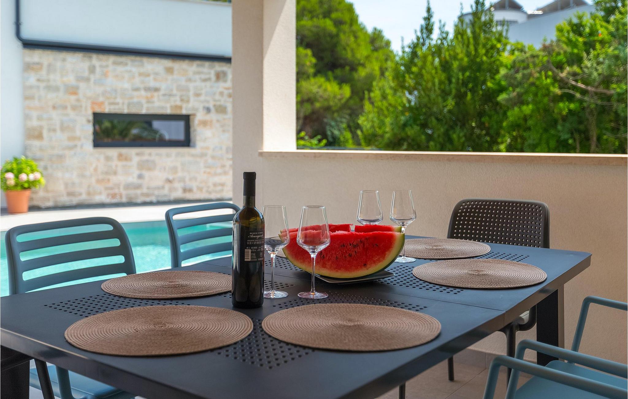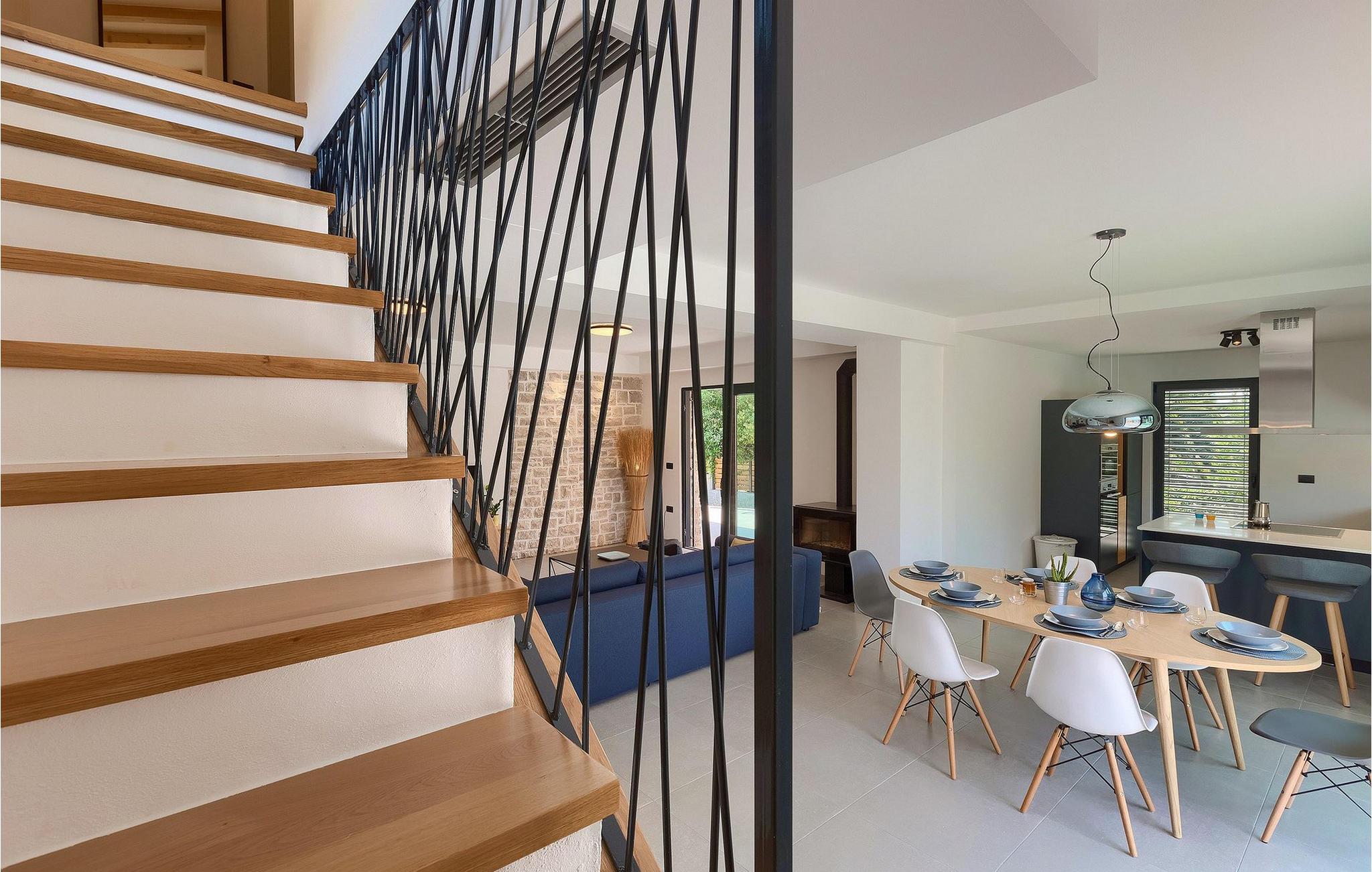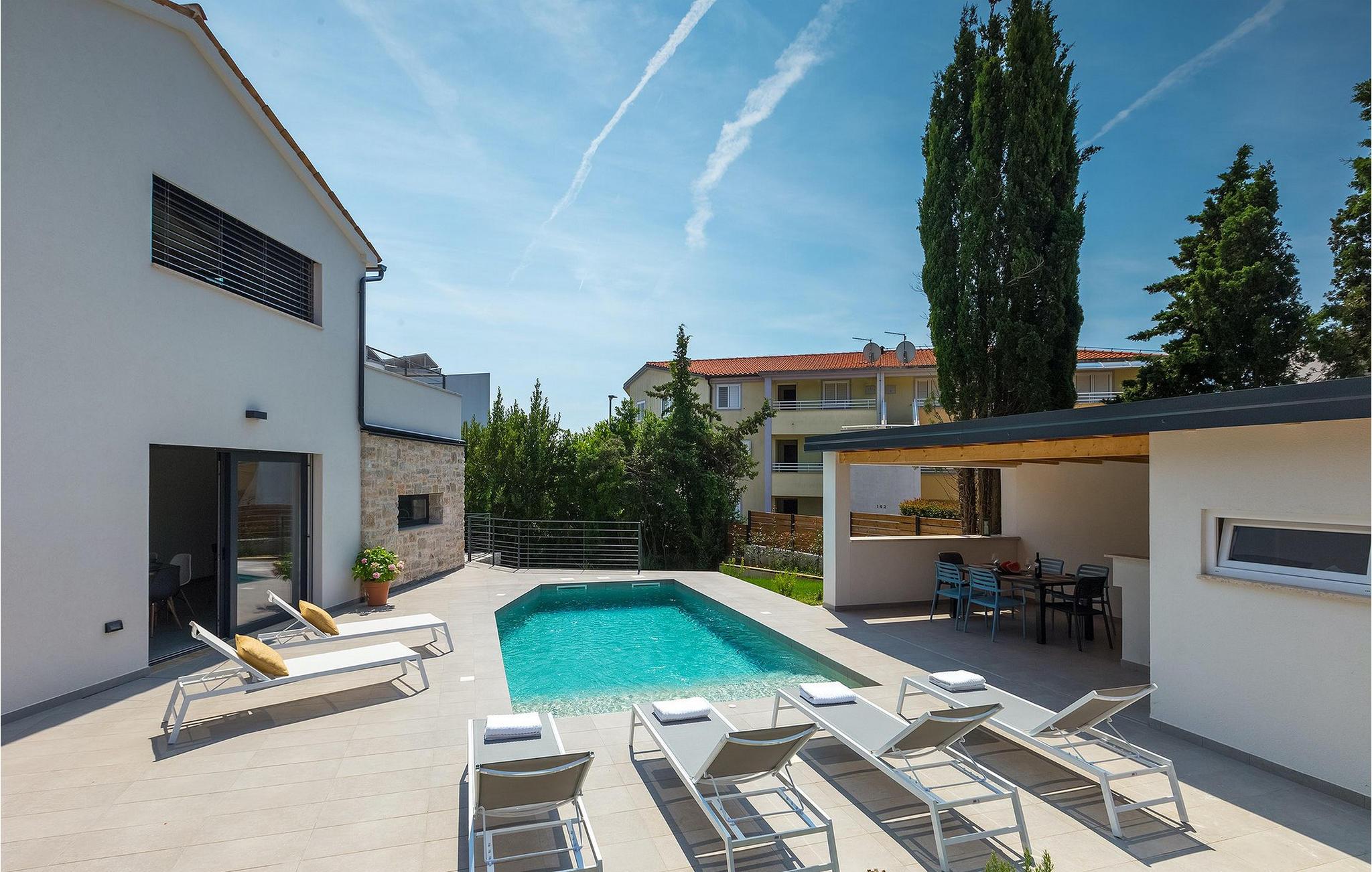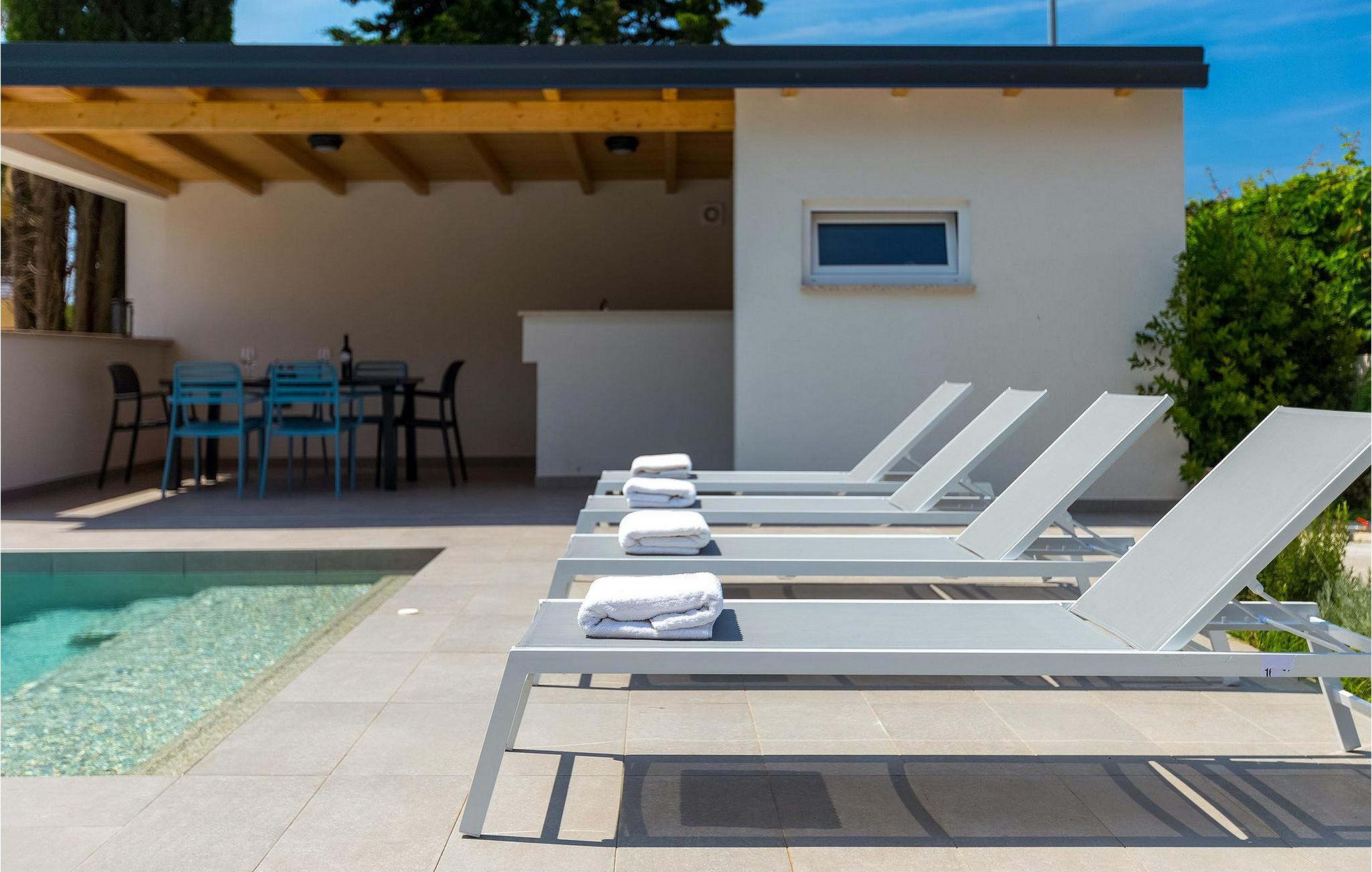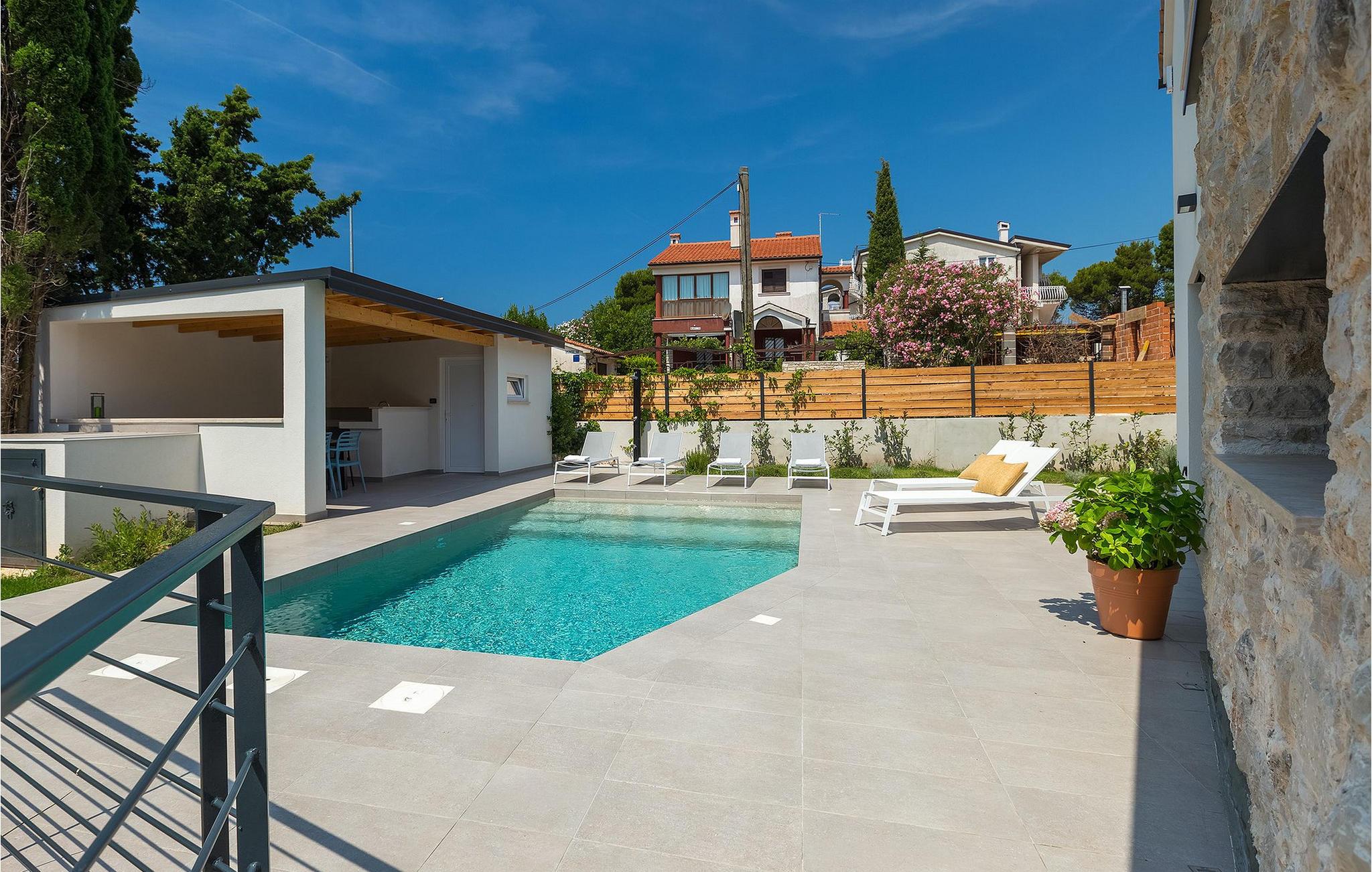 Dieses wunderschöne Ferienhaus liegt nur einen kurzen Spaziergang von etwa 250 m vom nächsten Strand entfernt und ist in der Nähe der geschützten Landschaft des Kaps Kamenjak gelegen. Es verfügt über einen privaten Pool und einen schönen Garten mit einem überdachten Essbereich mit Gasgrill, der sich ideal für Mahlzeiten im Freien und gemütliche Sommerabende eignet. Die Villa besteht aus 3 komfortablen Schlafzimmern mit jeweils eigenem Bad und Klimaanlage. Ein Schlafzimmer befindet sich im Erdgeschoss und verfügt über zwei separate Betten, während die anderen 2 Schlafzimmer über die obere Etage verteilt sind und auch von einem schönen Balkon profitieren, von dem aus Sie den herrlichen Meerblick genießen können. Der offene Hauptraum im Erdgeschoss ist schlicht und modern, aber mit Liebe zum Detail eingerichtet und unterteilt sich in die voll ausgestattete Küche, den Wohnbereich mit Kamin und SAT-TV sowie den Essbereich mit Direktwahltelefon Zugang zum Garten und zum Pool. Diese Villa bietet moderne Unterkünft in Kombination mit dem einladenden privaten Pool und einer großartigen Lage - alles für einen unvergesslichen Urlaub in Istrien!Premantura ist von der Natur umgeben, wie sich nicht viele Orte rühmen können. Im Süden der Stadt ist Cape Kamenjak - ein Naturschutzgebiet, 9,5 km lang, 1,5 km breit, mit insgesamt 30 km gegliederter Küste. Es gibt viele Felsstrände sowie Kiesbuchten. Auf einer relativ kleinen Fläche gibt es 530 Pflanzenarten, davon 20 verschiedene Orchideen-Arten, von denen einige endemisch sind. Aus diesem Grund gibt es keine Campingplätze, Hotels oder Ähnliches in dieser Umgebung. Bei einem Besuch in Cape Kamenjak verpassen Sie nicht eine große Attraktion das Springen von hohen Klippen mit Fackeln. Aufgrund der günstigen Winde ist es ideal für Wassersportarten vom Sommer bis in den späten Herbst. Ende Oktober findet das attraktive Treffen der Surfer statt. Für diejenigen, die in die faszinierende Unterwasserwelt eintauchen möchten, gibt es viele Tauchzentren in der Stadt. Dies ist eine der wenigen Destinationen mit einem Strand für Sehbehinderte. Es ist wichtig zu betonen, dass es in Premantura eine private Dialyseklinik gibt, für die Gäste, die eine solche Behandlung benötigen. Premantura ist ein Erlebnis!