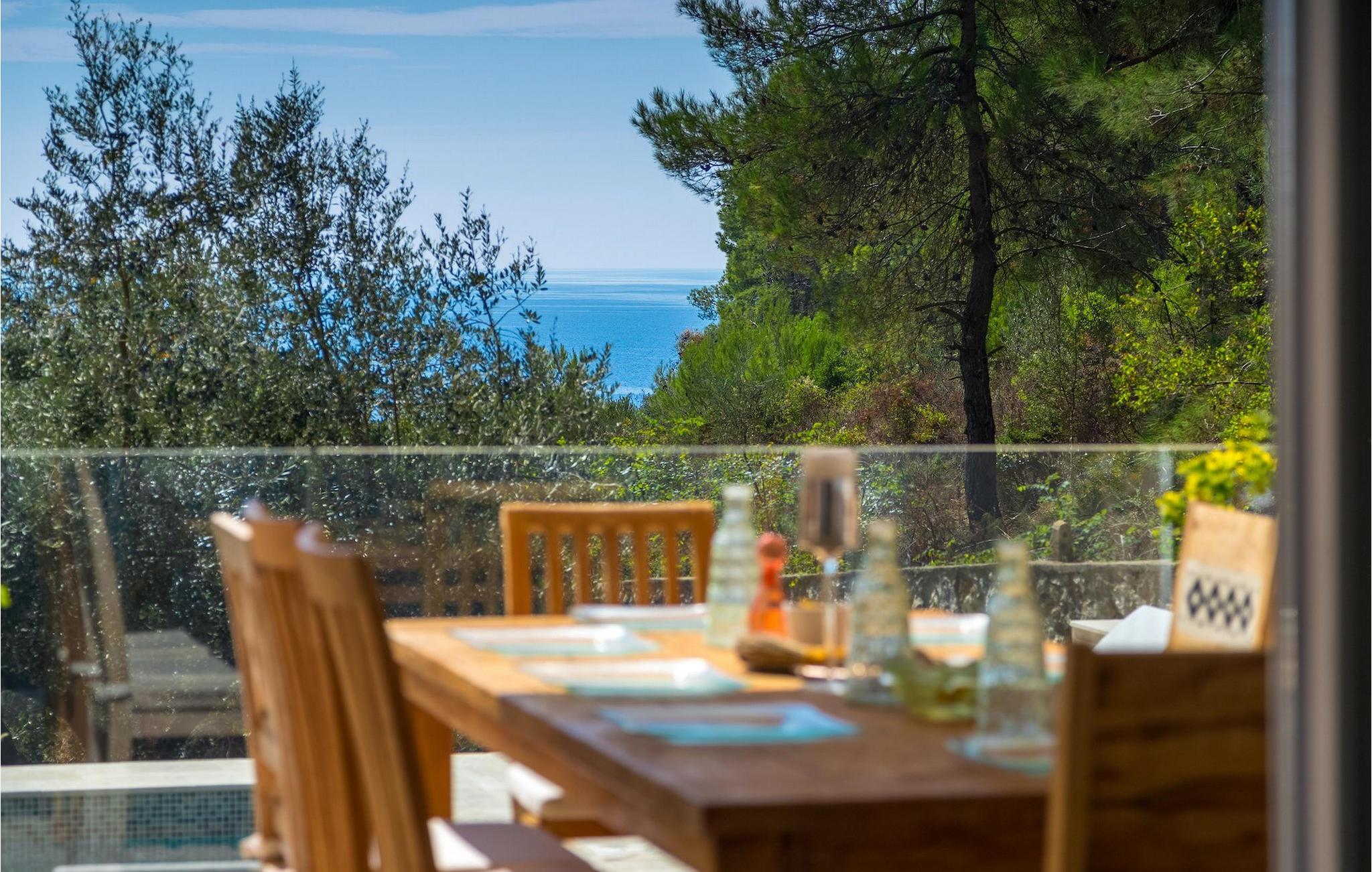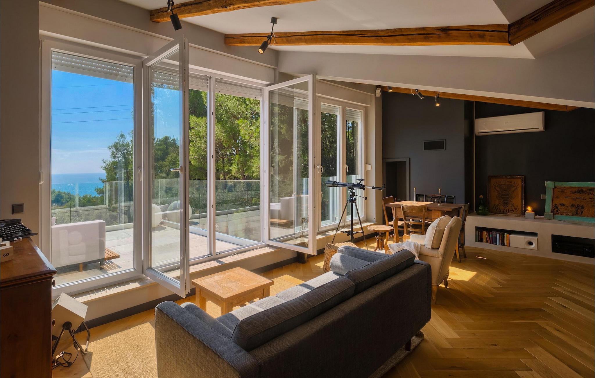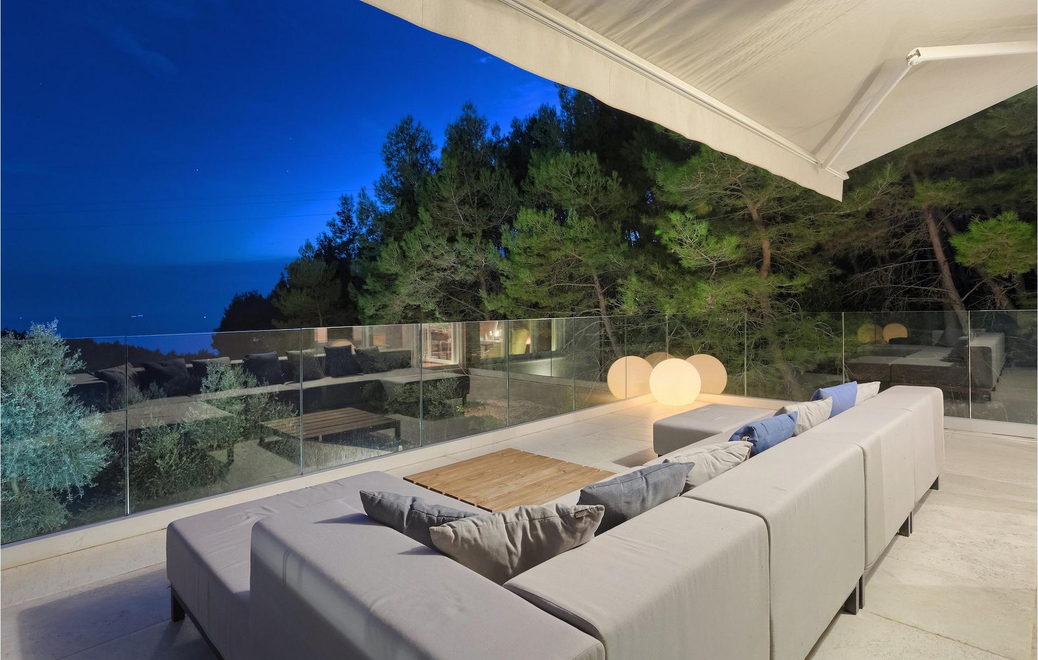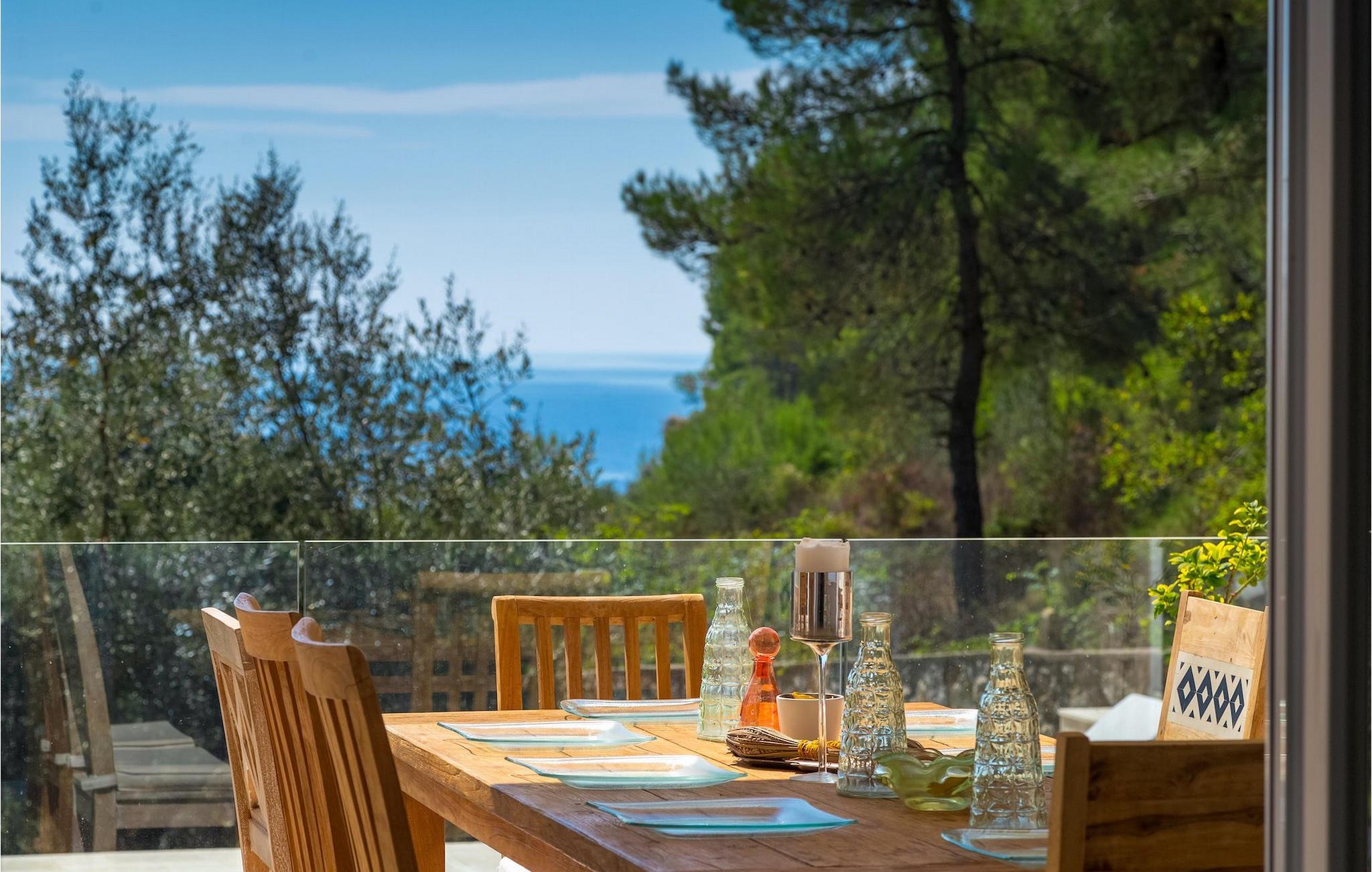 Der Wohnbereich im ersten Stock schaut zum Meer und bietet einen wunderschönen Panoramablick. Von hier aus gelangen Sie direkt auf die Außenterrasse mit einem Lounge-Bereich, ideal um ruhige, warme Sommernächte mit einem oder zwei Getränke zu genießen. Das Anwesen ist komplett umzäunt, umgeben von einem Wald und bietet somit viel Privatsphäre. Der Außenbereich ist eine wahre Oase für sich: Er bietet einen schönen privaten Pool, einen überdachten Essbereich für 8 Personen mit Grill und komfortable Lounge-Bereiche am Pool, die Sie sicherlich genießen werden. Alle Details in dieser geschmackvoll gestalteten und dekorierten Villa wurden von den Eigentümern aus verschiedenen Teilen der Welt sorgfältig ausgewählt, um den Gästen einen angenehmen Aufenthalt bieten zu können.