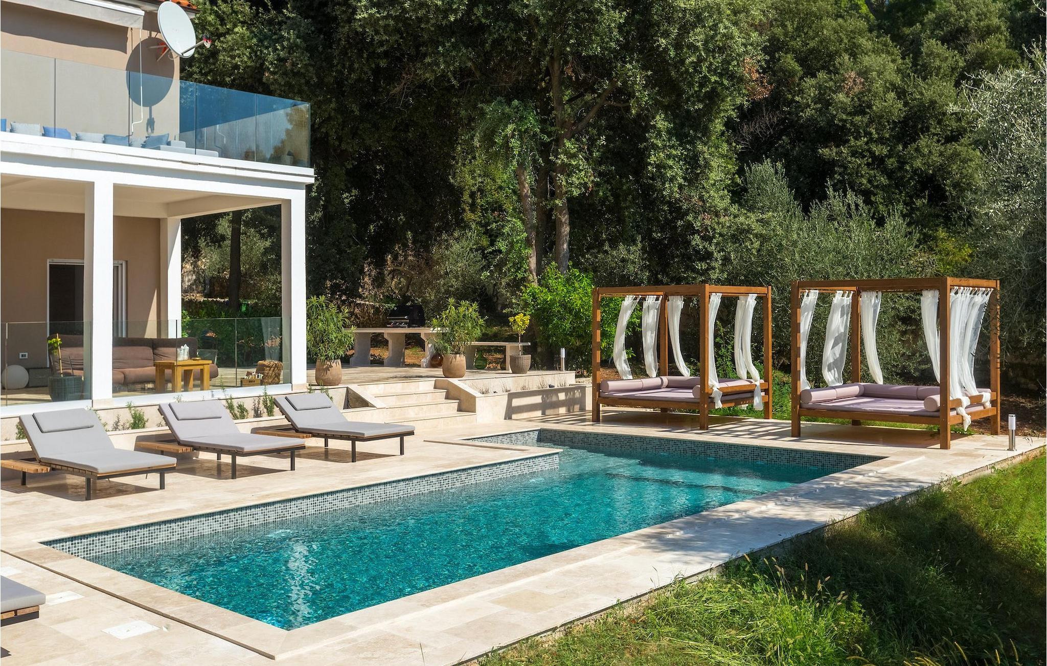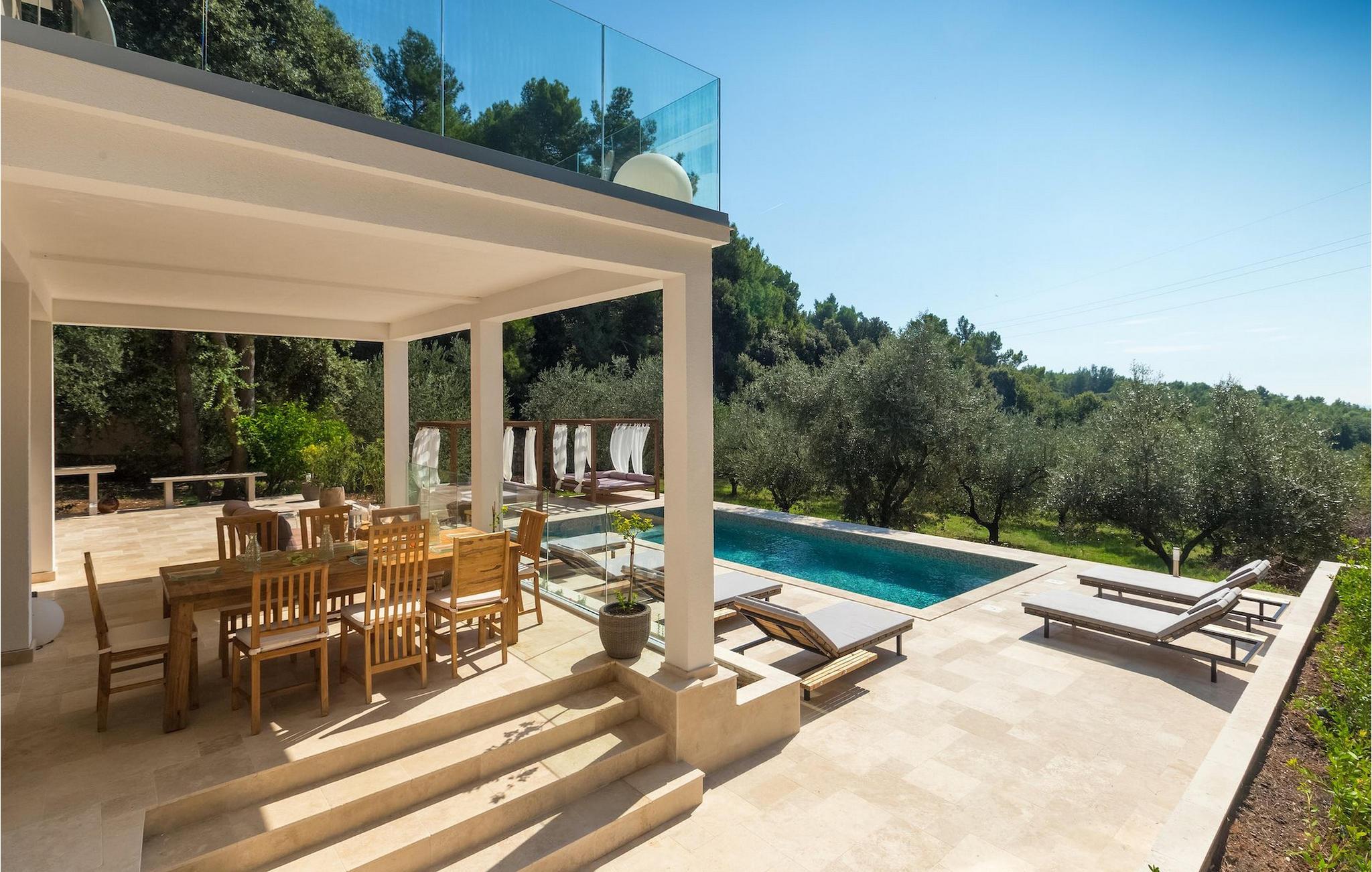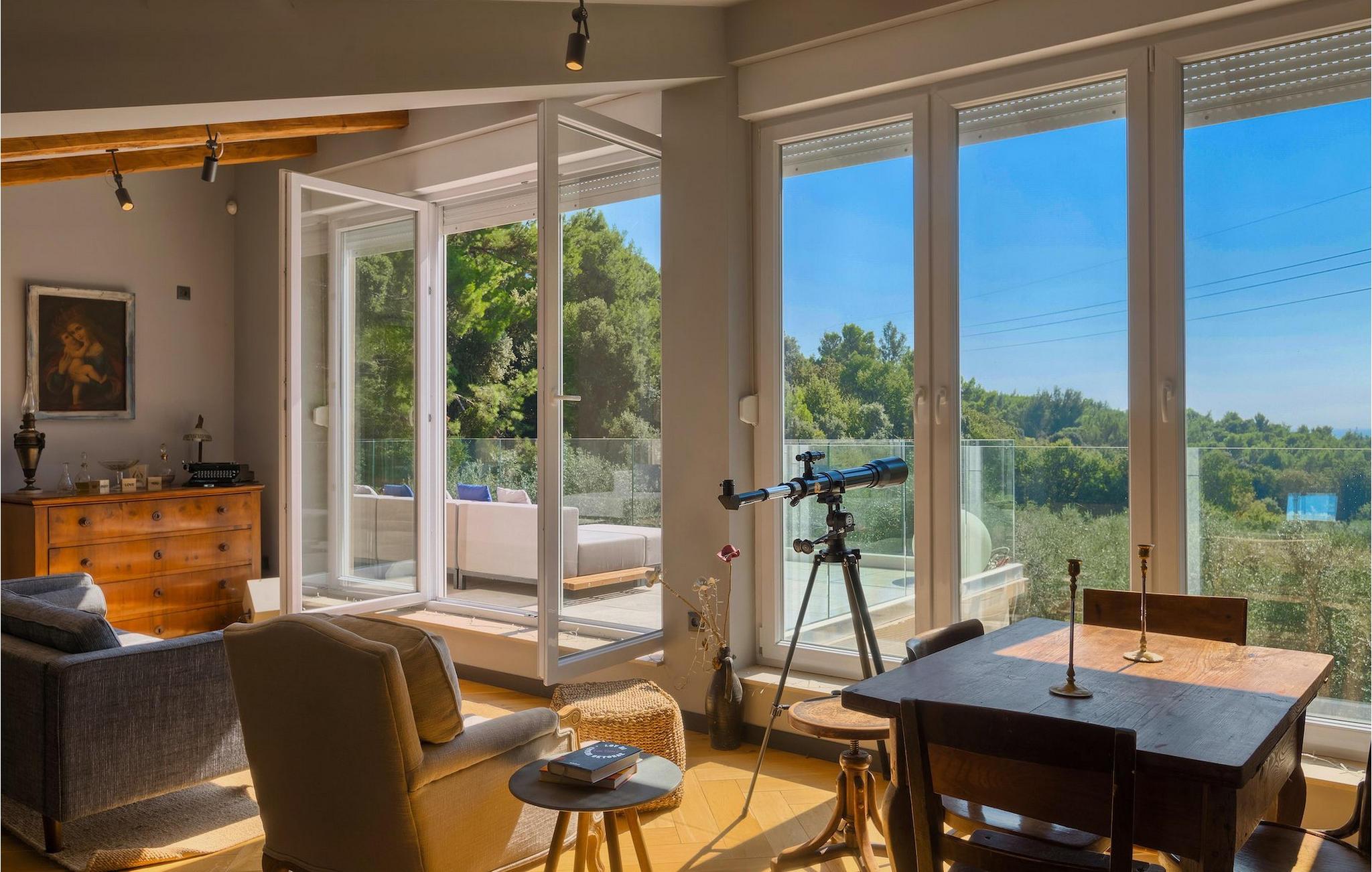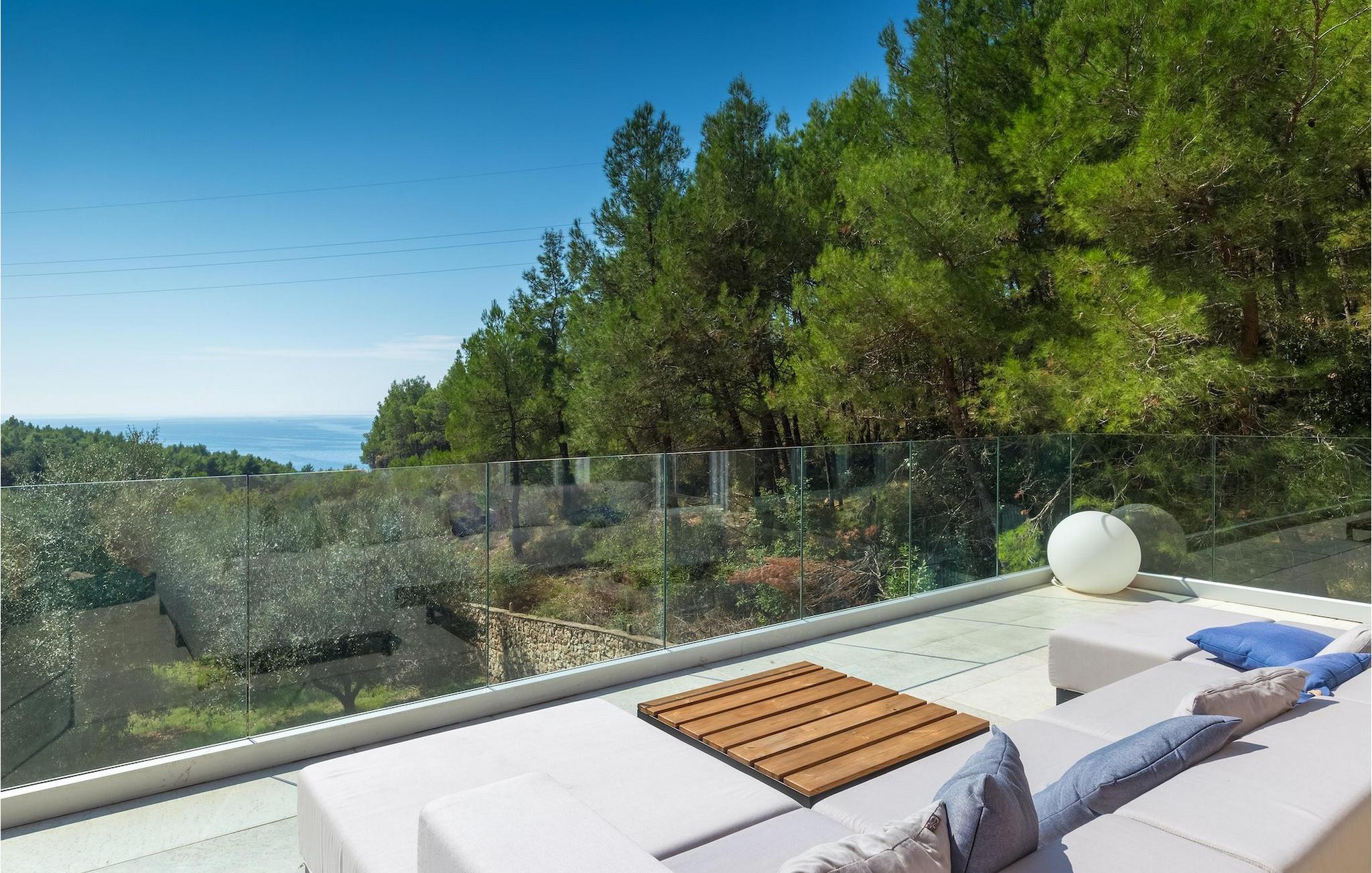 Der Wohnbereich im ersten Stock schaut zum Meer und bietet einen wunderschönen Panoramablick. Von hier aus gelangen Sie direkt auf die Außenterrasse mit einem Lounge-Bereich, ideal um ruhige, warme Sommernächte mit einem oder zwei Getränke zu genießen. Das Anwesen ist komplett umzäunt, umgeben von einem Wald und bietet somit viel Privatsphäre. Der Außenbereich ist eine wahre Oase für sich: Er bietet einen schönen privaten Pool, einen überdachten Essbereich für 8 Personen mit Grill und komfortable Lounge-Bereiche am Pool, die Sie sicherlich genießen werden. Alle Details in dieser geschmackvoll gestalteten und dekorierten Villa wurden von den Eigentümern aus verschiedenen Teilen der Welt sorgfältig ausgewählt, um den Gästen einen angenehmen Aufenthalt bieten zu können.