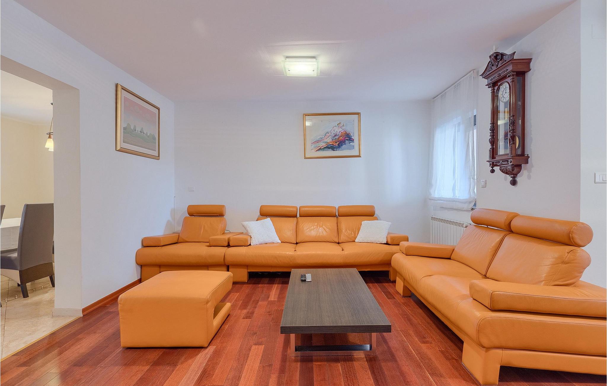 Eine Etage höher erreichen Sie die ersten drei Schlafzimmer. Eines der Schlafzimmer hat ein Doppelbett und die restlichen zwei Schlafzimmer haben jeweils ein großes Einzelbett. Außerdem befinden sich auf dieser Etage zwei Bäder, eine weitere Küche mit Essbereich sowie ein weiteres Wohnzimmer.