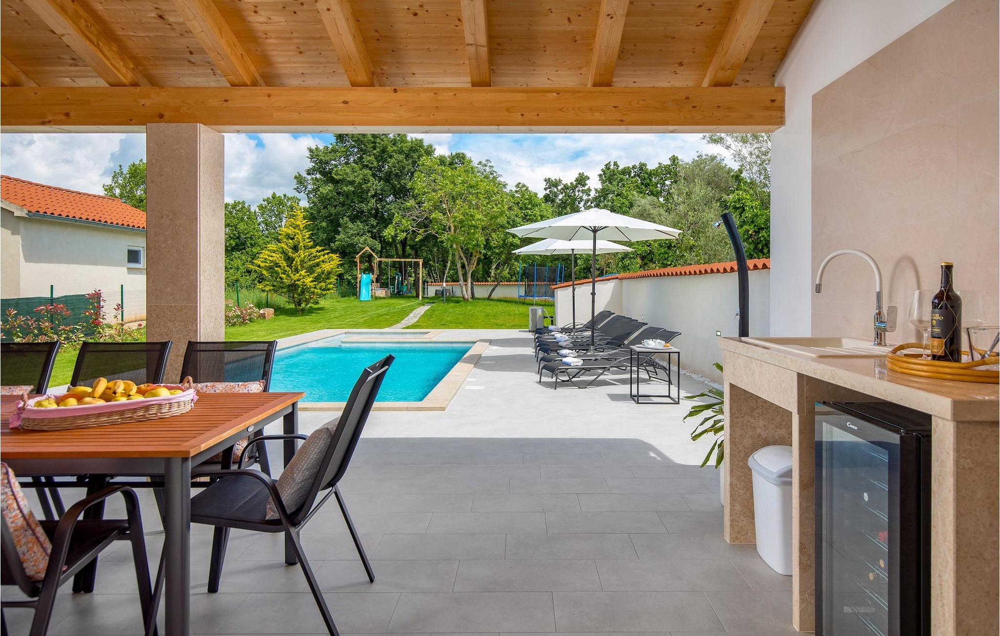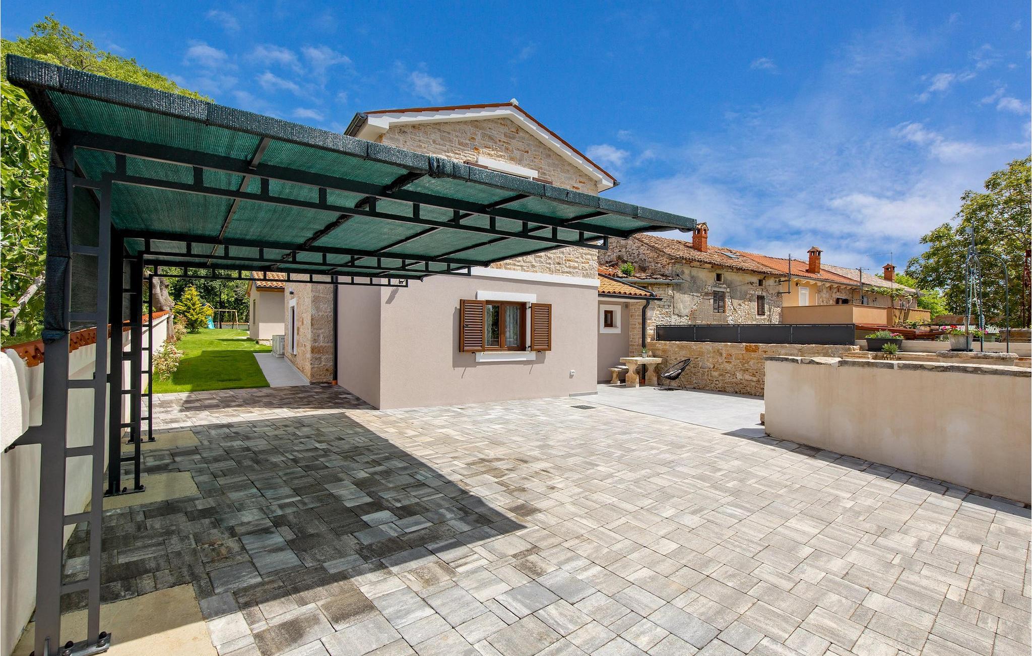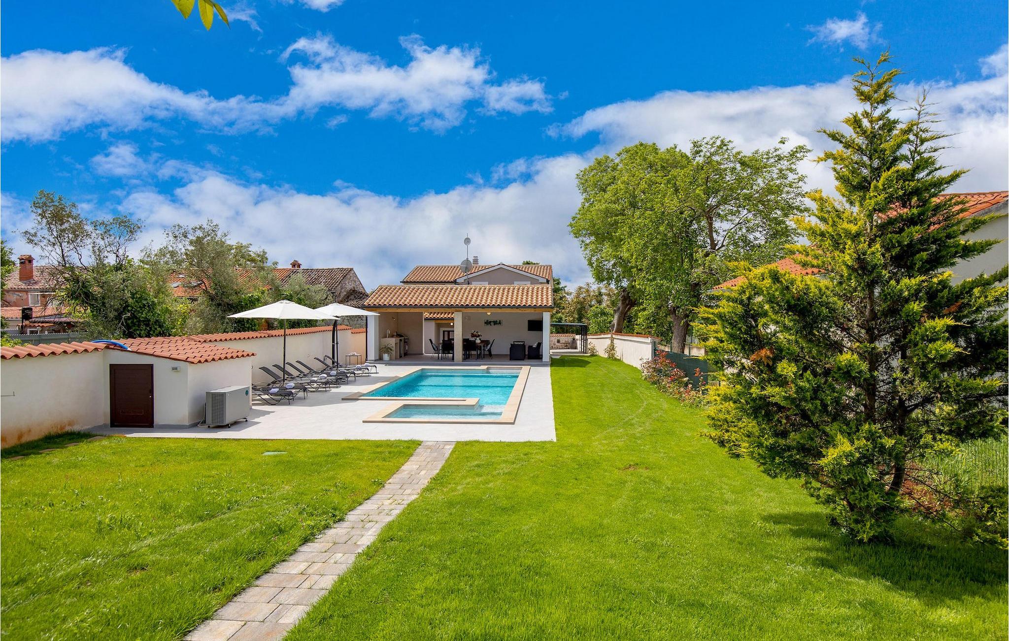 Die atemberaubende Villa Nola ist ein wahres istrisches Juwel und die perfekte Ferienvilla mit beheiztem Pool für eine 8-köpfige Familie in der Nähe des Meeres. Villa Nola bietet alles, was eine Familie oder eine Gruppe von Freunden für ihren Urlaub braucht. Im Außenbereich können Sie viele unterhaltsame und entspannende Stunden verbringen, indem Sie im Pool spielen, sich an heißen Sommertagen erfrischen, auf den Sonnenliegen die Sonnenstrahlen genießen und ein kaltes Getränk genießen, während die Kinder auf dem Spielplatz spielen. Sportliebhaber können auch im Urlaub fit bleiben, indem sie sich auf den Sportanlagen im Garten auspowern. Außerdem können Sie auf dem Gasgrill im Freien hausgemachte und traditionelle kroatische Gerichte zubereiten und im Essbereich im Freien herrlich speisen. Villa Nola verfügt außerdem über einen Hydromassage- und beheizten Pool mit einem Kinderpool mit geringerer Tiefe für sicheren und unbeschwerten Spaß für die Kinder. Auch der Innenbereich der Villa überzeugt durch ein modernes Design mit traditionellen Akzenten und Details. Im Erdgeschoss der Villa befanden sich ein Wohnzimmer, ein Esszimmer mit einer voll ausgestatteten Küche, ein Schlafzimmer mit Doppelbett, ein Badezimmer mit Dusche sowie eine separate Toilette im Waschraum. Die obere Etage besteht aus 3 weiteren Doppelzimmern, jedes mit eigenem Bad, SAT-TV und Klimaanlage. Mit einem Aufenthalt in der Villa Nola können Sie einen erholsamen und dennoch unterhaltsamen Urlaub mit Ihren Libesten verbringen. Zögern Sie also nicht, diese schöne istrische Villa zu buchen. Villa Nola befindet sich in einem kleinen Dorf namens Mali Vareski im östlichen Teil der Halbinsel Istrien. Die Villa bietet eine großartige Lage für Gäste, die gerne die Natur, atemberaubende Strände und schöne istrische Städte erkunden. Innerhalb einer kurzen Autofahrt erreichen Sie die beliebte Touristenstadt Pula, die für ihre historischen Denkmäler bekannt ist. Sie können an die Küste fahren und tolle Erinnerungen an der Adria sammeln und sich auch im Urlaub auf den vielen Radwegen in der Nähe in Form halten. Vergessen Sie nicht, die traditionelle istrische Küche zu genießen, indem Sie die süßen Tavernen in der Nähe besuchen und das probieren, wofür Istrien am berühmtesten ist, wie Olivenöl, Trüffel, Fuzi oder istrischen Prosciutto. Es gibt viele Möglichkeiten, den Charme Istriens bei einem Aufenthalt in der Villa Nola wirklich zu spüren, und die Lage bietet Ihnen so viele tolle Sehenswürdigkeiten und Dinge, die es zu erkunden gilt. Die Temperatur des beheizten Schwimmbades hängt von äußeren Faktoren, einschließlich der Wetterbedingungen, ab und daher kann die Wassertemperatur nicht garantiert werden.