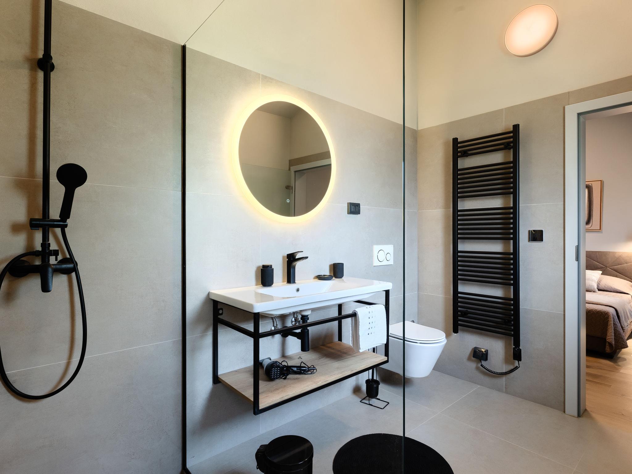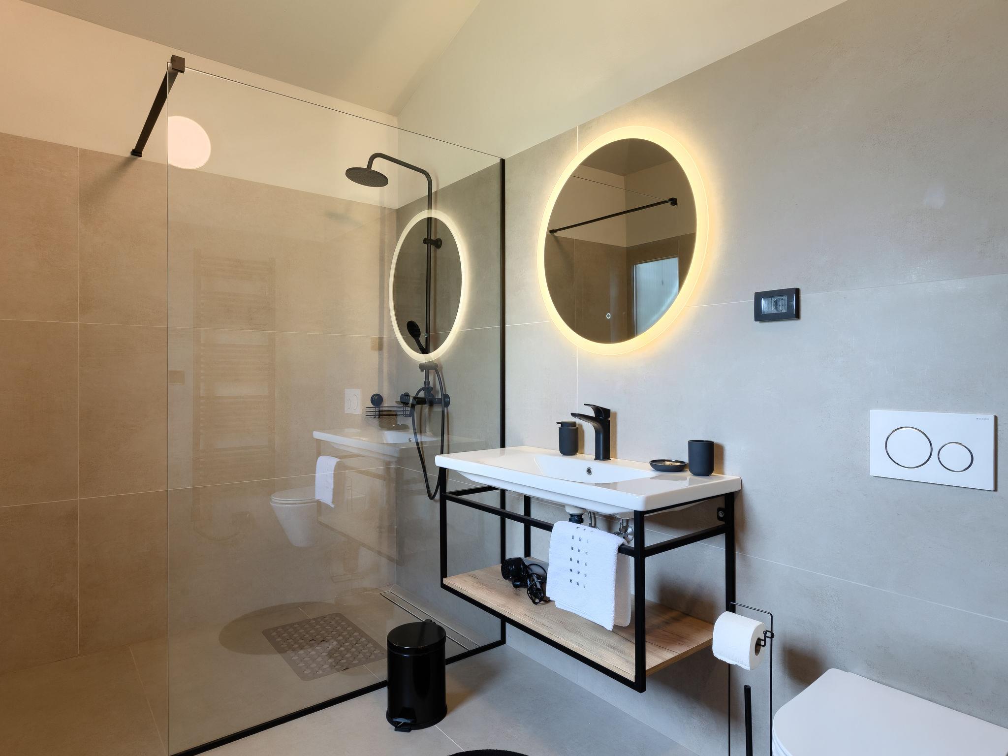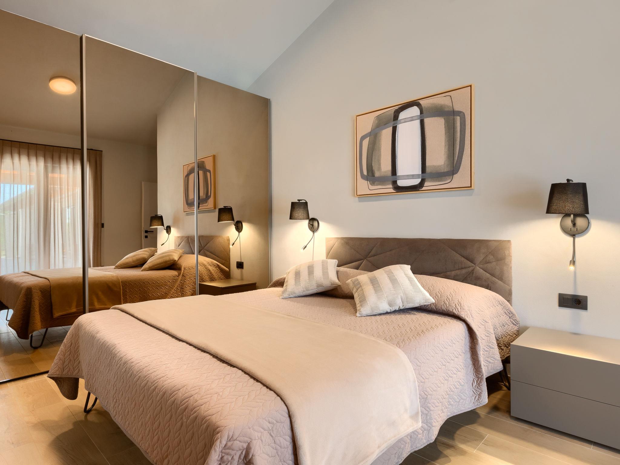 4-room villa 170 m2. Modern and luxurious furnishings: living/dining room with satellite TV and flat screen. Exit to the terrace, to the swimming pool. 3 rooms, each room with 1 double bed (160 cm, length 200 cm), shower/WC and satellite TV (flat screen). Open kitchen (oven, dishwasher, 4 ceramic glass hob hotplates, toaster, kettle, microwave, freezer, electric coffee machine). Exit to the terrace. Sep. WC. Floor heating, forced-air heating. Facilities: Internet (WiFi, free).