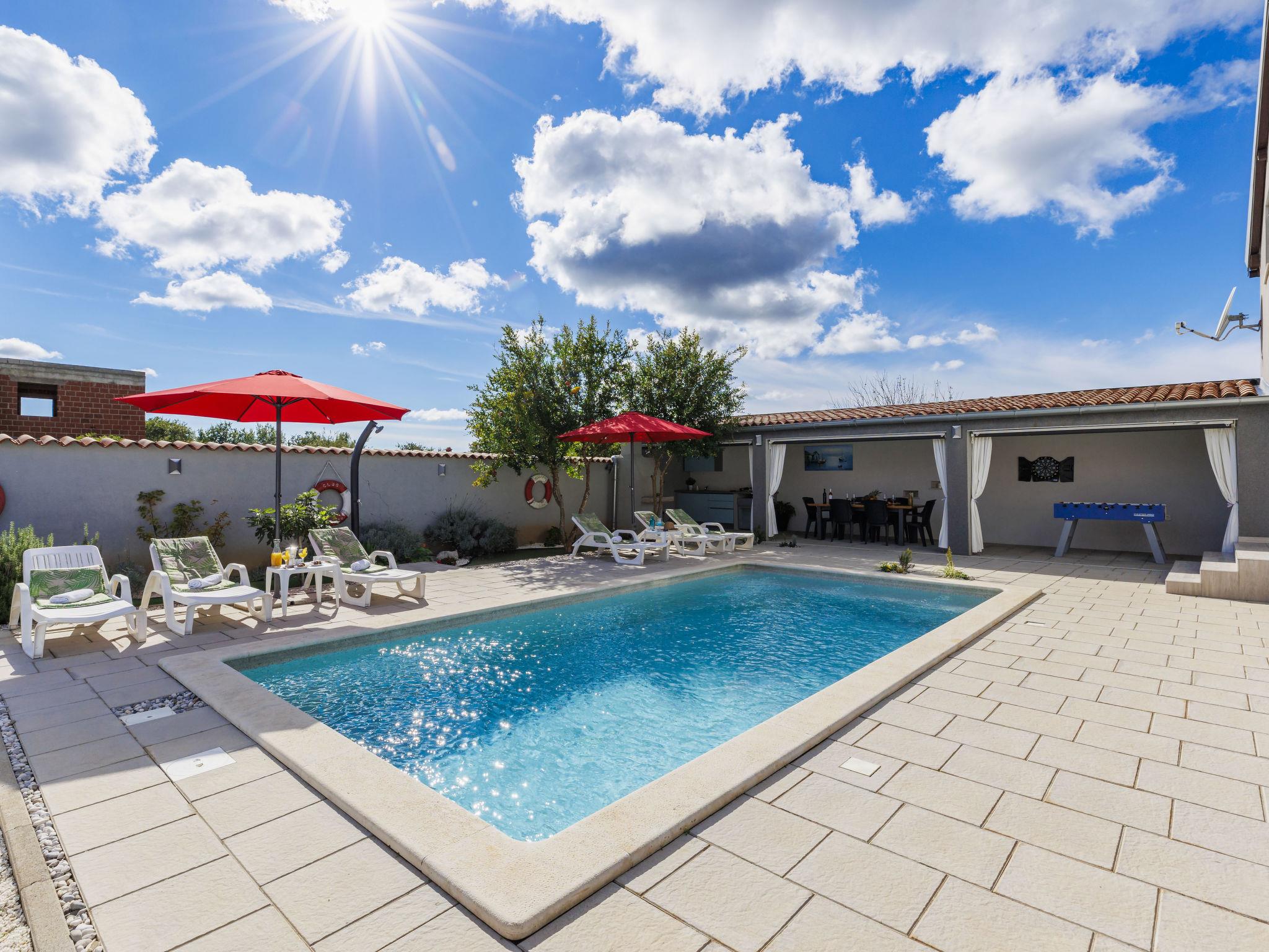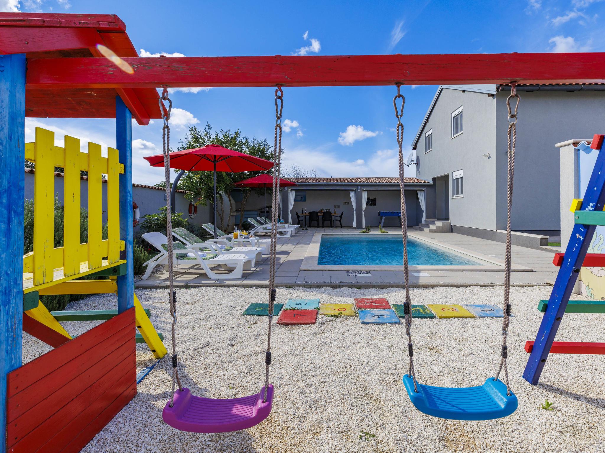 Beautiful 2-family house "David". In the hamlet Loborika 6.5 km from the centre of Pula, 6.5 km from the centre of Marcana, in a quiet, sunny position, 9 km from the sea. Private: property 250 m2 (fenced), small, beautiful garden with wildlife garden, swimming pool angular (7 x 3 m, 24 m2, depth 140 cm, seasonal availability: 27.Apr. - 28.Sep.) with internal staircase. Outdoor shower, table tennis, terrace (27 m2), barbecue, children's playground (swing). In the house: internet access. Parking at the house on the premises. Shop 1.5 km, supermarket 5 km, restaurant 1 km, café 1.5 km, bus stop 1.2 km, pebble beach 12 km. Tennis 15 km, riding stable 5 km, walking paths from the house 100 m, cycle lane 150 m. Nearby attractions: Amphitheater 8.5 km. Available: darts (included). Outdoor kitchen (2 ceramic glass hob hotplates, fridge).