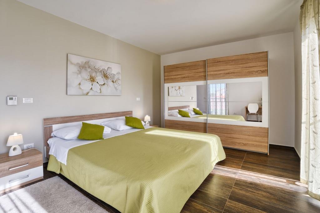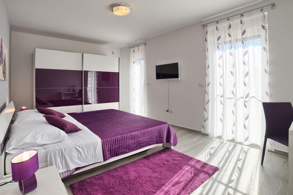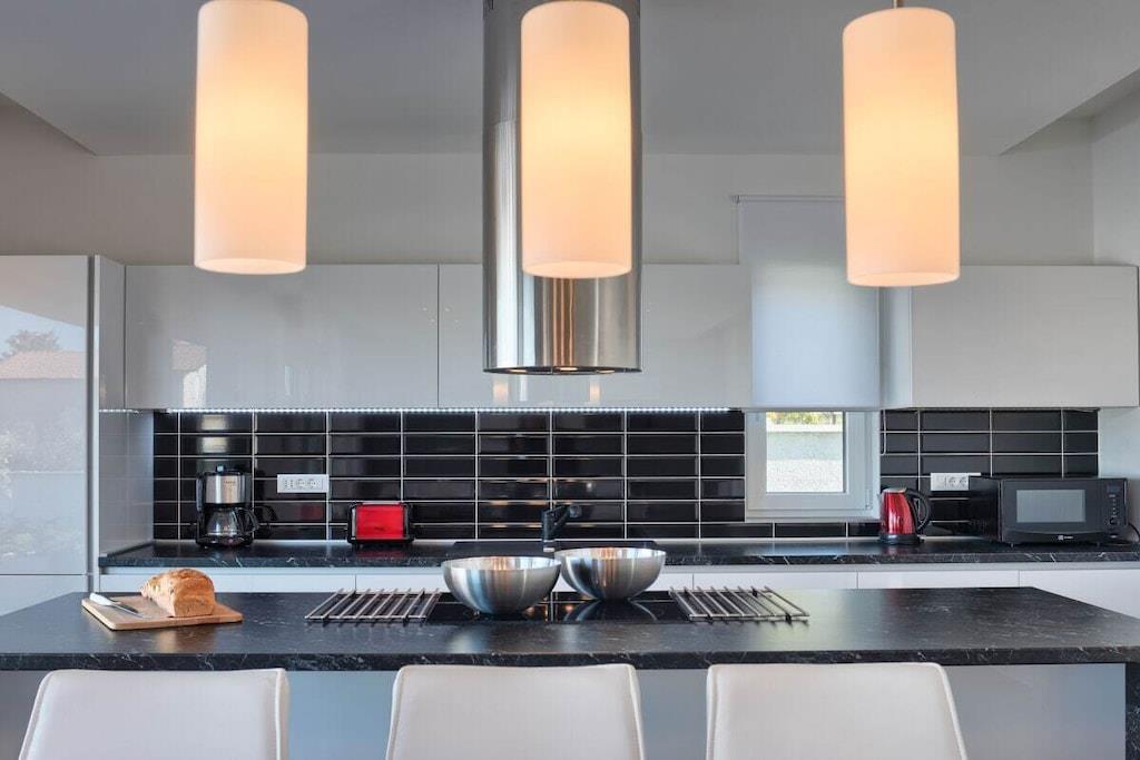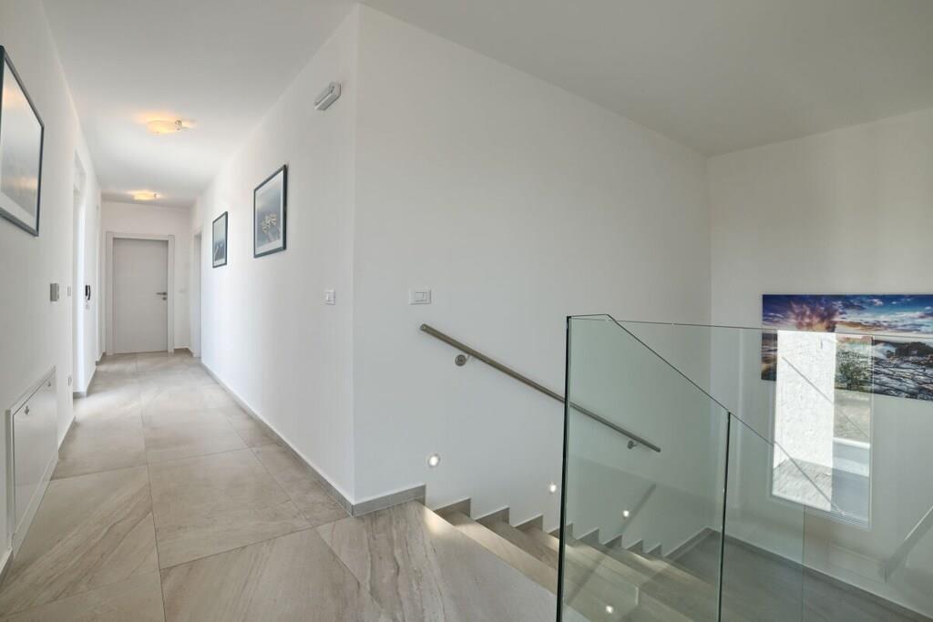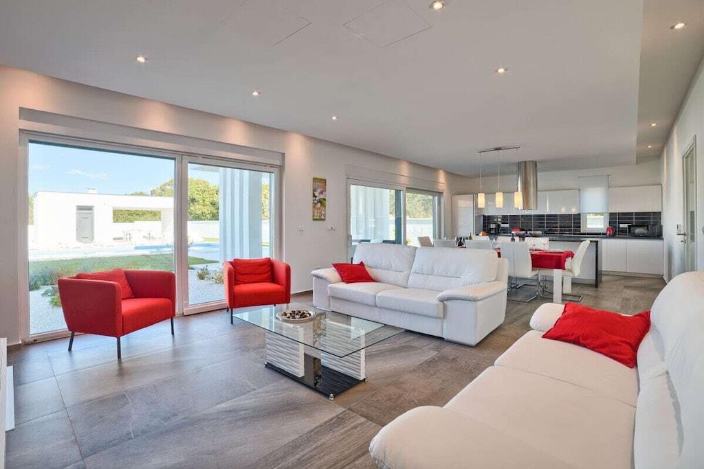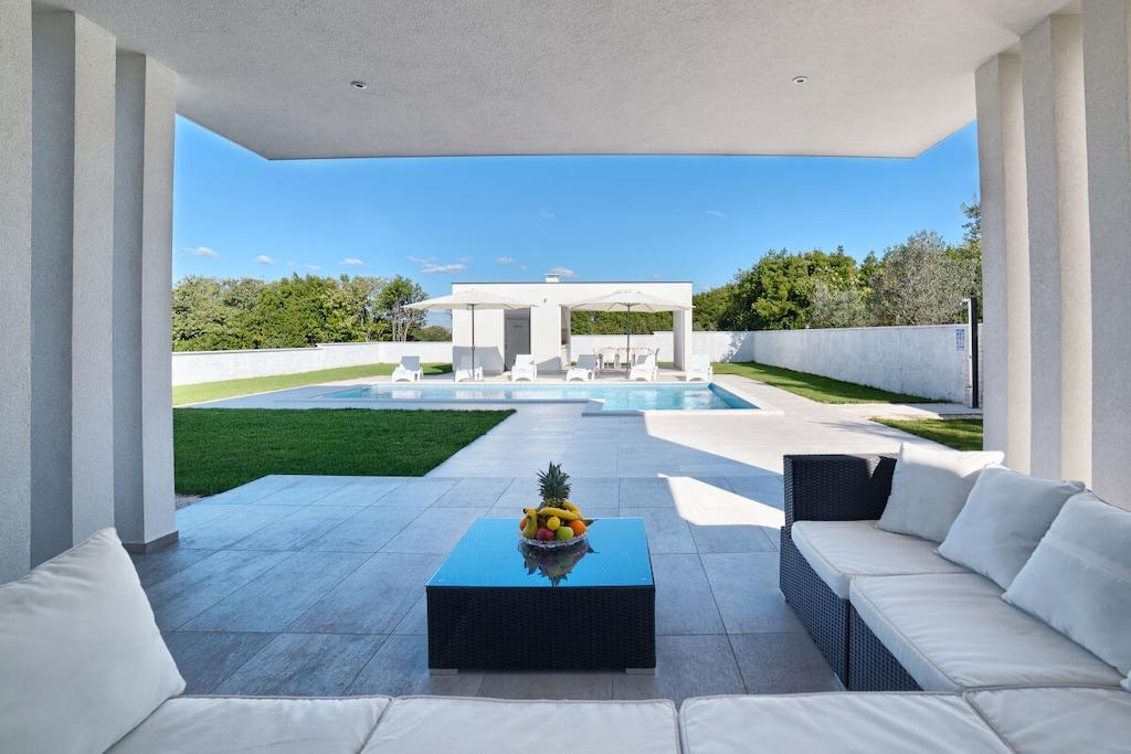 Villa Lungera, a modernly designed two-level villa with a heated pool and outdoor kitchen. The villa has four bedrooms, each with air conditioning and a bathroom, comfortably accommodating eight people. The kitchen is fully equipped and connected by a terrace with a large table and barbecue. The pool is surrounded by a lush garden and olive trees.