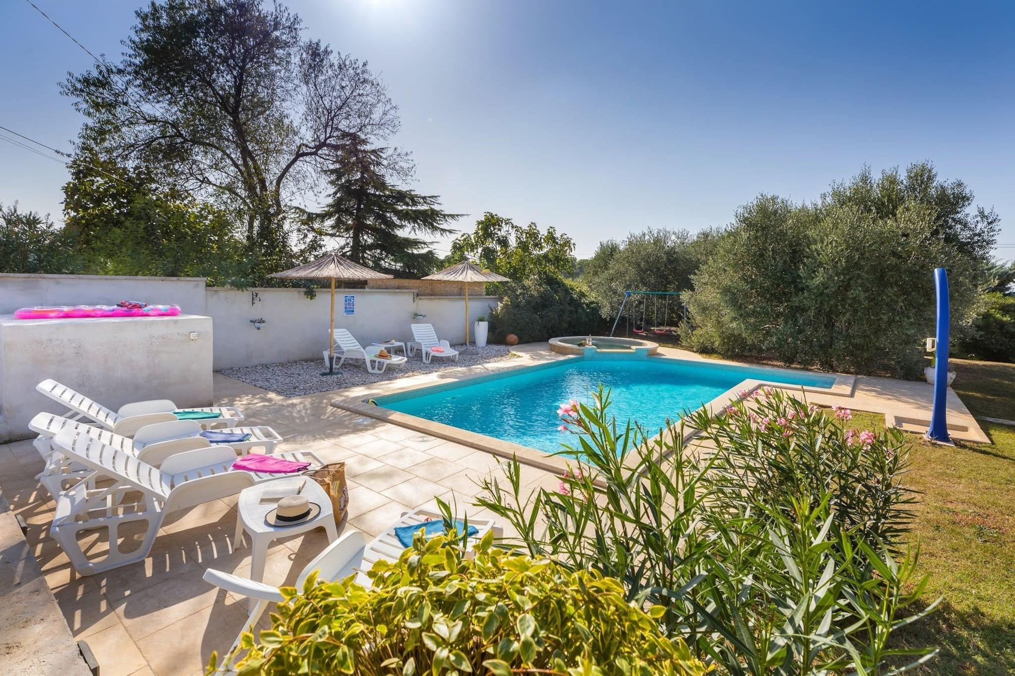 This property, along with its relaxing and private setting, offers a comfortable stay for up to six guests. It features three bedrooms, including two with queen-size beds and one with two single beds. The living space is equipped with a sofa, and a balcony offers outdoor relaxation. The property is family-friendly, providing a cot/crib upon request. It also includes free Wi-Fi, air conditioning, private parking, and a garden area. A private swimming pool and jacuzzi provide relaxation, while an outdoor barbecue grill allows for dining al fresco. Pets are not allowed, and parties or events are not permitted on the premises. Located in the historical city of Pula, this vacation home is surrounded by ancient Roman monuments, including the Triumphal Arch of Sergius and the Temple of Augustus. Guests can explore the city’s rich history and visit the famous Amphitheater. For those seeking outdoor activities, the nearby beaches, such as Verudela, are only 5 km away, while hiking and biking routes are easily accessible. The property is well-connected by public transport with bus stops nearby, and the nearest airport is Pula Airport, just a short drive away. The property includes a fully equipped kitchen, with appliances such as a refrigerator, oven, microwave, and coffee machine for convenience. There are two bathrooms, one with a bathtub and one with a shower, along with a hydro-massage bath for added relaxation. Additional features include a washing machine, a table tennis table, a flat-screen TV with satellite channels, and an outdoor shower.