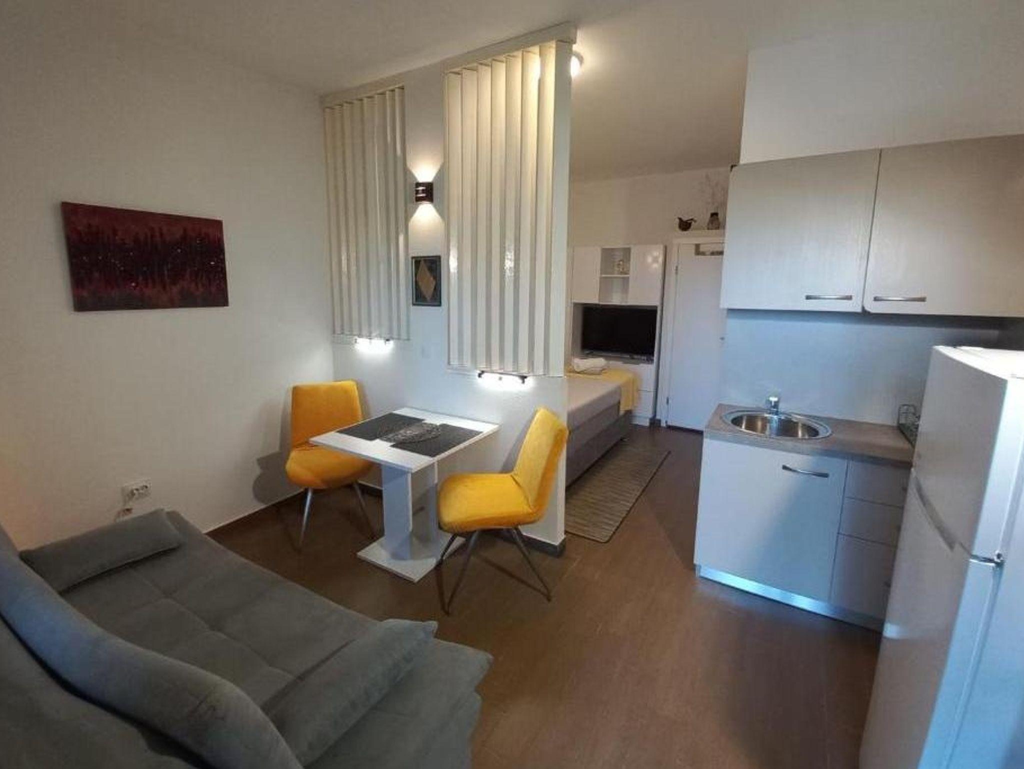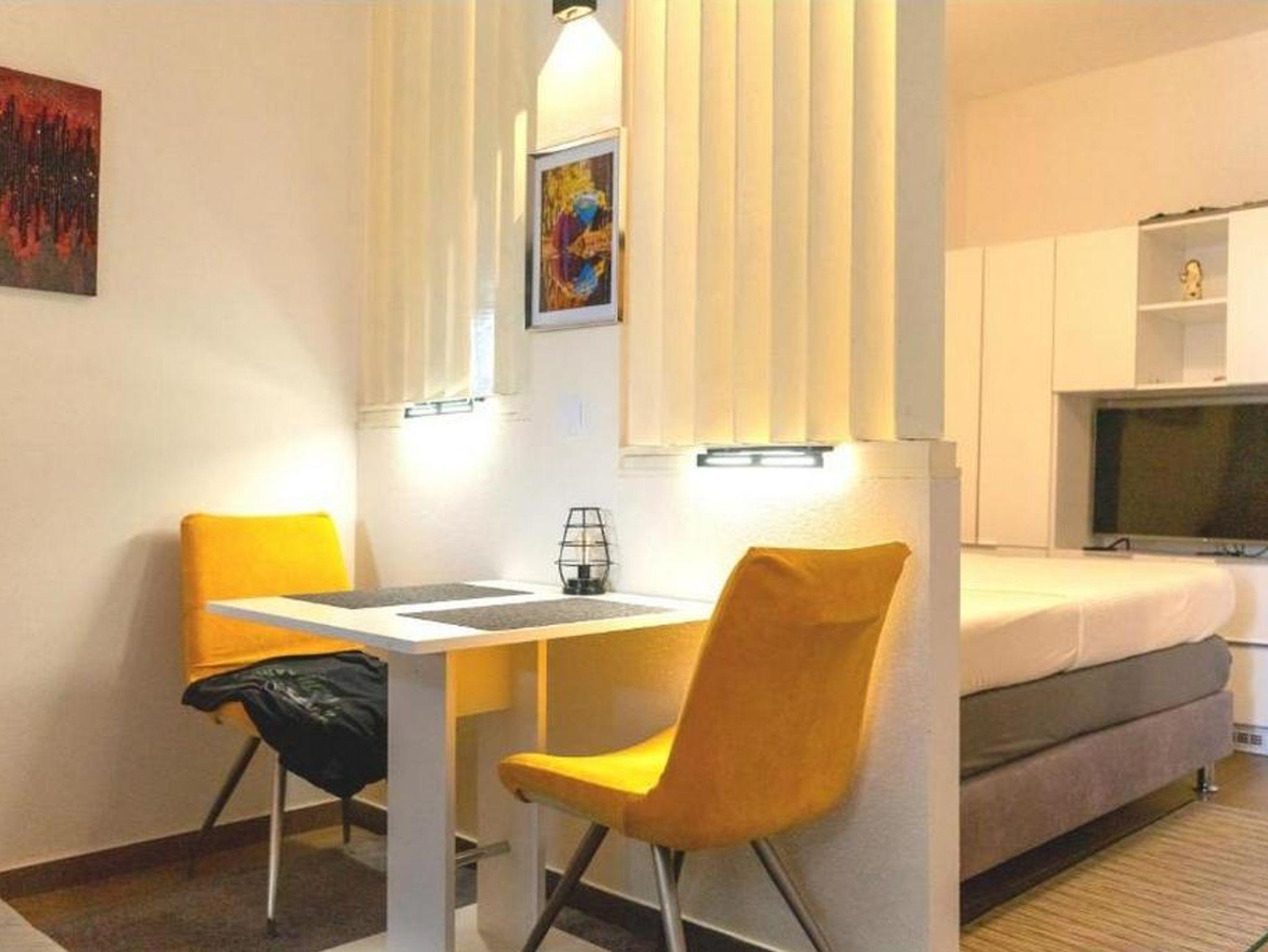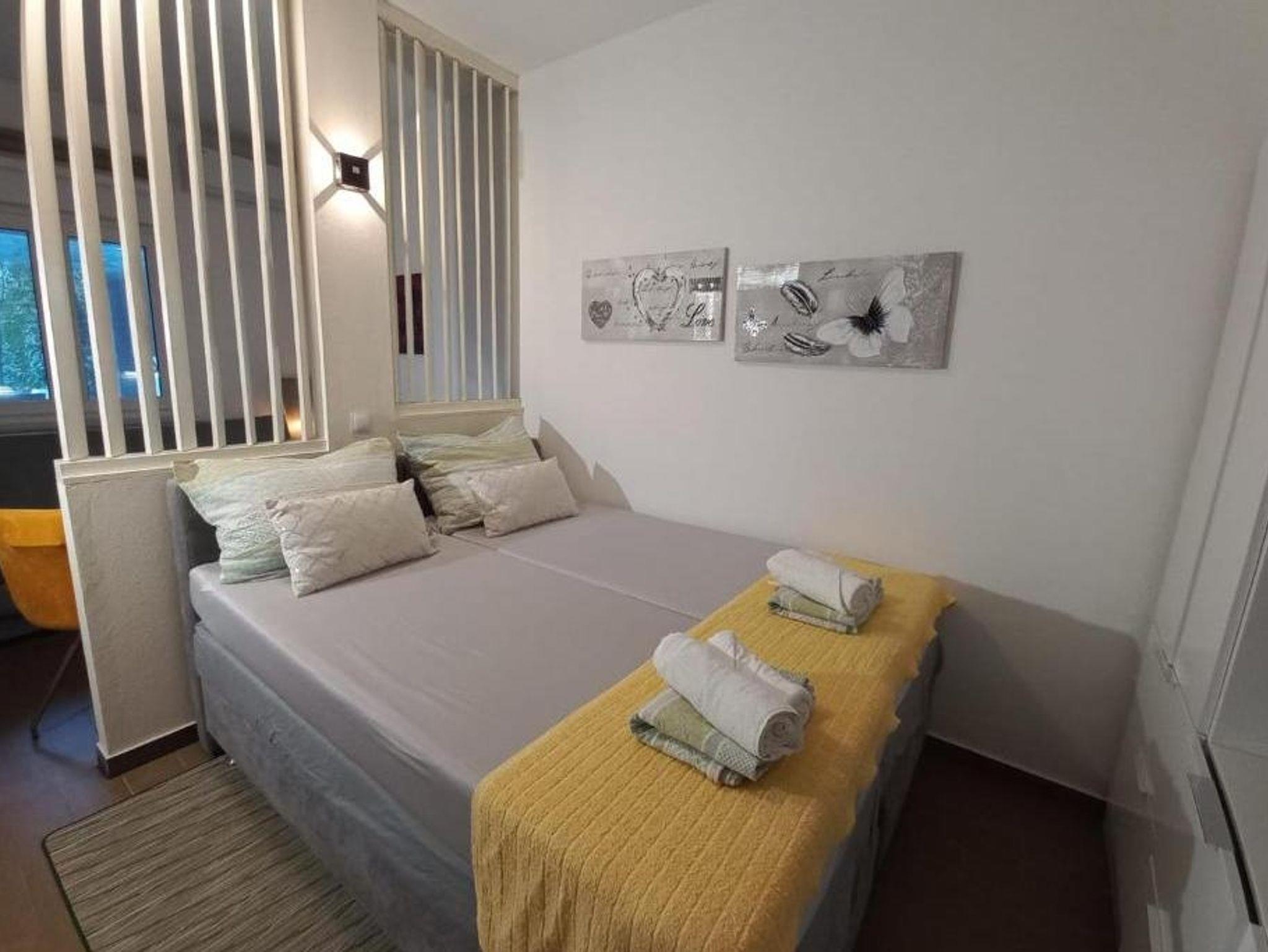 Studio bietet Platz für 2 Gäste. Die Betten sind in Schlafzimmern, die es 1 gibt, innerhalb einer Gesamtfläche von 19m2, angeordnet. Die Gäste haben eine eigene Terrasse zur Verfügung, auf der sie in warmen Sommernächten genießen können. Es ist erlaubt, Speisen auf dem Gemeinschafts-Grill vorzubereiten. Während ihres Aufenthalts können Gäste das gemeinsam zur Nutzung stehende Schwimmbad benutzen. Durch die Terrasse der gebuchten Unterkunftseinheit gehen auch andere Gäste oder Vermieter. IM PREIS INBEGRIFFEN: Kurtaxe, Endreinigung, Klimatisierung, Pool, Parkplatz, Internet, Bügeleisen, Föhn. VERBINDLICHE ZUSÄTZLICHE KOSTEN: Aufzahlung für Kurzaufenthalte (prozentualer Zuschlag pro Nächtigungsanzahl: 30% - 1, 20% - 2, 10% - 3). Die Verfügbarkeit zusätzlicher Dienstleistungen in Ihrem reservierten Termin und die Preise derselben (falls nicht aufgeführt) müssen im Voraus überprüft werden. Zusätzliche Dienstleistungen die in der Zahlungsaufforderung nicht aufgeführt sind werden direkt beim Vermieter bezahlt, angenommen der Gast nutzt auch diese.