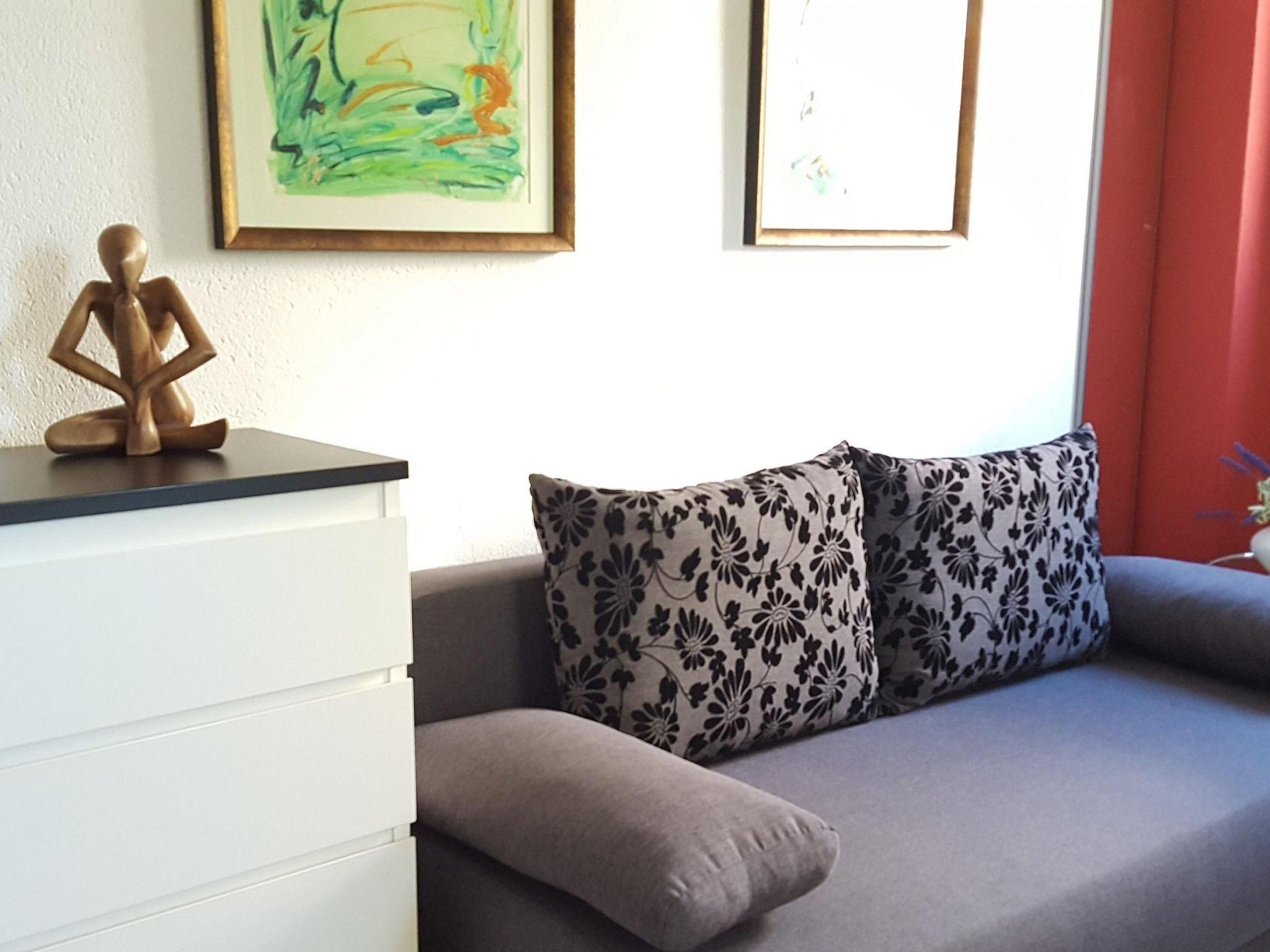 Inside the flat, you will find well thought-out furnishings that leave nothing to be desired. The bedroom is furnished with a comfortable double bed (2 m × 1.60 m), while an additional single bed and a sofa bed offer further sleeping options. The flat has a bathroom with shower, a fully equipped kitchen with an espresso pot, filter coffee machine and kettle. In addition, air conditioning in all rooms ensures pleasant temperatures at any time of year. A washing machine and tumble dryer for communal use in the building round off the offer.