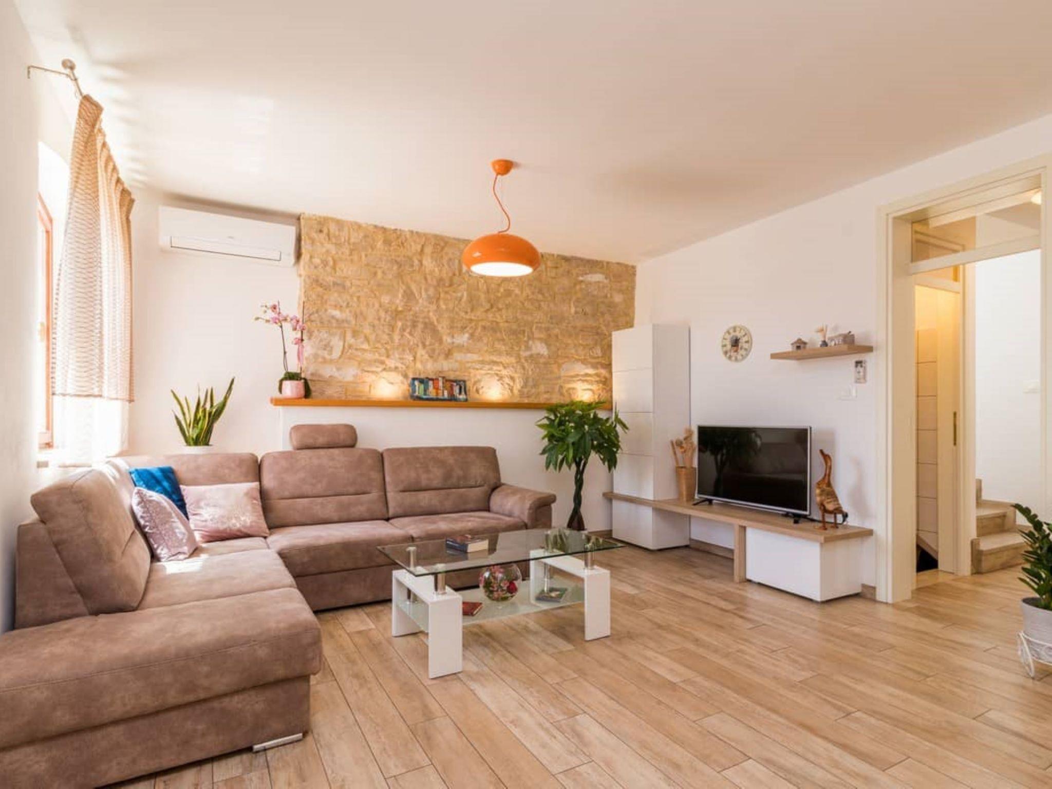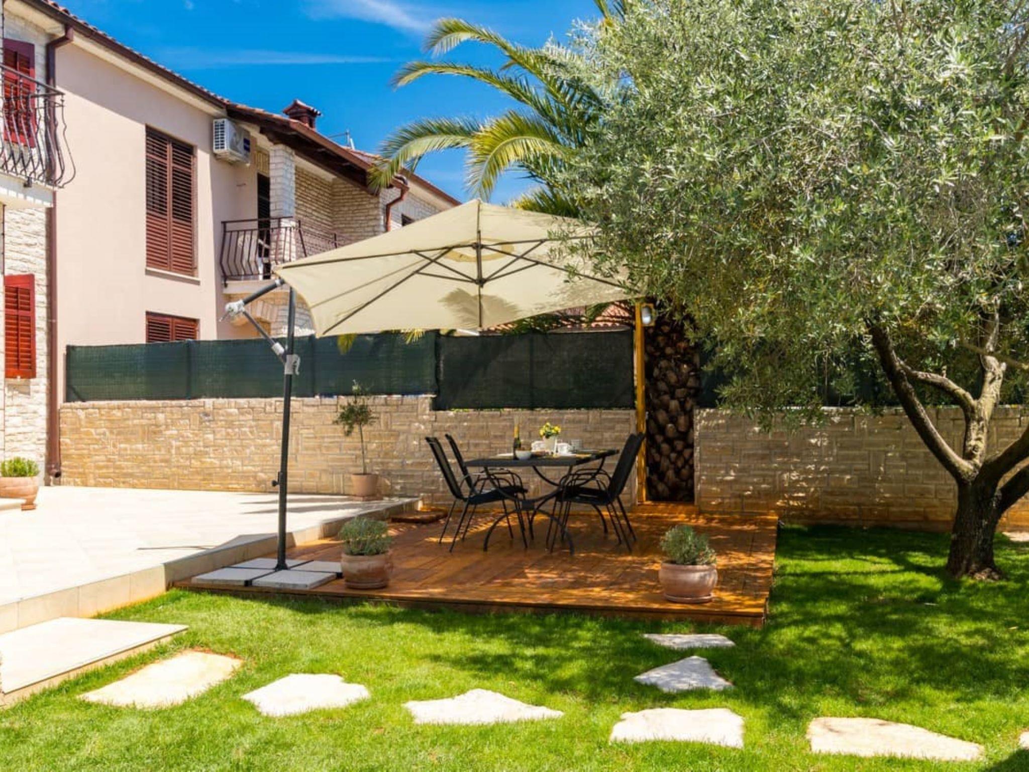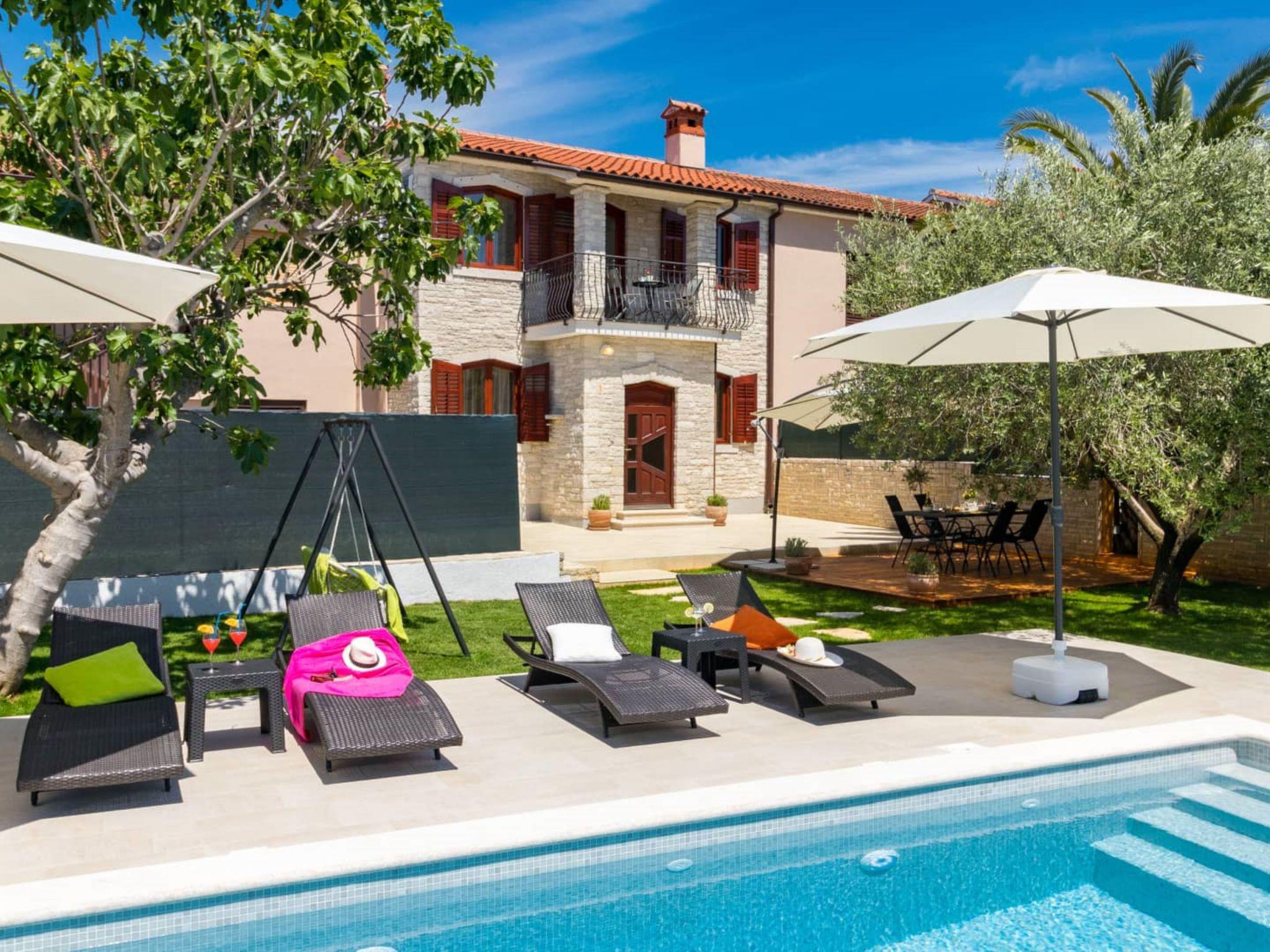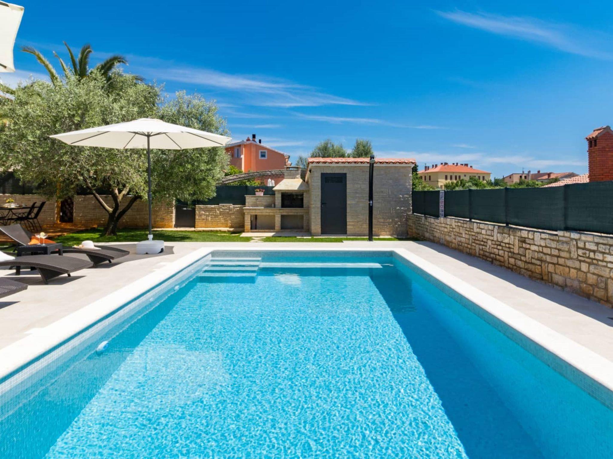 Galižana 5 km from Pula: Beautiful terraced house "Villa Pietra", 2 storeys. 300 m from the centre of Galižana, 5.5 km from the centre of Fažana, in a sunny position, 5.5 km from the sea. Private: property 350 m2 (fenced), beautiful garden with lawn and wildlife garden, swimming pool angular (26 m2, depth 140 cm, seasonal availability: 01.Apr. - 01.Nov.). Outdoor shower, terrace (15 m2), garden furniture, barbecue (swing). In the house: internet access, washing machine. Parking (for 2 cars) at the house on the premises. Shop 100 m, grocery 400 m, supermarket 4 km, restaurant 4.5 km, bus stop 1 km, pebble beach 5.5 km. Surf school 5.5 km, tennis 4.5 km, riding stable 7 km, walking paths from the house 100 m, cycle lane 150 m.