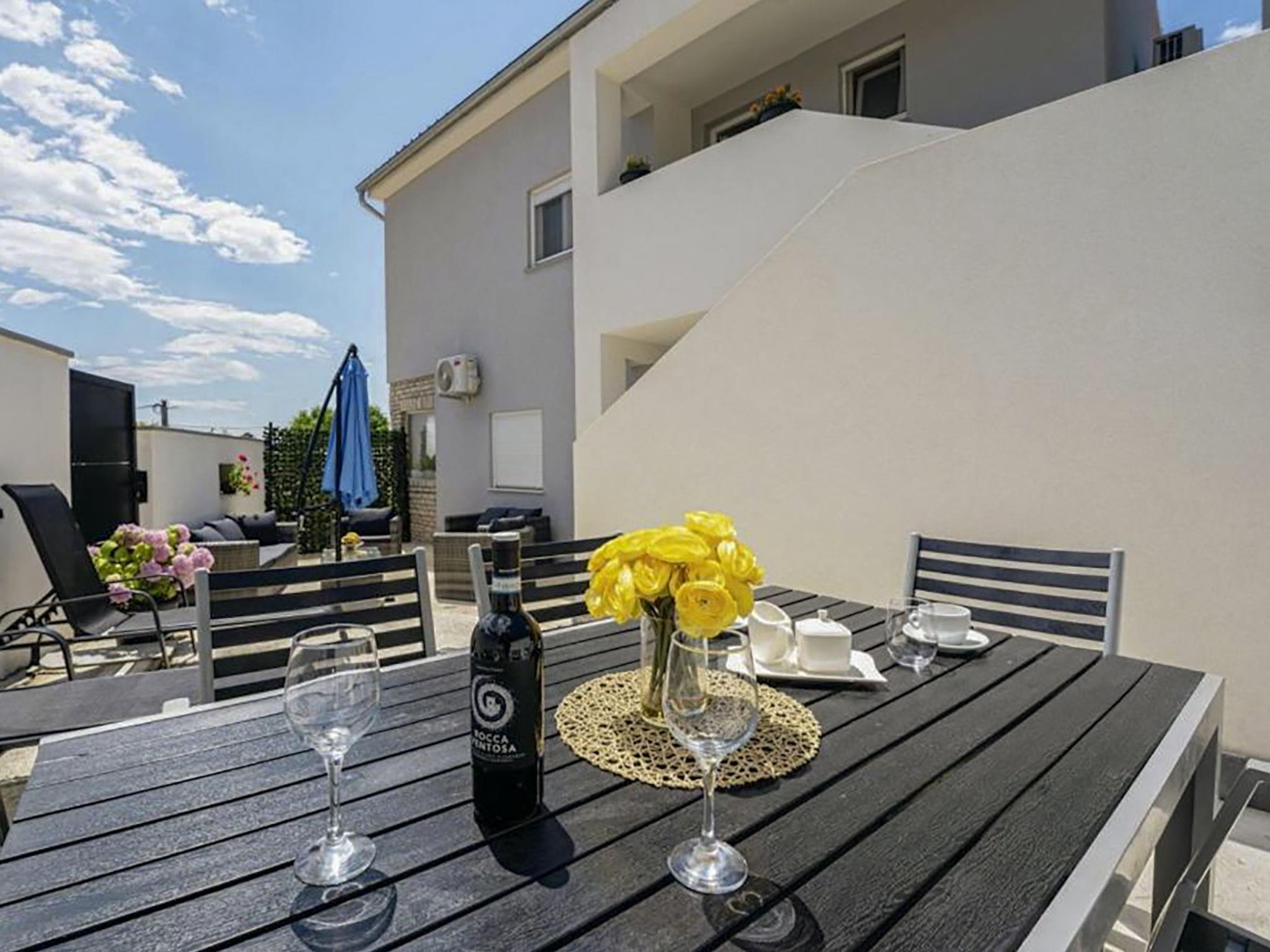 4-room apartment 100 m2 on 1st floor. Beautiful furnishings: living/dining room with satellite TV, flat screen and air conditioning. Exit to the terrace. 1 room with 1 french bed (160 cm, length 200 cm). 1 room with 2 beds (80 cm, length 200 cm). 1 room with 1 double bed (2 x 100 cm, length 200 cm), shower/WC and air conditioning. Open kitchen (oven, dishwasher, 4 ceramic glass hob hotplates, kettle, freezer, electric coffee machine). Shower/WC. No heating option. Terrace 12 m2, roofed. Terrace furniture, barbecue (portable), deck chairs. Beautiful view of the sea. Facilities: washing machine, hair dryer. Internet (WiFi, free). Please note: private entrance.