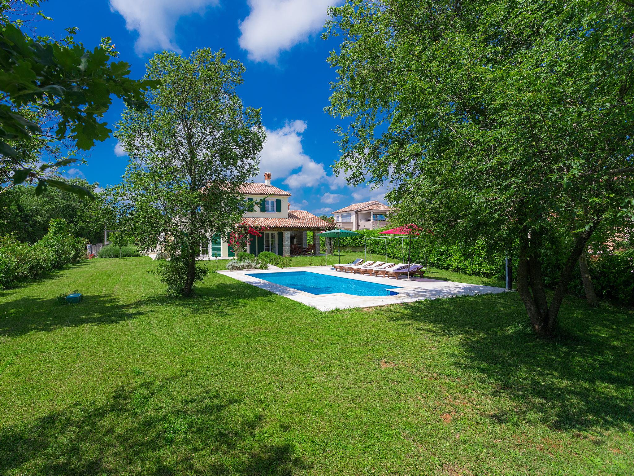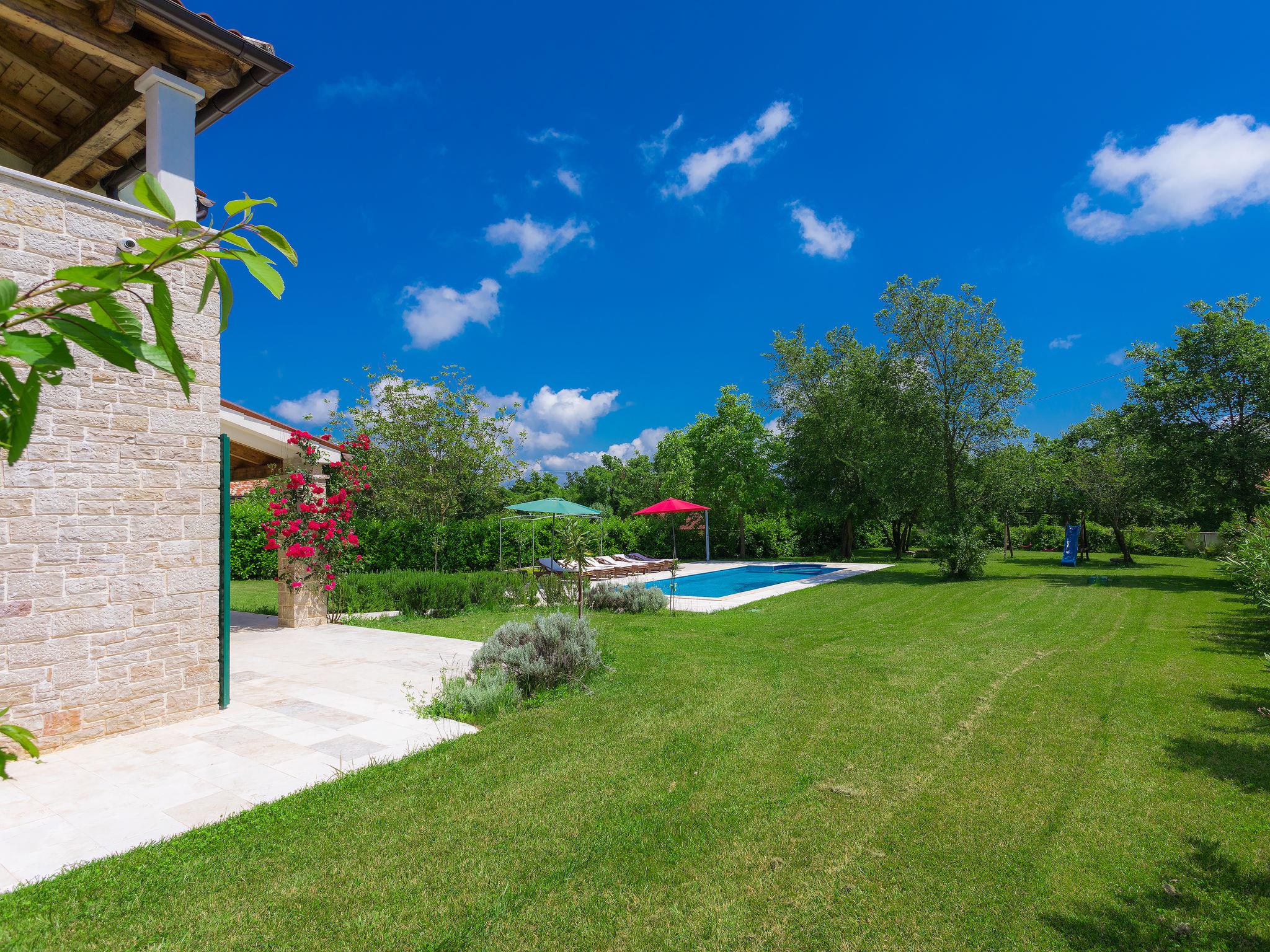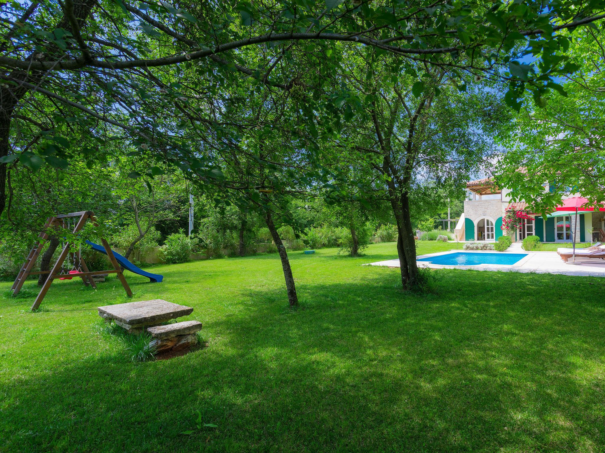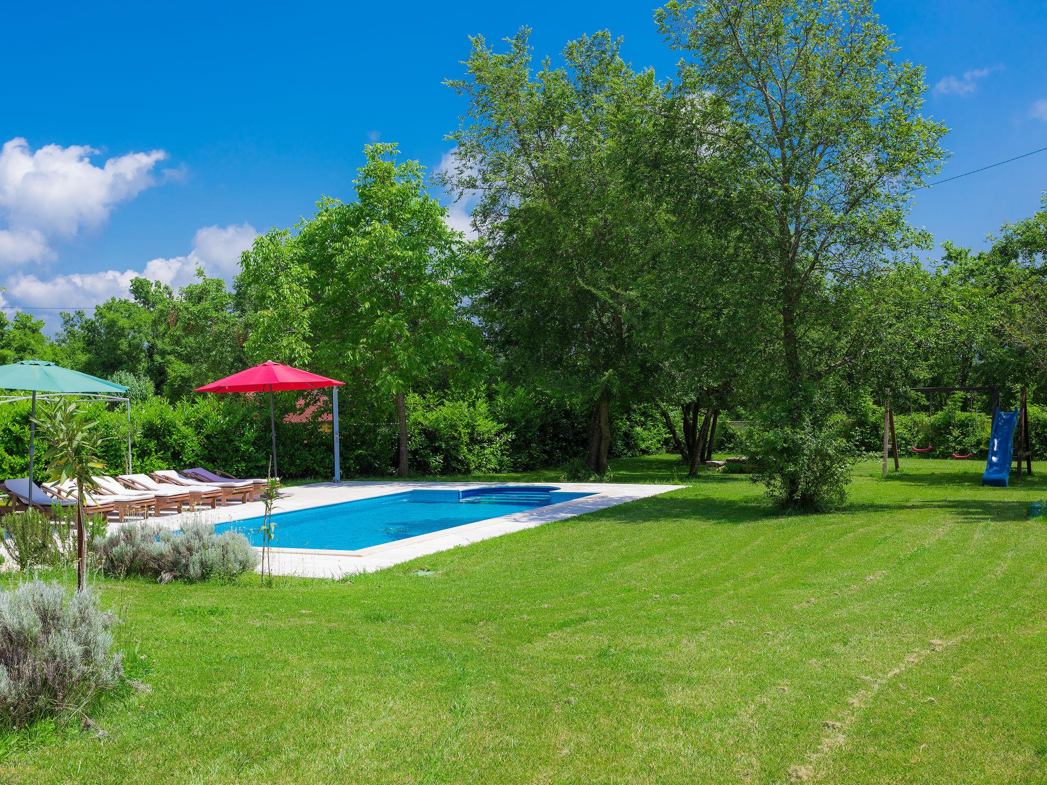 Krnica 22 km from Pula: Villa "Bella", 2 storeys. In the hamlet Hreljici 8 km from the centre of Marcana, 18 km from the centre of Pula, 6 km from the sea, 6 km from the beach. Private: property 1'400 m2 (fenced), beautiful, well-kept garden with lawn and wildlife garden, swimming pool angular (8 x 4 m, 32 m2, depth 140 cm, seasonal availability: 01.May. - 26.Oct.). Outdoor shower, barbecue, children's playground (slide, swing). In the house: internet access, air conditioning, washing machine. Parking (for 4 cars) at the house on the premises. Shop 3 km, restaurant 500 m, bus stop 650 m, pebble beach 6 km, rocky beach 6 km. Riding stable 2 km, walking paths from the house 1 km, cycle lane 1 km. Please note: suitable for families. Groups of teenagers on request only.