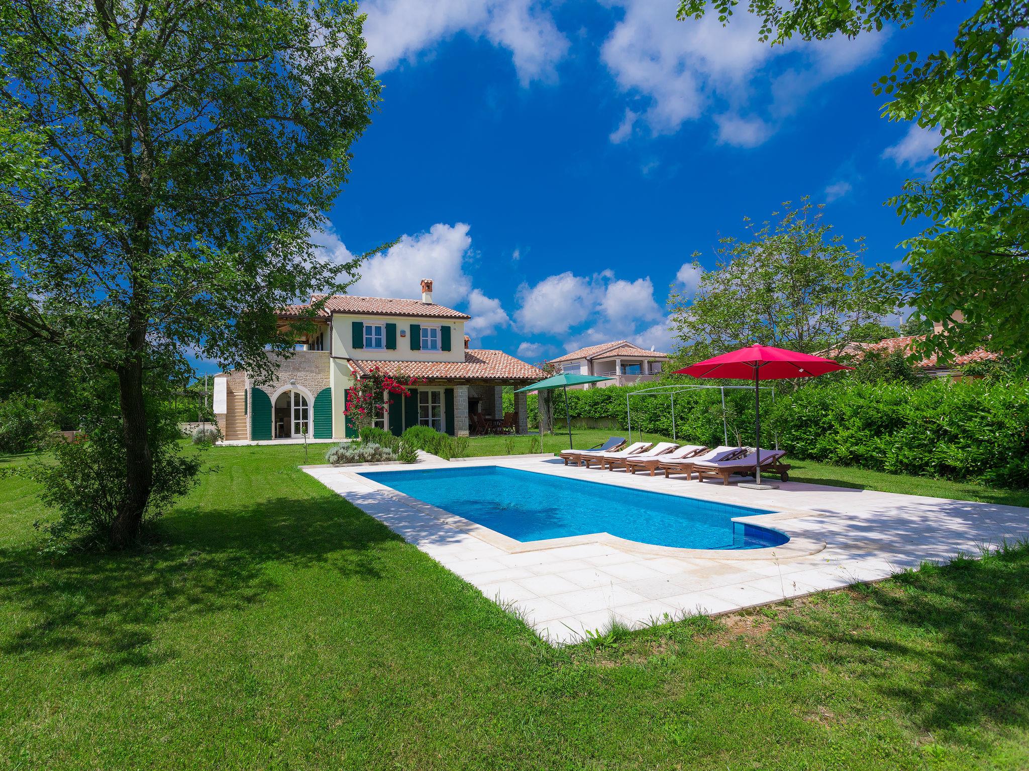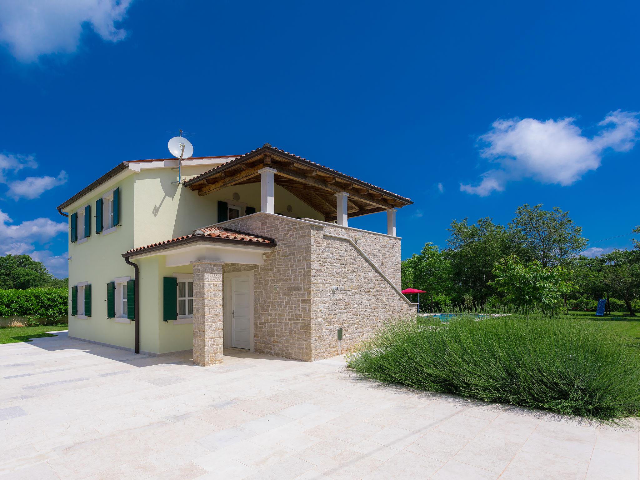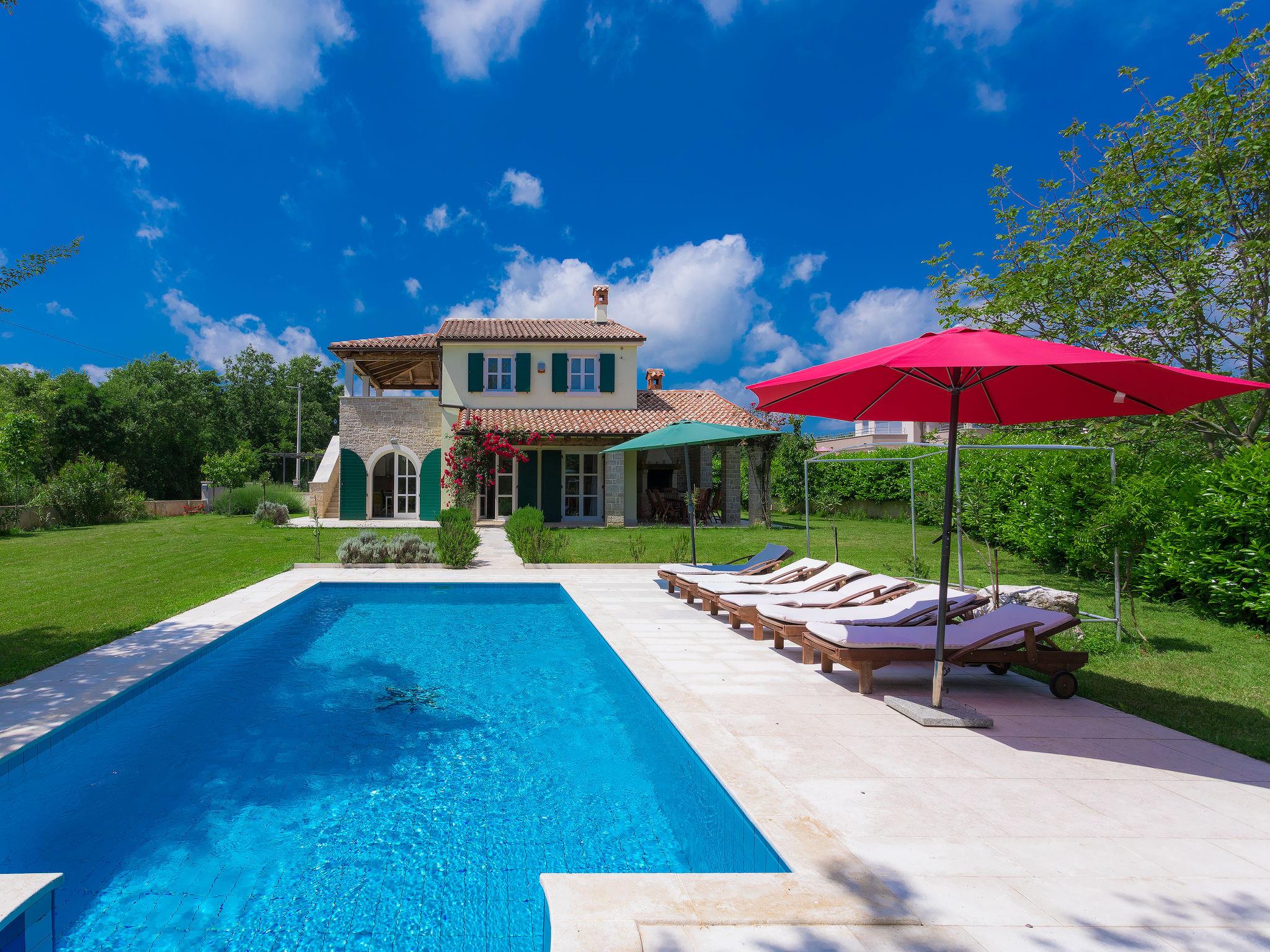 Krnica 22 km from Pula: Villa "Bella", 2 storeys. In the hamlet Hreljici 8 km from the centre of Marcana, 18 km from the centre of Pula, 6 km from the sea, 6 km from the beach. Private: property 1'400 m2 (fenced), beautiful, well-kept garden with lawn and wildlife garden, swimming pool angular (8 x 4 m, 32 m2, depth 140 cm, seasonal availability: 01.May. - 26.Oct.). Outdoor shower, barbecue, children's playground (slide, swing). In the house: internet access, air conditioning, washing machine. Parking (for 4 cars) at the house on the premises. Shop 3 km, restaurant 500 m, bus stop 650 m, pebble beach 6 km, rocky beach 6 km. Riding stable 2 km, walking paths from the house 1 km, cycle lane 1 km. Please note: suitable for families. Groups of teenagers on request only.