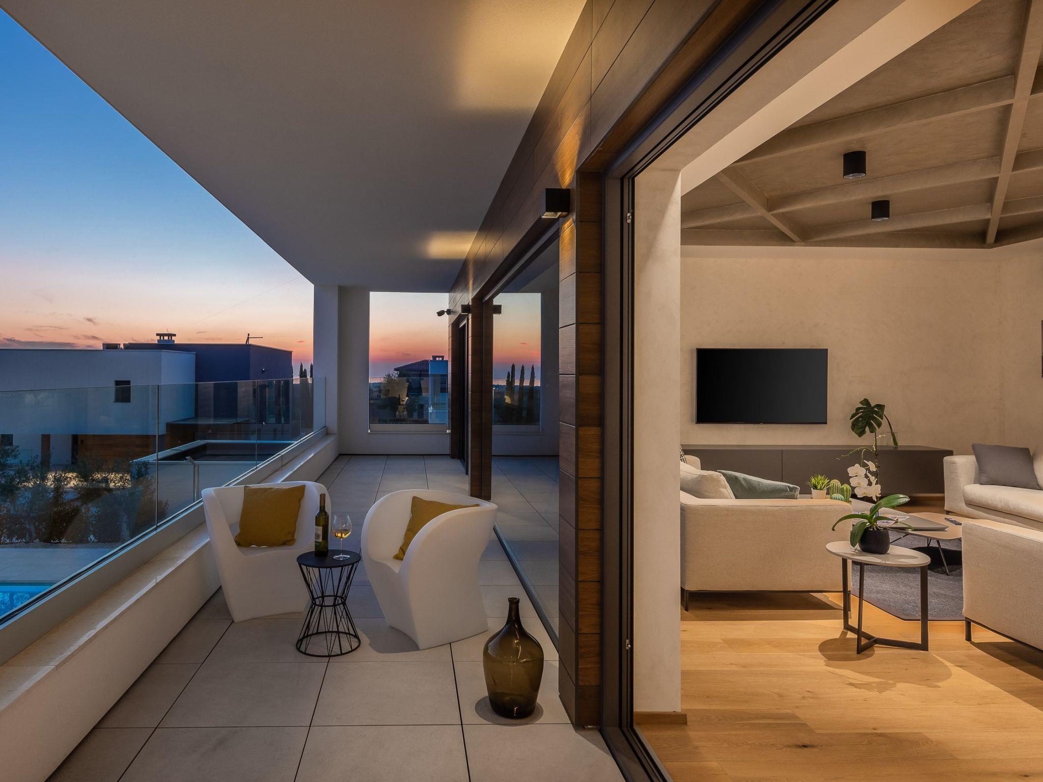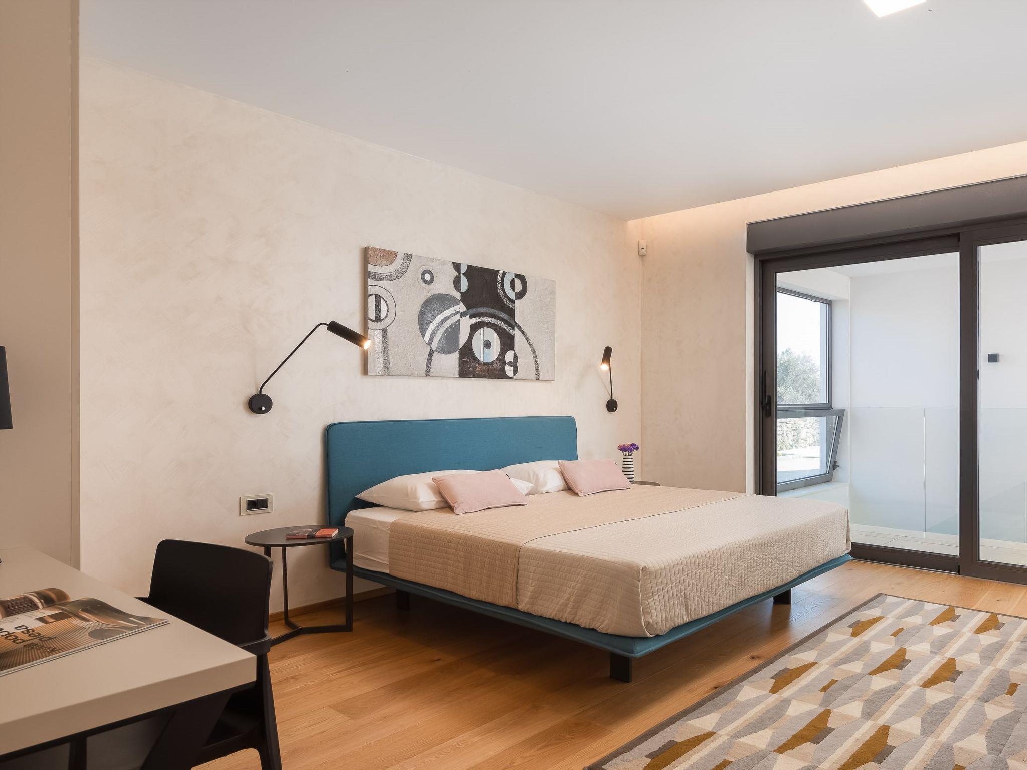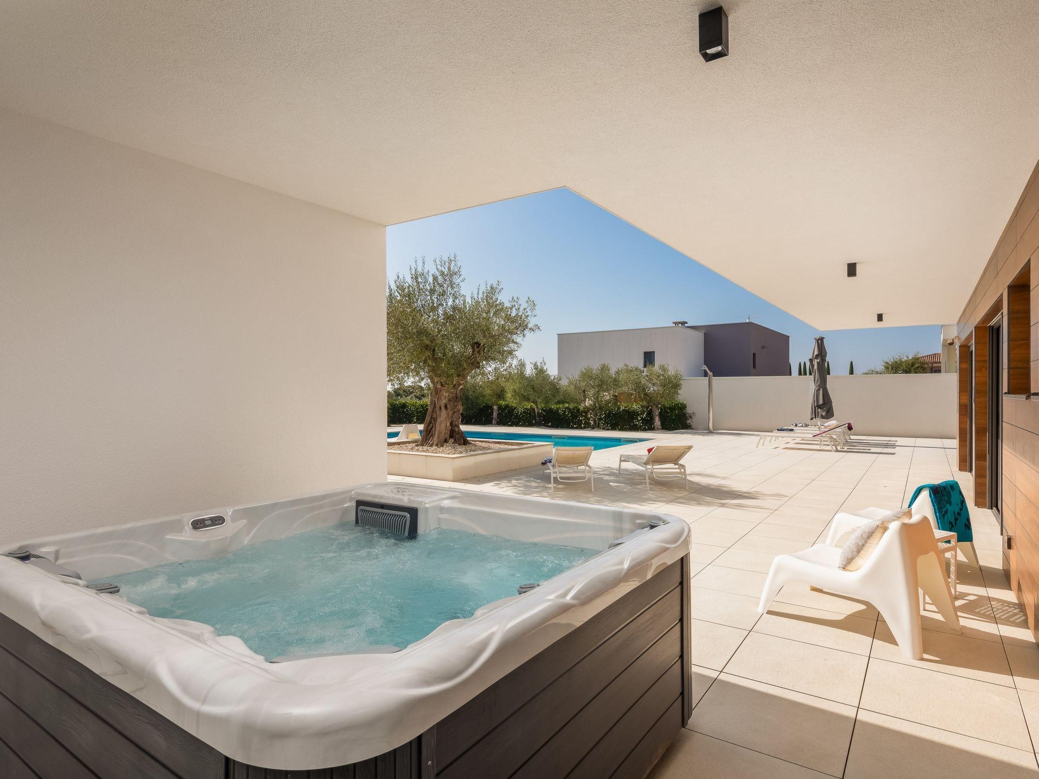 Vodnjan: Modern villa "Old Olive VIII", 3 storeys. In the hamlet Salvela 1 km from the centre of Vodnjan, 7 km from the centre of Fažana, 10 km from the centre of Pula, in a sunny position, 7 km from the sea. Private: property 1'000 m2 (fenced), garden with wildlife garden and trees, swimming pool (65 m2, depth 30 - 140 cm, seasonal availability: 01.Mar. - 01.Nov.) with internal staircase. Unconventional pool shape. Outdoor shower, hot tub, barbecue. In the house: internet access, sauna, table tennis, billiard table, table football, washing machine, tumble dryer. Parking (for 3 cars) at the house on the premises. Shop 1 km, supermarket 1 km, restaurant 1.5 km, bus stop 1.3 km, pebble beach 7 km, public bathing area 7 km. Golf course (18 hole) 7 km, tennis 2 km. Nearby attractions: NP Brijuni 7 km, Amphitheater 11 km. Groups of teenagers on request only.