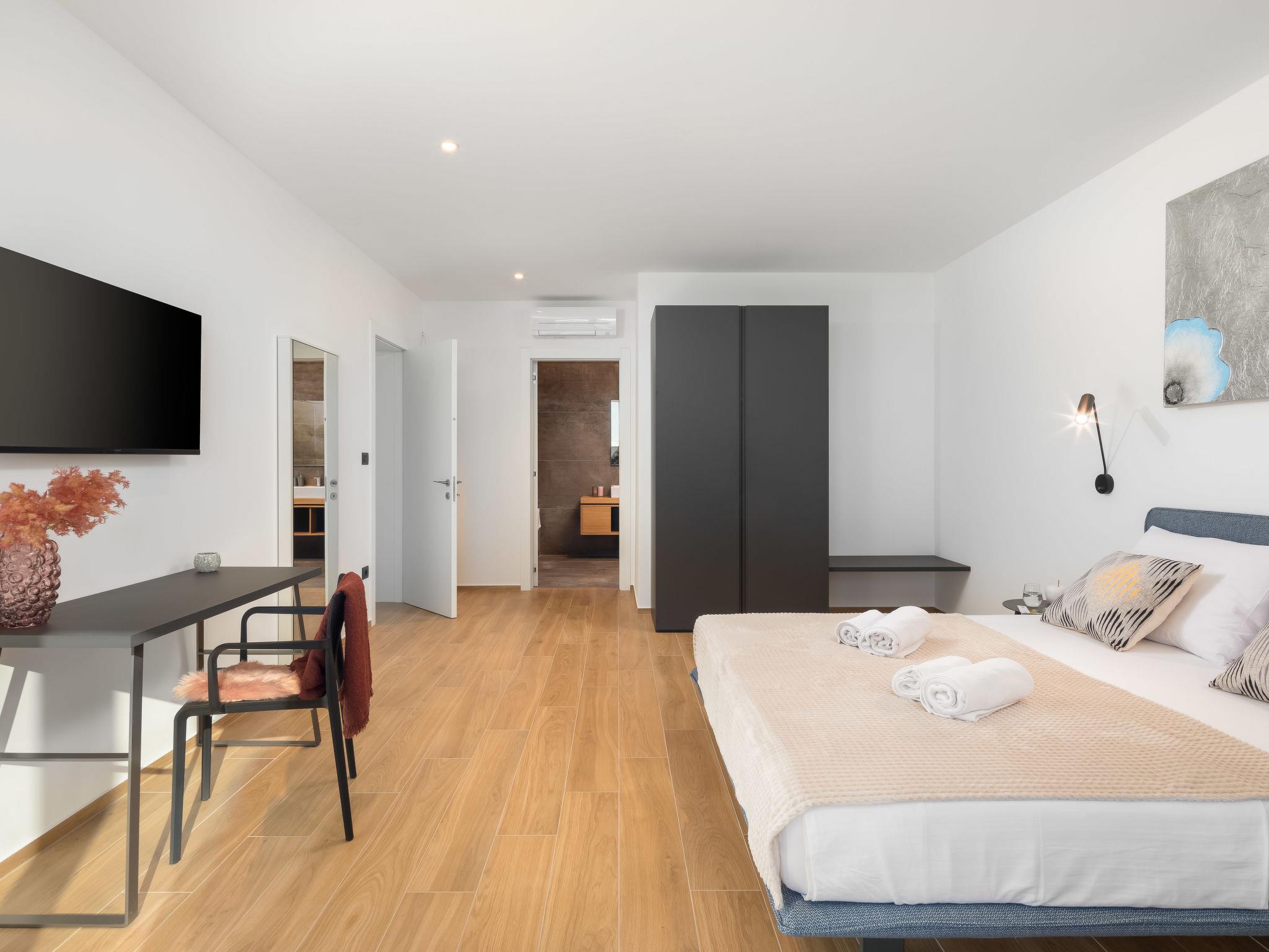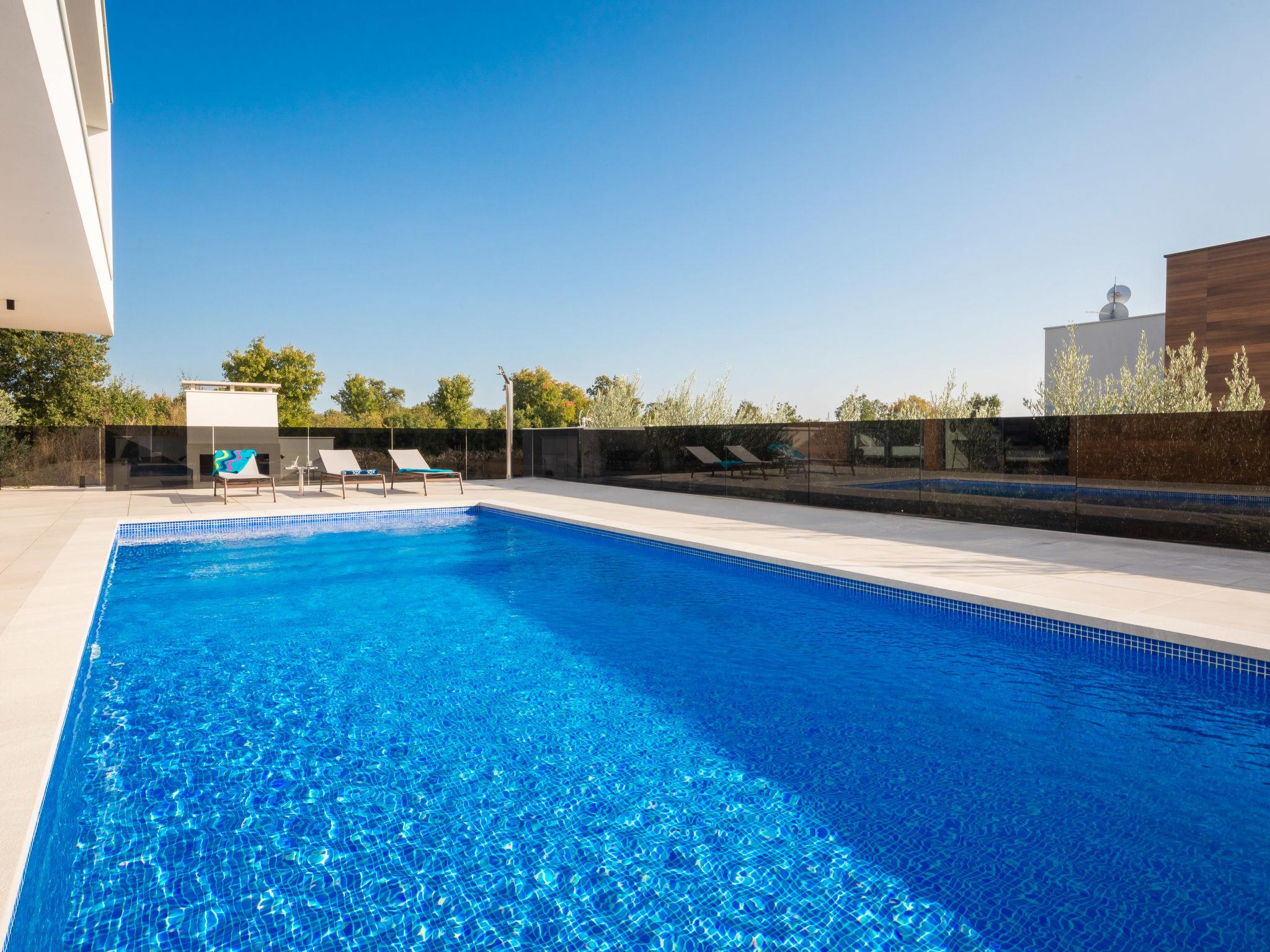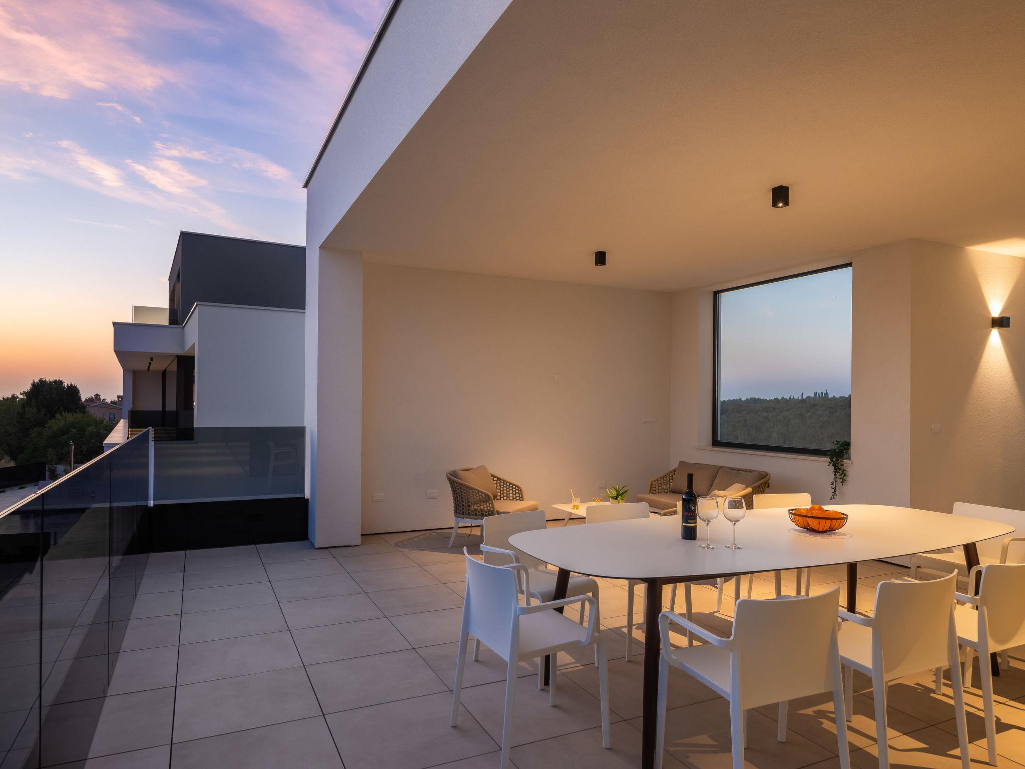 Vodnjan: Modern villa "Old Olive VI", 3 storeys, built in 2023. In the hamlet Salvela 1 km from the centre of Vodnjan, 7 km from the centre of Fažana, 10 km from the centre of Pula, in a sunny position, 7 km from the sea. Private: property 835 m2 (fenced), swimming pool (45 m2, depth 150 cm, seasonal availability: 01.Mar. - 01.Nov.) with internal staircase. Unconventional pool shape. WC in the pool area, outdoor shower, hot tub, terrace (65 m2), garden furniture, barbecue. In the house: internet access, sauna, table tennis, billiard table, table football, washing machine, tumble dryer. Parking (for 3 cars) at the house on the premises. Shop 1 km, supermarket 1 km, restaurant 1.5 km, bus stop 1.3 km, pebble beach 7 km, public bathing area 7 km. Golf course (18 hole) 7 km, tennis 2 km. Nearby attractions: NP Brijuni 7 km, Amphitheater 11 km. Groups of teenagers on request only.