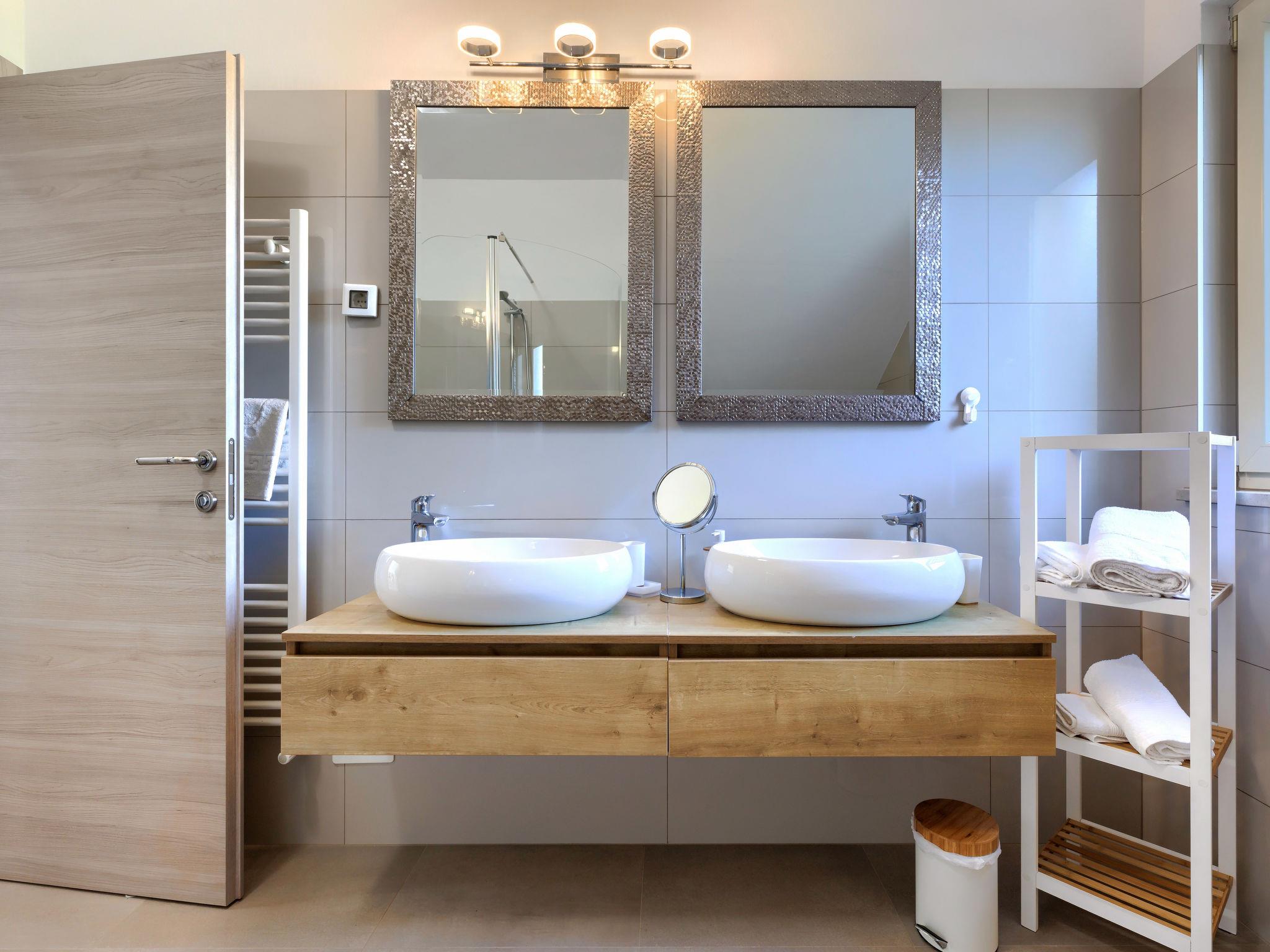 "Mia Anima", 7-room villa 350 m2 on 2 levels. Tasteful furnishings: living/dining room with open-hearth fireplace (only for decoration), satellite TV (flat screen). Exit to the swimming pool. 1 room with 1 french bed (180 cm, length 200 cm), bath/bidet/WC, double hand-basin and satellite TV (flat screen). Exit to the swimming pool. Open kitchen (oven, dishwasher, 4 ceramic glass hob hotplates, microwave, electric coffee machine). Shower/WC, sep. WC. Upper floor: living/dining room. 1 room with 2 beds (80 cm, length 200 cm), shower/bidet/WC and satellite TV (flat screen). Exit to the terrace. Walk-through room with 1 french bed (160 cm, length 200 cm), shower/bidet/WC and satellite TV (flat screen). 1 room with 1 french bed (160 cm, length 200 cm), satellite TV (flat screen). Exit to the terrace. Terrace 25 m2, roofed, terrace 10 m2, roofed. Terrace furniture, barbecue (portable), deck chairs. Partial view of the sea and the swimming pool. Facilities: safe, iron, hair dryer. Internet (WiFi, free). The ground floor of the building features a room equipped with exercise machines, a sauna and a bathroom.