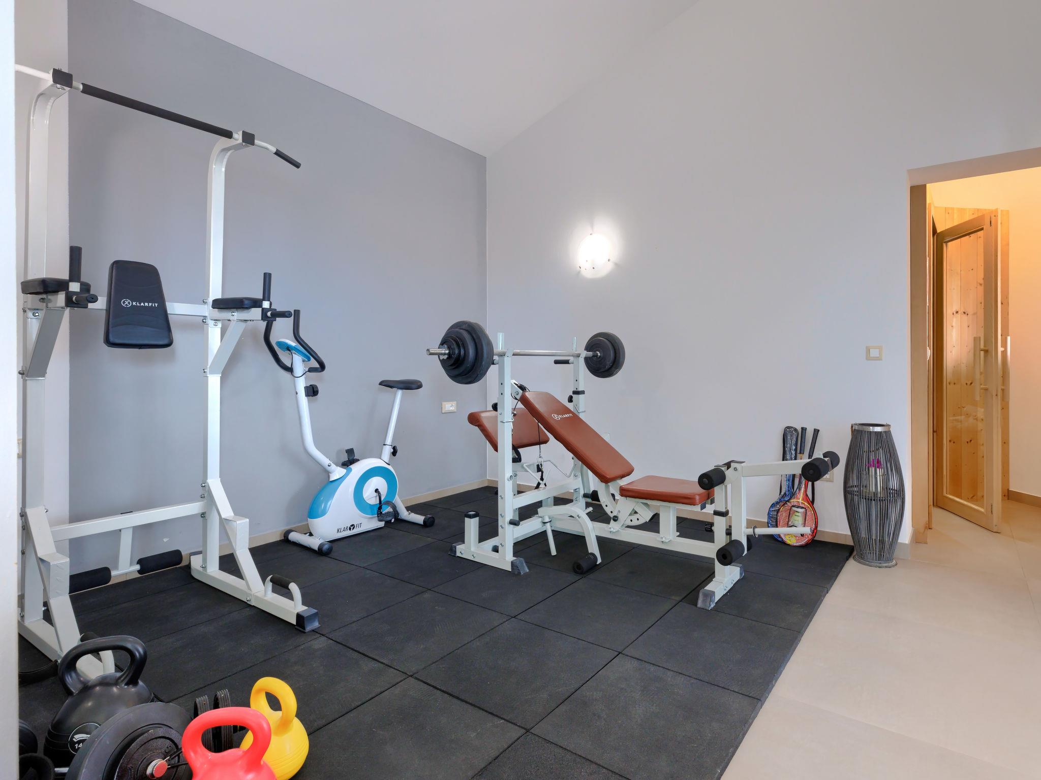 Majmajola 4 km from Vodnjan: Beautiful villa, 2 storeys. In a sunny position, 8 km from the sea. Private: property 6'300 m2 (fenced) with lawn and trees, swimming pool angular (8 x 4 m, depth 140 cm, seasonal availability: 01.Apr. - 01.Nov.) with salt-electrolysis pool-cleaning system. Outdoor shower, terrace (30 m2), barbecue, children's playground (slide, swing), pool maintenance by the owner/gardener. In the house: internet access, sauna, fitness room (all included), table tennis, table football, air conditioning, washing machine, tumble dryer. Parking (for 4 cars) at the house on the premises. Shop 4 m, restaurant, bus stop 4 km, railway station 15 km, ferry 15 km, pebble beach 8 km, rocky beach 8 km. Riding stable 15 km, walking paths from the house 100 m, cycle lane 150 m. The owner does not accept any groups. The owner does not accept any youth groups. In a separate building, there is a fully equipped kitchen, bathroom, dining table, satellite television, air conditioning and a fireplace.