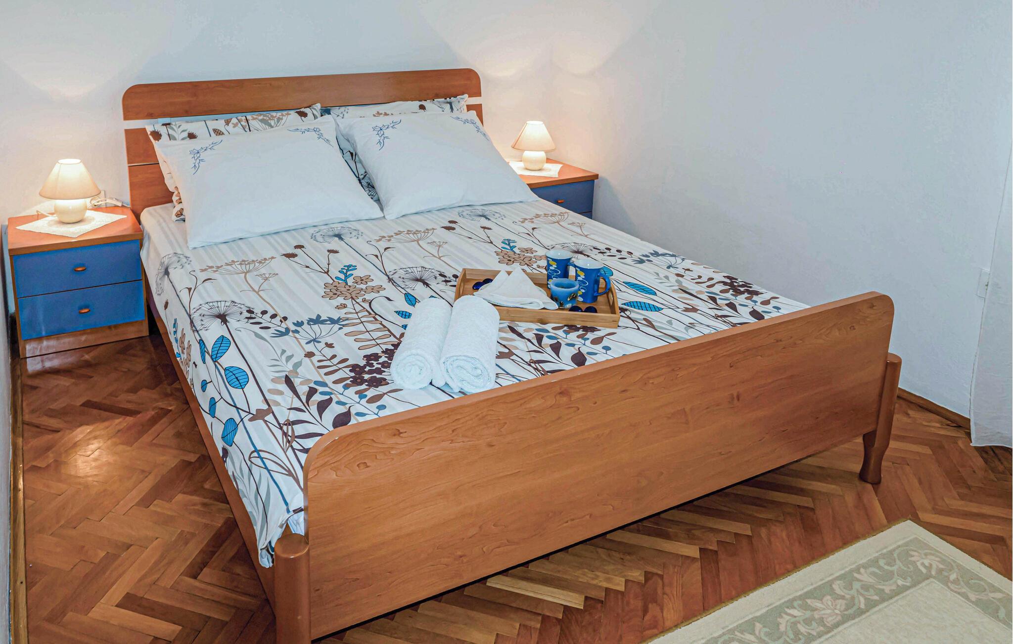 Verbringen Sie einen angenehmen Badeurlaub in Banjol, wo Sie dieses einfach und funktionell eingerichtete Ferienhaus erwartet. Auf dem Grundstück steht Ihnen eine Terrasse mit Grill und Gartenmöbeln für angenehme Stunden im Freien zur Verfügung. Spazieren Sie entlang der Uferpromenade, die sich bis zur Stadt Rab erstreckt. In der näheren Umgebung gibt es viele kleine Kiesstrände, der schöne Strand Pudarica liegt am Ortsanfang von Barbat. Dort gibt es ebenfalls einen offenen Nachtclub der zu jeder Tageszeit gut besucht ist. Empfehlenswert ist ein Ausflug nach Lopar sowie zum Gipfel des Kamenjak auf der Insel.