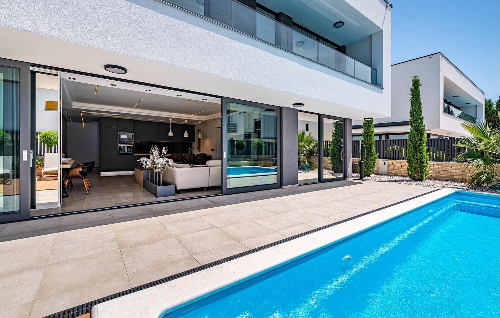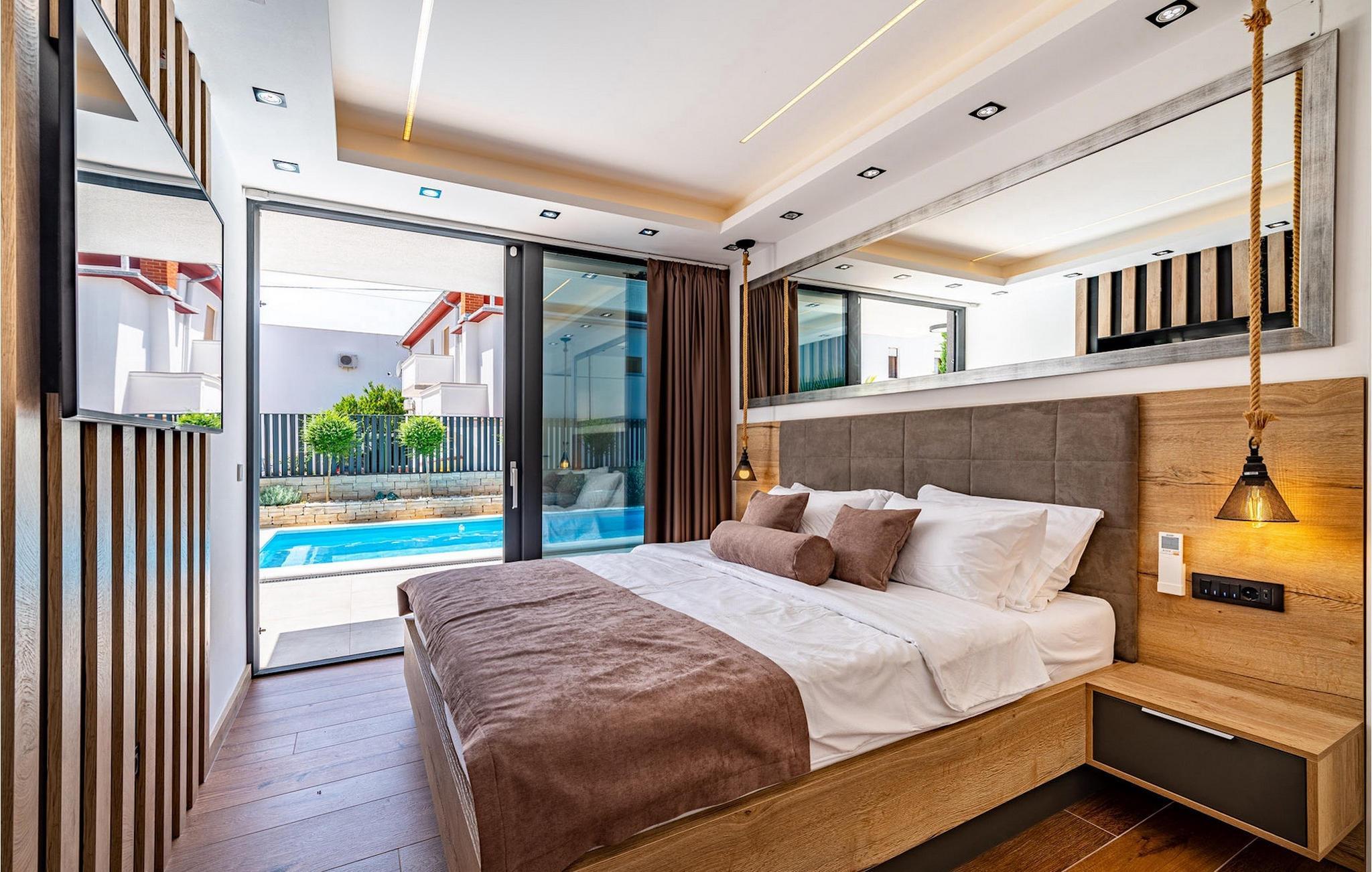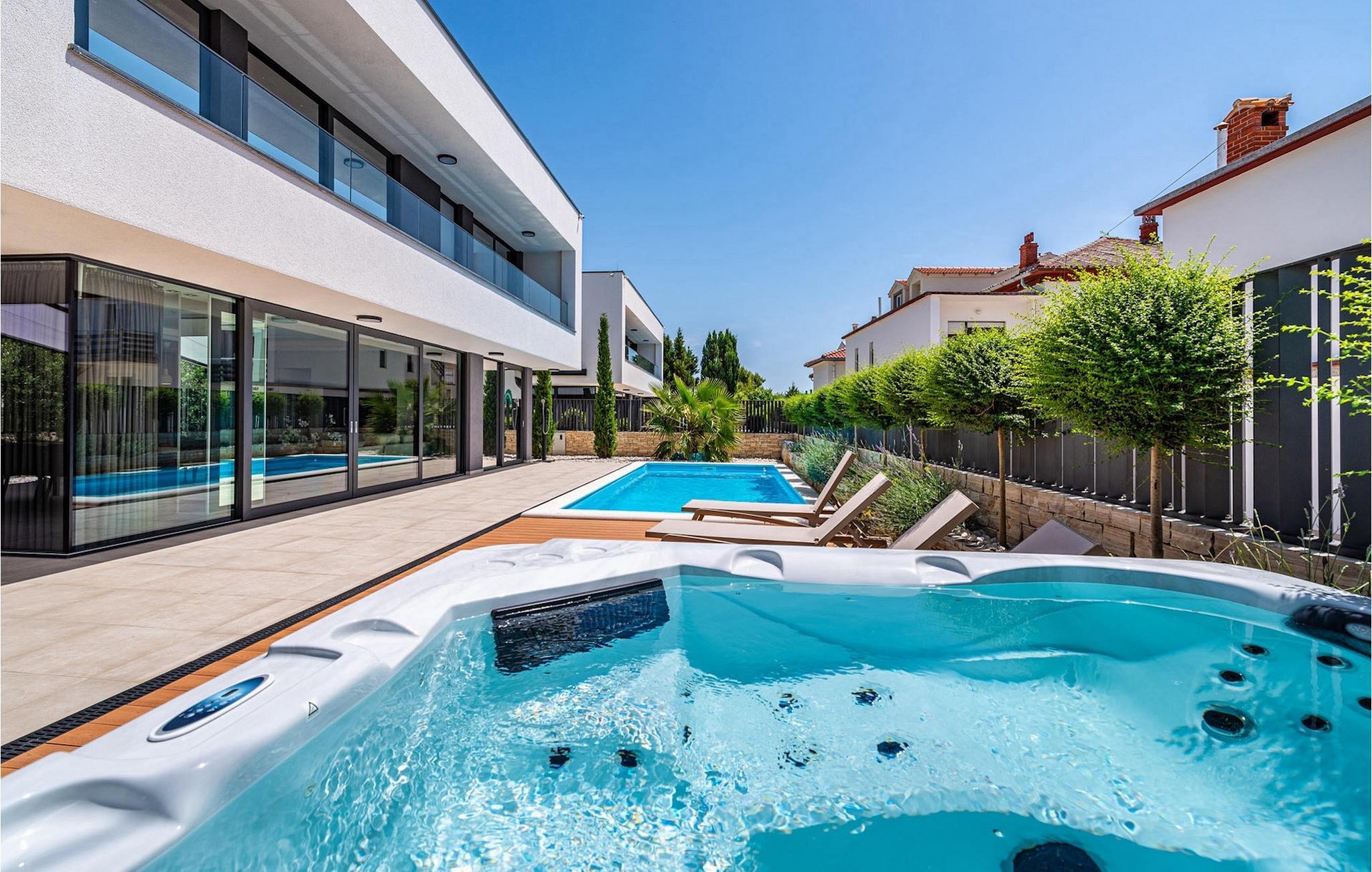 In Meernähe, auf einem 600m2 großen Grundstück befindet sich die Luxusvilla Alpha! Der Außenbereich bietet einen privaten Pool mit Sonnenliegen, damit Sie auch die heißesten Sommertage entspannt genießen können. Außerdem gibt es einen Whirlpool sowie eine überdachte Terrasse mit Essbereich und Grill. Betreten Sie von der Terrasse aus das Innere der Villa, so bietet sich Ihnen ein offener, geschmackvoll eingerichteter Wohnbereich mit Esstisch und voll ausgestatteter Küche. Alles wirkt sehr modern und doch wohnlich. Die Villa bietet Platz für insgesamt 10 Personen mit 4 komfortablen Schlafzimmern. Eines der Schlafzimmer befindet sich im Erdgeschoss, 3 weitere Schlafzimmer befinden sich auf der ersten Etage. Jedes der schick eingerichteten Schlafzimmer verfügt über ein eigenes modernes Badezimmer, eine Klimaanlage und TV. Im Keller befindet sich eine Sauna, ein weiteres Badezimmer, eine kleine Küche und Spielraum mit PlayStation 5. Nutzen Sie diese Gelegenheit und genießen Sie die Insel Rab mit Familie und Freunden - buchen Sie Ihren Traumurlaub!Villa Alpha befindet sich auf der Insel Rab in excellented Lage nah am Meer. Das die Insel auch "smaragdgrüne Insel” gibt es einen guten Grund gibt. Rab ist eine der waldreichsten und grünsten Insel der Adria ist. Auf mehr als 100 km Wander- und Radwegen können sie ihre vielseitige Flora und Fauna entdecken, und dabei die Aussicht genießen. Rab ist mit seinen für Kroatien eher untypischen Sandstränden besonders bei Familien mit Kindern beliebt. Mit über 20 Sandstränden und unzähligen malerischen Buchten findet jeder Strandliebhaber mit Sicherheit den perfekten Ort ganz nach seinem Geschmack. In Gastronomischer Hinsicht wird Rab definitiv Ihre Wünsche erfüllen. Frischer Fisch und Meeresfrüchte sind die wichtigsten Lebensmittel der Bewohner. Wenn auf der Insel müssen Sie unbedingt die Spezialität "Rapska torta" probieren - eine besondere Torte auf einer speziellen Insel. Die Insel Rab gehört zur Kvarner Bucht und ist mit der Fähre vom Hafen Stinica am Festland in nur 15 Minuten erreichbar.