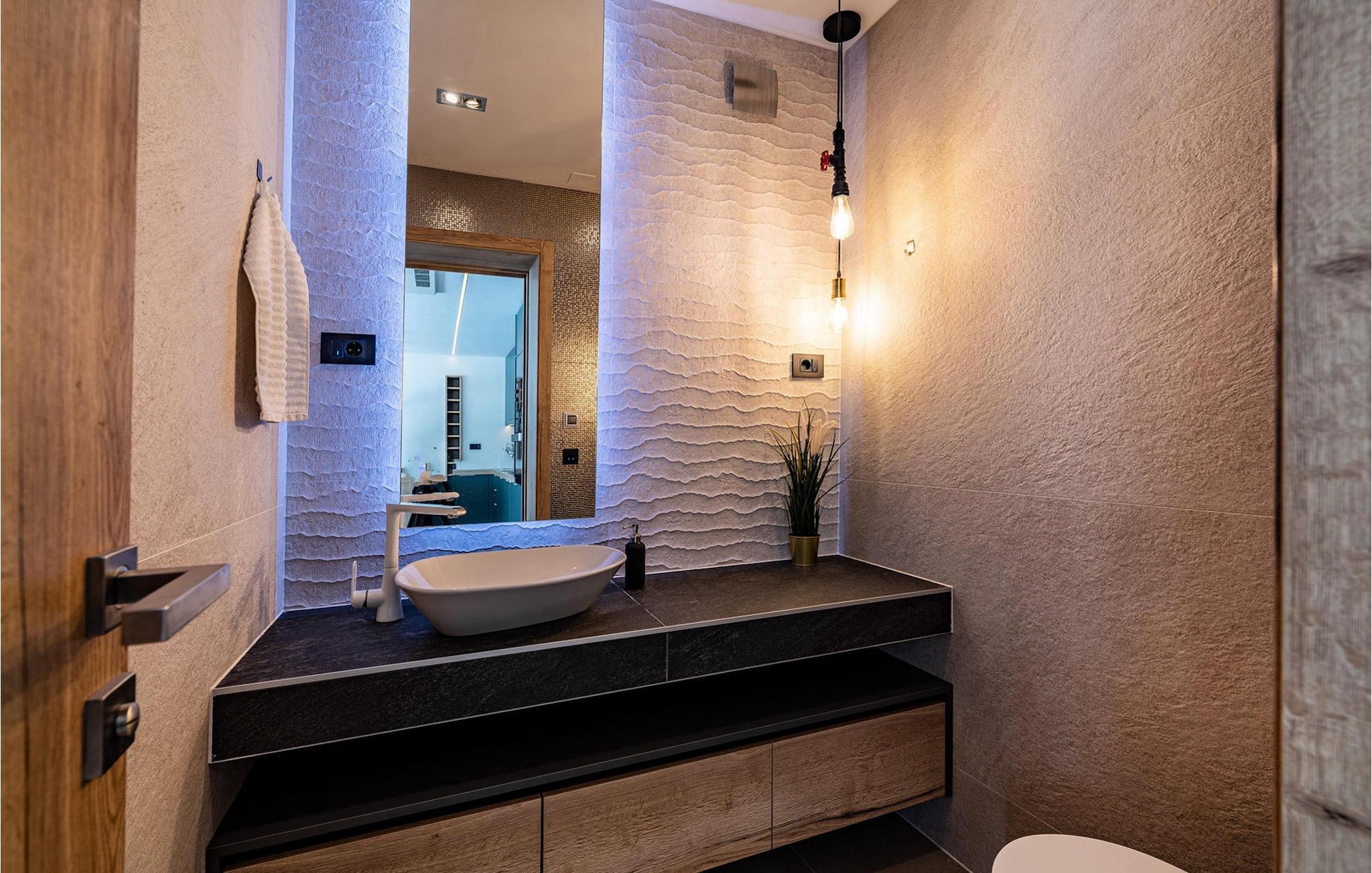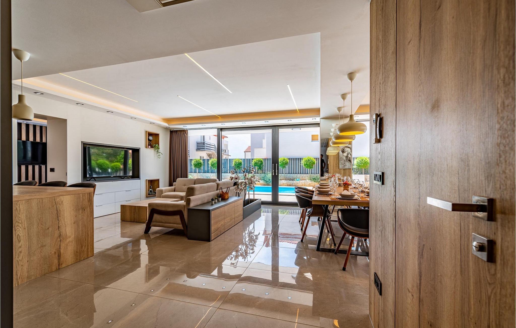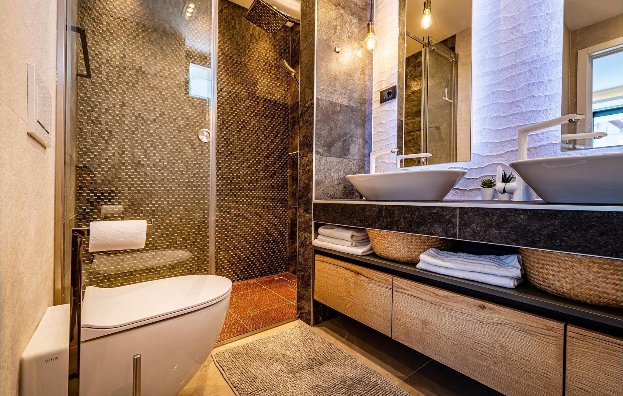 In Meernähe, auf einem 600m2 großen Grundstück befindet sich die Luxusvilla Alpha! Der Außenbereich bietet einen privaten Pool mit Sonnenliegen, damit Sie auch die heißesten Sommertage entspannt genießen können. Außerdem gibt es einen Whirlpool sowie eine überdachte Terrasse mit Essbereich und Grill. Betreten Sie von der Terrasse aus das Innere der Villa, so bietet sich Ihnen ein offener, geschmackvoll eingerichteter Wohnbereich mit Esstisch und voll ausgestatteter Küche. Alles wirkt sehr modern und doch wohnlich. Die Villa bietet Platz für insgesamt 10 Personen mit 4 komfortablen Schlafzimmern. Eines der Schlafzimmer befindet sich im Erdgeschoss, 3 weitere Schlafzimmer befinden sich auf der ersten Etage. Jedes der schick eingerichteten Schlafzimmer verfügt über ein eigenes modernes Badezimmer, eine Klimaanlage und TV. Im Keller befindet sich eine Sauna, ein weiteres Badezimmer, eine kleine Küche und Spielraum mit PlayStation 5. Nutzen Sie diese Gelegenheit und genießen Sie die Insel Rab mit Familie und Freunden - buchen Sie Ihren Traumurlaub!Villa Alpha befindet sich auf der Insel Rab in excellented Lage nah am Meer. Das die Insel auch "smaragdgrüne Insel” gibt es einen guten Grund gibt. Rab ist eine der waldreichsten und grünsten Insel der Adria ist. Auf mehr als 100 km Wander- und Radwegen können sie ihre vielseitige Flora und Fauna entdecken, und dabei die Aussicht genießen. Rab ist mit seinen für Kroatien eher untypischen Sandstränden besonders bei Familien mit Kindern beliebt. Mit über 20 Sandstränden und unzähligen malerischen Buchten findet jeder Strandliebhaber mit Sicherheit den perfekten Ort ganz nach seinem Geschmack. In Gastronomischer Hinsicht wird Rab definitiv Ihre Wünsche erfüllen. Frischer Fisch und Meeresfrüchte sind die wichtigsten Lebensmittel der Bewohner. Wenn auf der Insel müssen Sie unbedingt die Spezialität "Rapska torta" probieren - eine besondere Torte auf einer speziellen Insel. Die Insel Rab gehört zur Kvarner Bucht und ist mit der Fähre vom Hafen Stinica am Festland in nur 15 Minuten erreichbar.