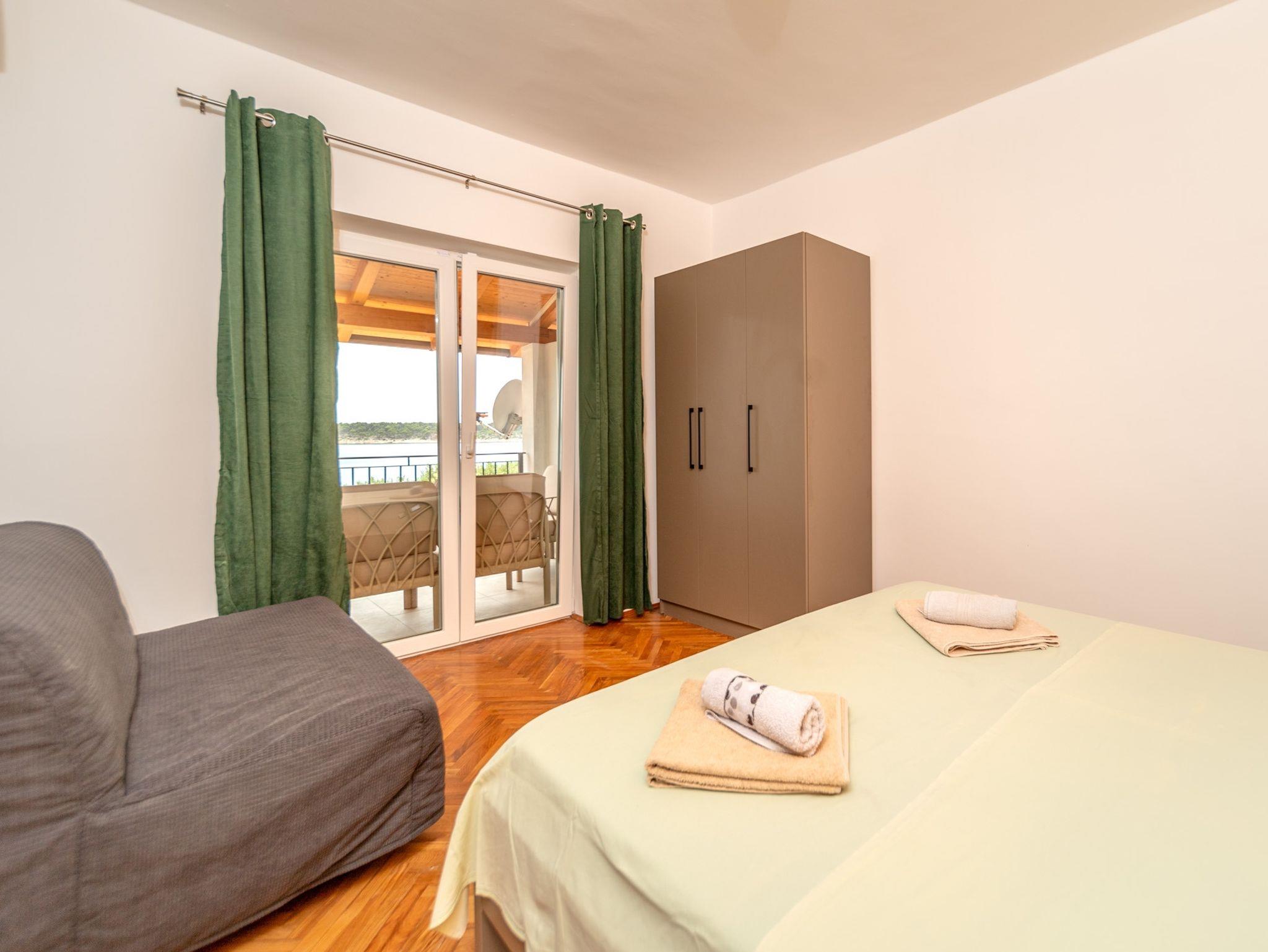 Ferienwohnung bietet Platz für 3 Gäste. Die Betten sind in Schlafzimmern, die es 1 gibt, innerhalb einer Gesamtfläche von 31m2, angeordnet. Die Gäste haben eine eigene Terrasse zur Verfügung, auf der sie in warmen Sommernächten genießen können. Das Apartment bietet Meerblick. Es ist erlaubt, Speisen auf dem Gemeinschafts-Grill vorzubereiten. IM PREIS INBEGRIFFEN: Kurtaxe, Endreinigung, Klimatisierung, Parkplatz, Internet, Bügeleisen, Föhn. VERBINDLICHE ZUSÄTZLICHE KOSTEN: Aufzahlung für Kurzaufenthalte (prozentualer Zuschlag pro Nächtigungsanzahl: 30% - 1, 20% - 2, 10% - 3). UNVERBINDLICHE ZUSÄTZLICHE KOSTEN: Bootsanlegeplatz (10,00 € pro Nacht), 2 Kinderbettchen (10,00 € Person/Tag). Die Verfügbarkeit zusätzlicher Dienstleistungen in Ihrem reservierten Termin und die Preise derselben (falls nicht aufgeführt) müssen im Voraus überprüft werden. Zusätzliche Dienstleistungen die in der Zahlungsaufforderung nicht aufgeführt sind werden direkt beim Vermieter bezahlt, angenommen der Gast nutzt auch diese.