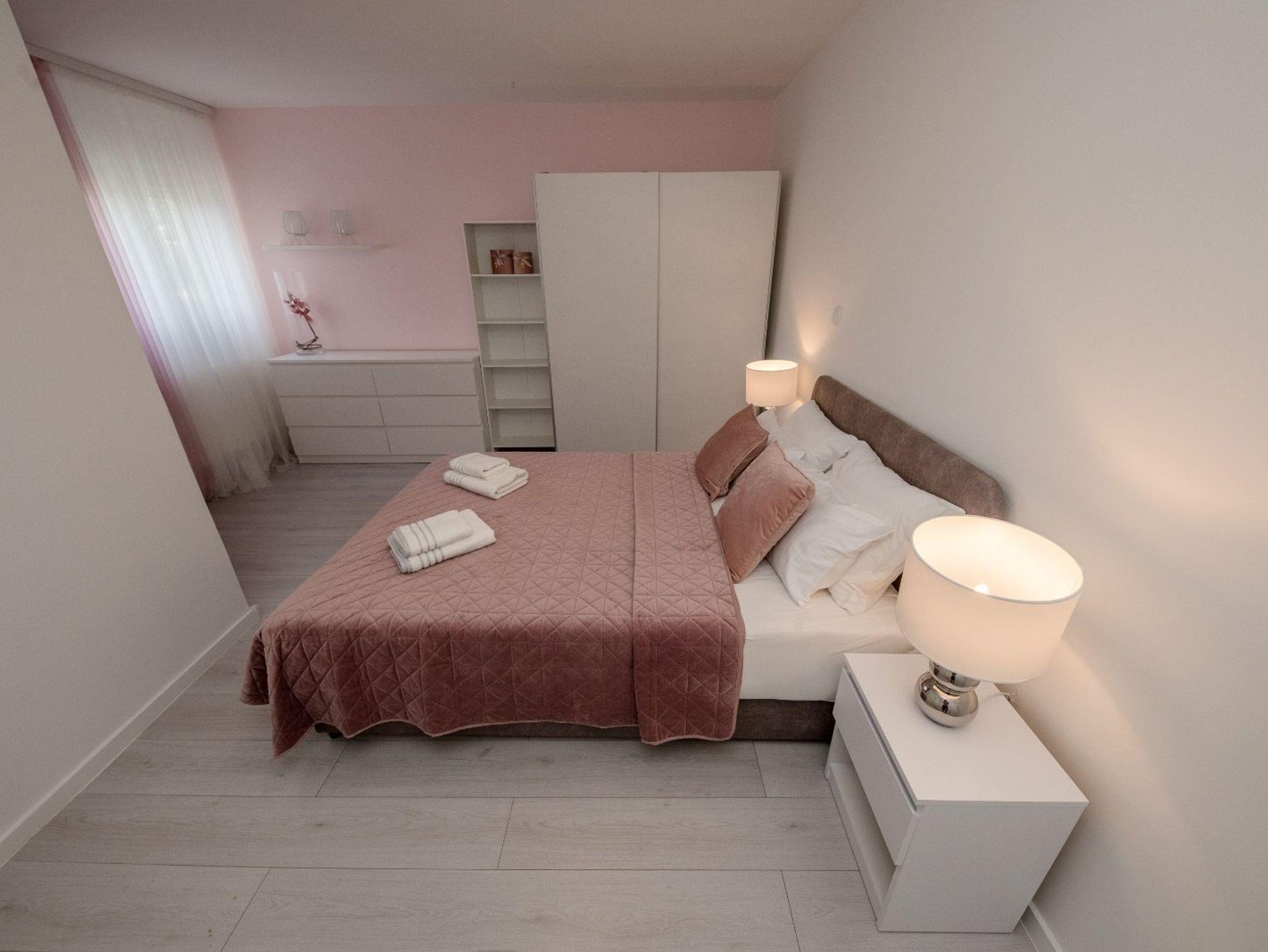 Ferienwohnung bietet Platz für 4 Gäste. Die Betten sind in Schlafzimmern, die es 2 gibt, innerhalb einer Gesamtfläche von 59m2, angeordnet. Die Gäste haben einen eigenen Balkon zur Verfügung, auf der sie in warmen Sommernächten genießen können. Das Apartment bietet Meerblick. Es ist erlaubt, Speisen auf dem Gemeinschafts-Grill vorzubereiten. IM PREIS INBEGRIFFEN: Kurtaxe, Endreinigung, Parkplatz, Internet, Wäschewaschen, Zusatzbett, Bügeleisen, Bügelbrett, Föhn. VERBINDLICHE ZUSÄTZLICHE KOSTEN: Aufzahlung für Kurzaufenthalte (prozentualer Zuschlag pro Nächtigungsanzahl: 30% - 1, 20% - 2, 10% - 3). UNVERBINDLICHE ZUSÄTZLICHE KOSTEN: Klimatisierung (5,00 € pro Nacht), Bootsanlegeplatz (5,00 € pro Nacht). Die Verfügbarkeit zusätzlicher Dienstleistungen in Ihrem reservierten Termin und die Preise derselben (falls nicht aufgeführt) müssen im Voraus überprüft werden. Zusätzliche Dienstleistungen die in der Zahlungsaufforderung nicht aufgeführt sind werden direkt beim Vermieter bezahlt, angenommen der Gast nutzt auch diese.