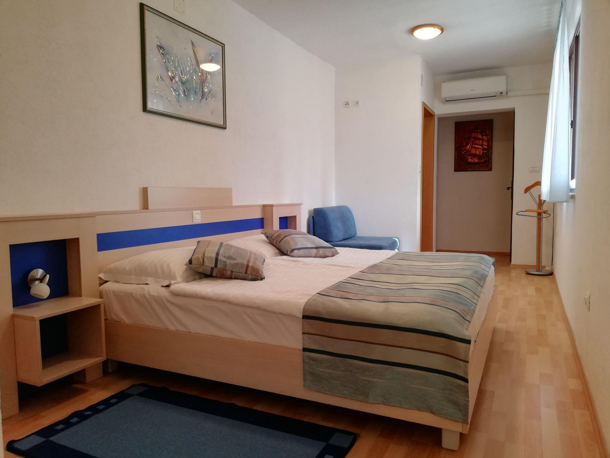 Ferienwohnung bietet Platz für 4 Gäste. Die Betten sind in Schlafzimmern, die es 2 gibt, innerhalb einer Gesamtfläche von 45m2, angeordnet. Die Gäste haben eine eigene Terrasse zur Verfügung, auf der sie in warmen Sommernächten genießen können. Das Apartment bietet Meerblick. Es ist erlaubt, Speisen auf dem Gemeinschafts-Grill vorzubereiten. IM PREIS INBEGRIFFEN: Kurtaxe, Endreinigung, Klimatisierung, Parkplatz, Garage, Internet, Kinderbett, tragbarer Grill. Die Verfügbarkeit zusätzlicher Dienstleistungen in Ihrem reservierten Termin und die Preise derselben (falls nicht aufgeführt) müssen im Voraus überprüft werden. Zusätzliche Dienstleistungen die in der Zahlungsaufforderung nicht aufgeführt sind werden direkt beim Vermieter bezahlt, angenommen der Gast nutzt auch diese. Ermäßigung auf den Grundpreis: Gratistag 14=13 (bei einem Aufenthalt von 14 Tagen oder mehr erhalten Sie einen Gratistag für den Aufenthalt bis 31.12.26).