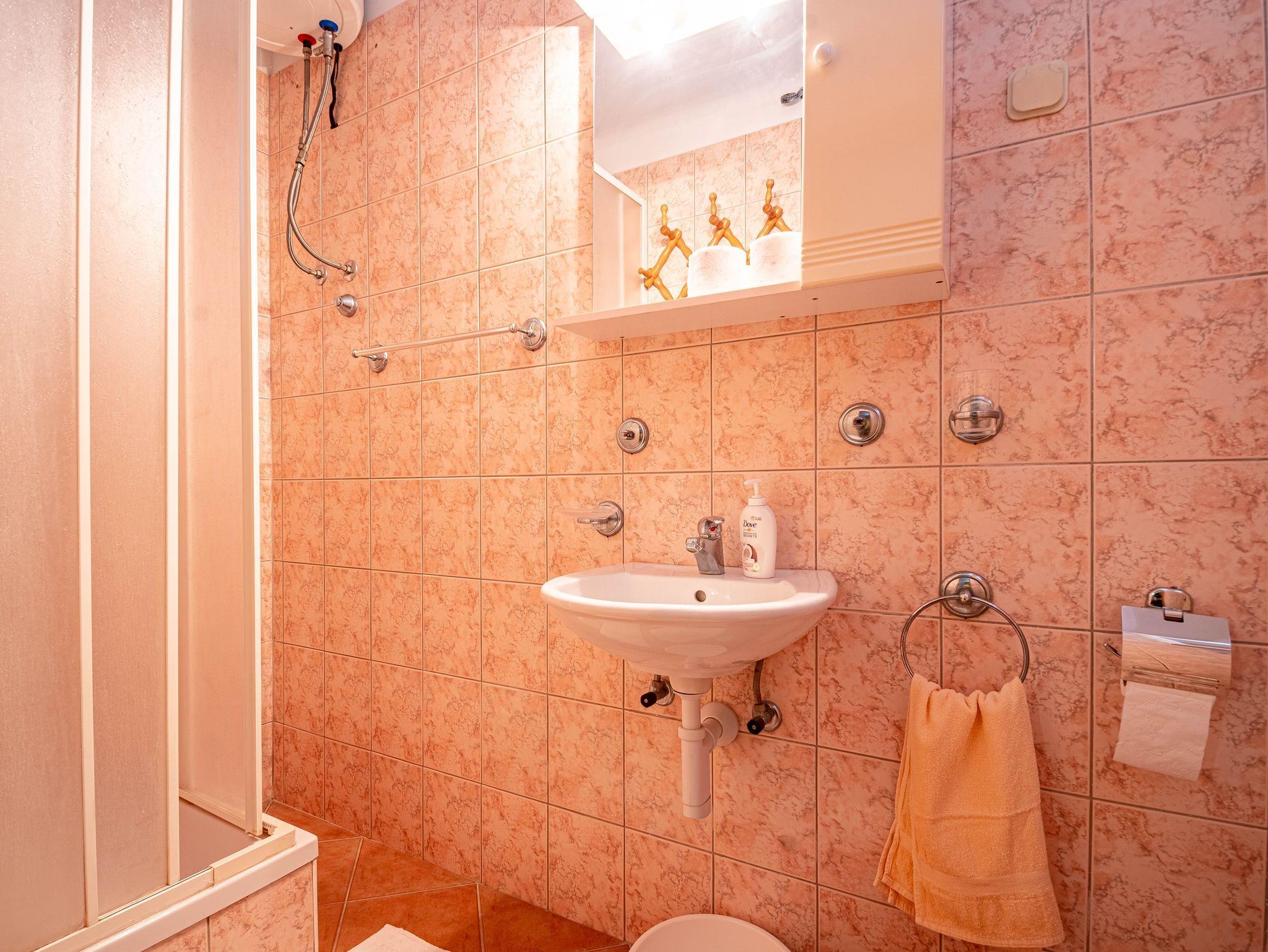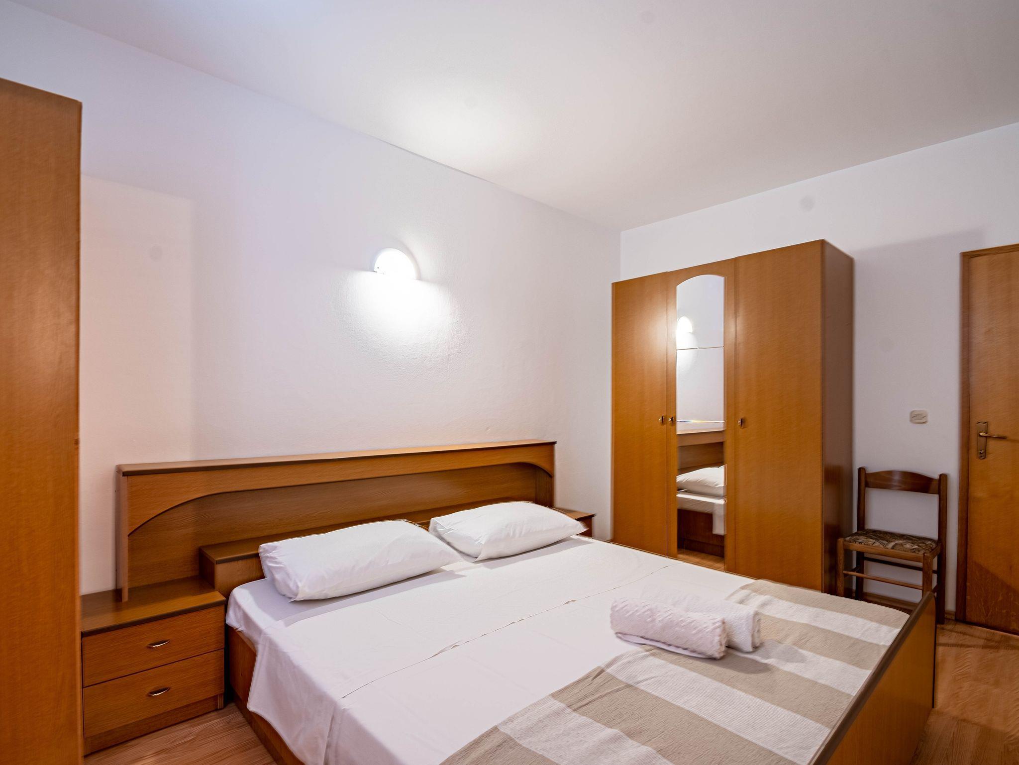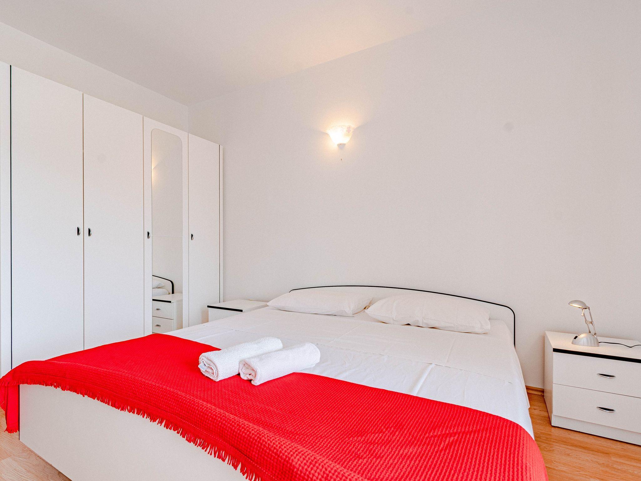 Ferienwohnung bietet Platz für 6 Gäste. Die Betten sind in Schlafzimmern, die es 3 gibt, innerhalb einer Gesamtfläche von 79m2, angeordnet. Die Gäste haben eine eigene Terrasse zur Verfügung, auf der sie in warmen Sommernächten genießen können. Das Apartment bietet Meerblick. Es ist erlaubt, Speisen auf dem Gemeinschafts-Grill vorzubereiten. IM PREIS INBEGRIFFEN: Kurtaxe, Endreinigung, Klimatisierung, Parkplatz, Internet, Wäschewaschen, Kinderbett, Bügeleisen, Bügelbrett, Föhn, Liegestühle. VERBINDLICHE ZUSÄTZLICHE KOSTEN: Aufzahlung für Kurzaufenthalte (prozentualer Zuschlag pro Nächtigungsanzahl: 30% - 1, 20% - 2, 10% - 3). Die Verfügbarkeit zusätzlicher Dienstleistungen in Ihrem reservierten Termin und die Preise derselben (falls nicht aufgeführt) müssen im Voraus überprüft werden. Zusätzliche Dienstleistungen die in der Zahlungsaufforderung nicht aufgeführt sind werden direkt beim Vermieter bezahlt, angenommen der Gast nutzt auch diese. Ermäßigung auf den Grundpreis: Gratistag 14=13 (bei einem Aufenthalt von 14 Tagen oder mehr erhalten Sie einen Gratistag für den Aufenthalt bis 31.12.26).