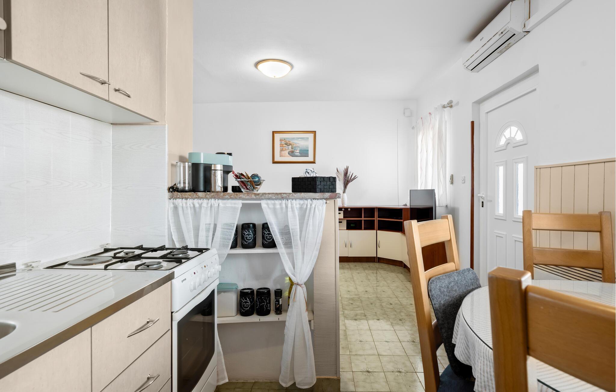 Dieses Haus erwartet Sie mit einer entspannten Atmosphäre mit hellen Räumen, einer modernen Sofalandschaft und einem rustikalen Kaminofen. Machen Sie es sich auf dem großen Sofa bequem, hören Sie Ihre Lieblingsmusik oder entspannen Sie bei einem Filmabend. In der Küche können Sie gemeinsam kochen und regionale Zutaten ausprobieren, bevor Sie diese mit einem Glas kroatischem Wein servieren.