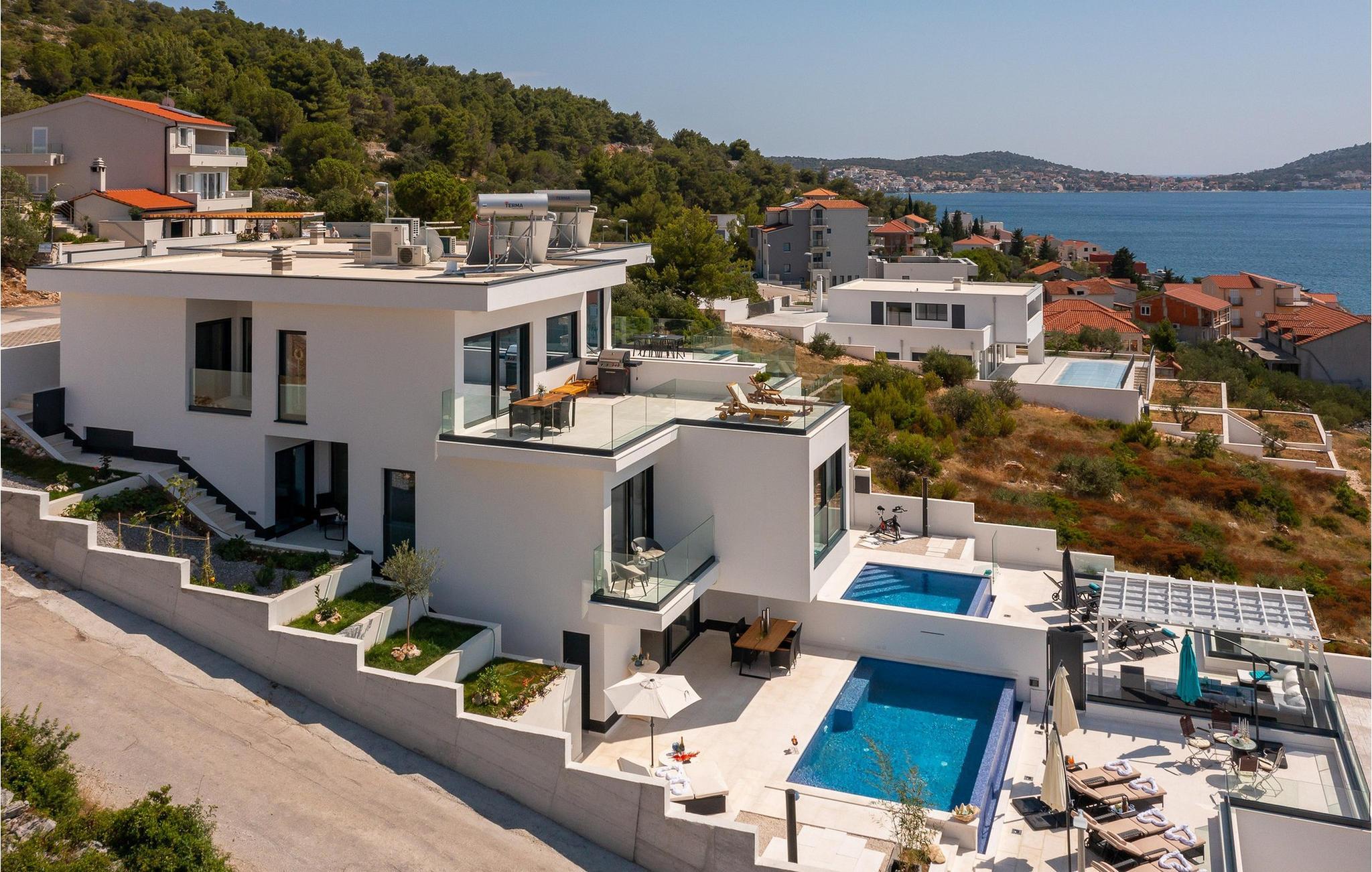 In der kleinen mediterranen Stadt Rogoznica, im Zentrum Dalmatiens gelegen, befindet sich die Villa Paradise View. Der Name ist Programm: eine Villa mit einem himmlischen Blick auf das ruhige, klare und saubere Meer, den jeder Gast auf der Suche nach einem luxuriösen Urlaub genießen wird. Die Altstadt von Rogoznica liegt auf der kleinen Insel Kopara, die im 19. Jahrhundert künstlich mit dem Festland verbunden wurde. Die Insel ist mit Wald bedeckt und die Altstadt wird von Steinhäusern dominiert, weshalb Rogoznica seinen Charme einer kleinen mediterranen Stadt bewahrt hat. Villa Paradise View wurde 2020 in modernem Baustil erbaut und verfügt über 220 m2 Wohnfläche. Es ist nur 80 m vom nächsten Meer und dem Strand von Zatoglav entfernt. Es bietet Platz für maximal acht, optimalerweise sechs Personen und besteht aus Erdgeschoss und Obergeschoss. Im Erdgeschoss befindet sich ein geräumiges Wohnzimmer mit Sofa und Fernseher. In der Nähe des Wohnzimmers befindet sich ein Esszimmer mit einem Tisch für sechs Personen und eine moderne Küche, in der Sie köstliche Mahlzeiten für sich und Ihre Familie zubereiten können. Im Obergeschoss befinden sich drei Schlafzimmer mit jeweils eigenem Badezimmer mit Dusche, eines davon mit Badewanne. Zwei der drei aufgeführten Schlafzimmer verfügen über einen Balkon oder eine Terrasse, von der aus Sie Ihren Morgenkaffee genießen und dabei Ihre Lieblingslektüre lesen können. Auf der Außenterrasse befindet sich ein beheizter Infinity-Pool von 28 m2 und einer Tiefe von 1,7 m. Der Pool verfügt über eine Massagefunktion und wird durch LED-Leuchten beleuchtet, die ihm nachts einen besonderen Look verleihen. Daneben gibt es sechs Sonnenliegen und eine separate Toilette. Neben dem überdachten Esstisch im Freien gibt es auch einen Gasgrill im Freien, auf dem Sie köstliche traditionelle Gerichte wie frischen Seefisch oder leckeres Fleisch zubereiten können. Villa Paradise View ist eine Doppelhaushälfte und der Eigentümer wohnt oft in einem separaten Bereich. Der Eingang ist vollständig abgetrennt, so dass jeder Gast absolute Privatsphäre hat und der Eigentümer den Gästen während seines Aufenthalts maximal zur Verfügung steht. Zu den Attraktionen von Rogoznica zählen das Meeresaquarium unter freiem Himmel, das Lavendellabyrinth oder der See Zmajevo oko. Dieser Salzsee liegt auf der Halbinsel Gradina und ist ein einzigartiges hydrogeomorphologisches Phänomen. An der mehr als 50 km langen Küste gibt es zahlreiche Sand-, Fels- und versteckte Strände, an denen Ihnen ganztägige Entspannung garantiert ist. Das kristallklare Meer und die warme Sonne sorgen für maximale Freude an den Freuden des Sommers. Verpassen Sie nicht das gastronomische Angebot der köstlichsten mediterranen Köstlichkeiten wie Fisch, Krabben oder Schalentiere sowie Prosciutto, hausgemachten Käse und Olivenöl! Gönnen Sie sich den Charme der Villa Paradise View und nehmen Sie schöne Erinnerungen an einen Urlaub mit, der eines Königs würdig ist! Jeder Gast wird mit einem Willkommensgeschenk begrüßt!