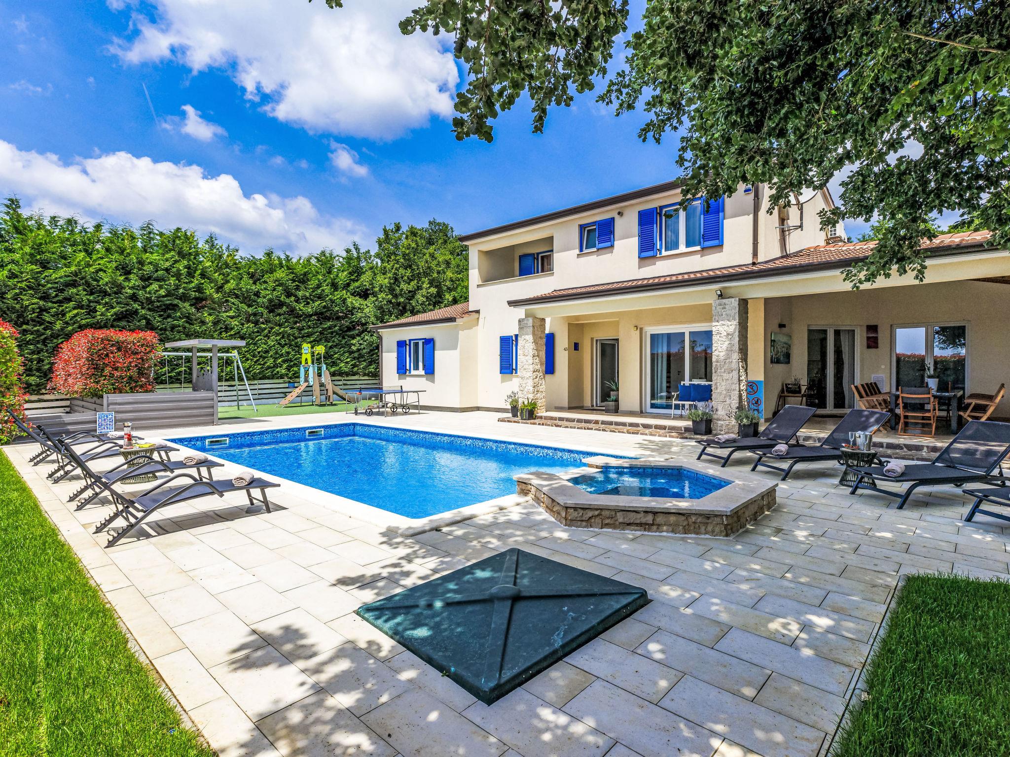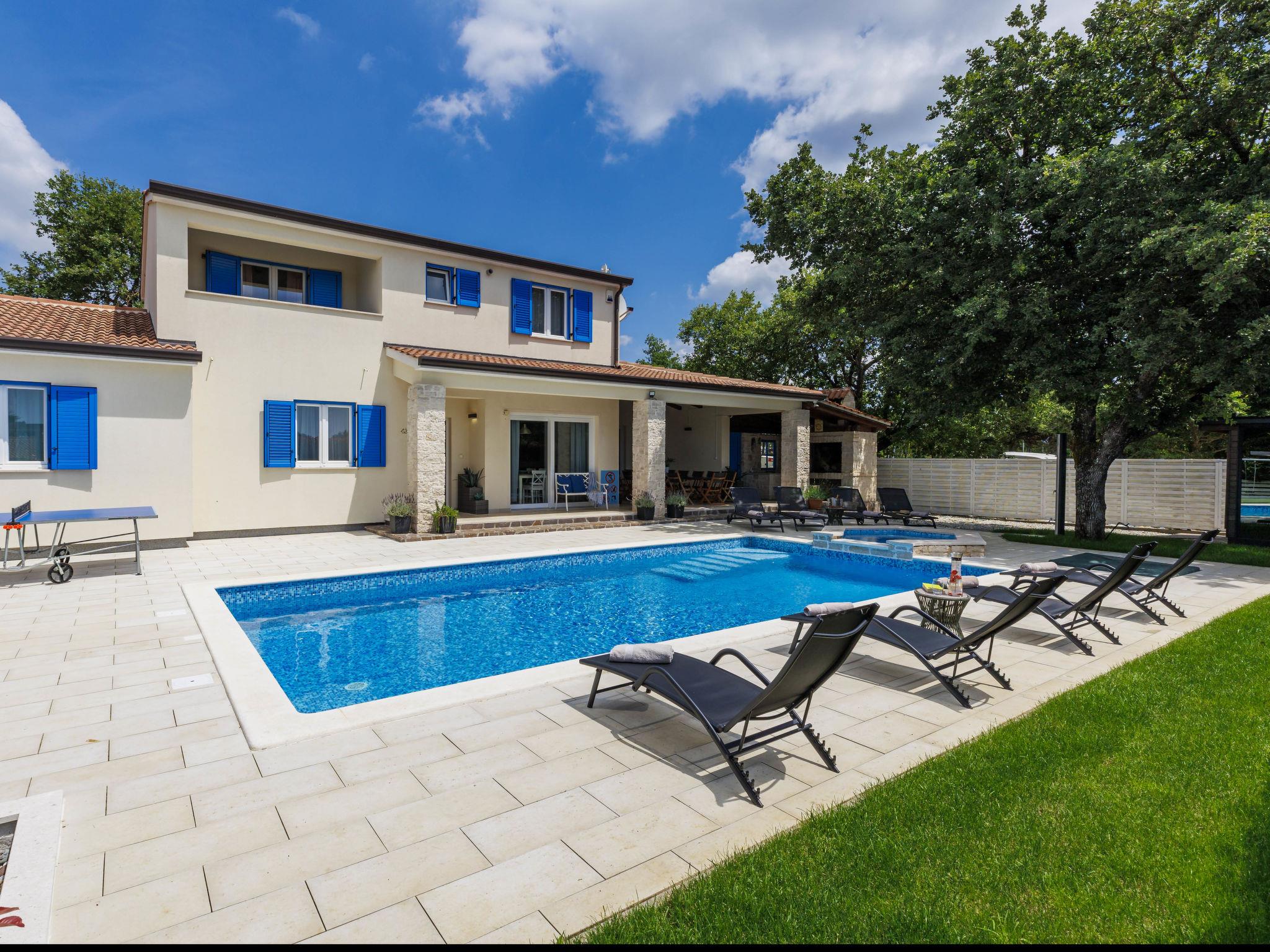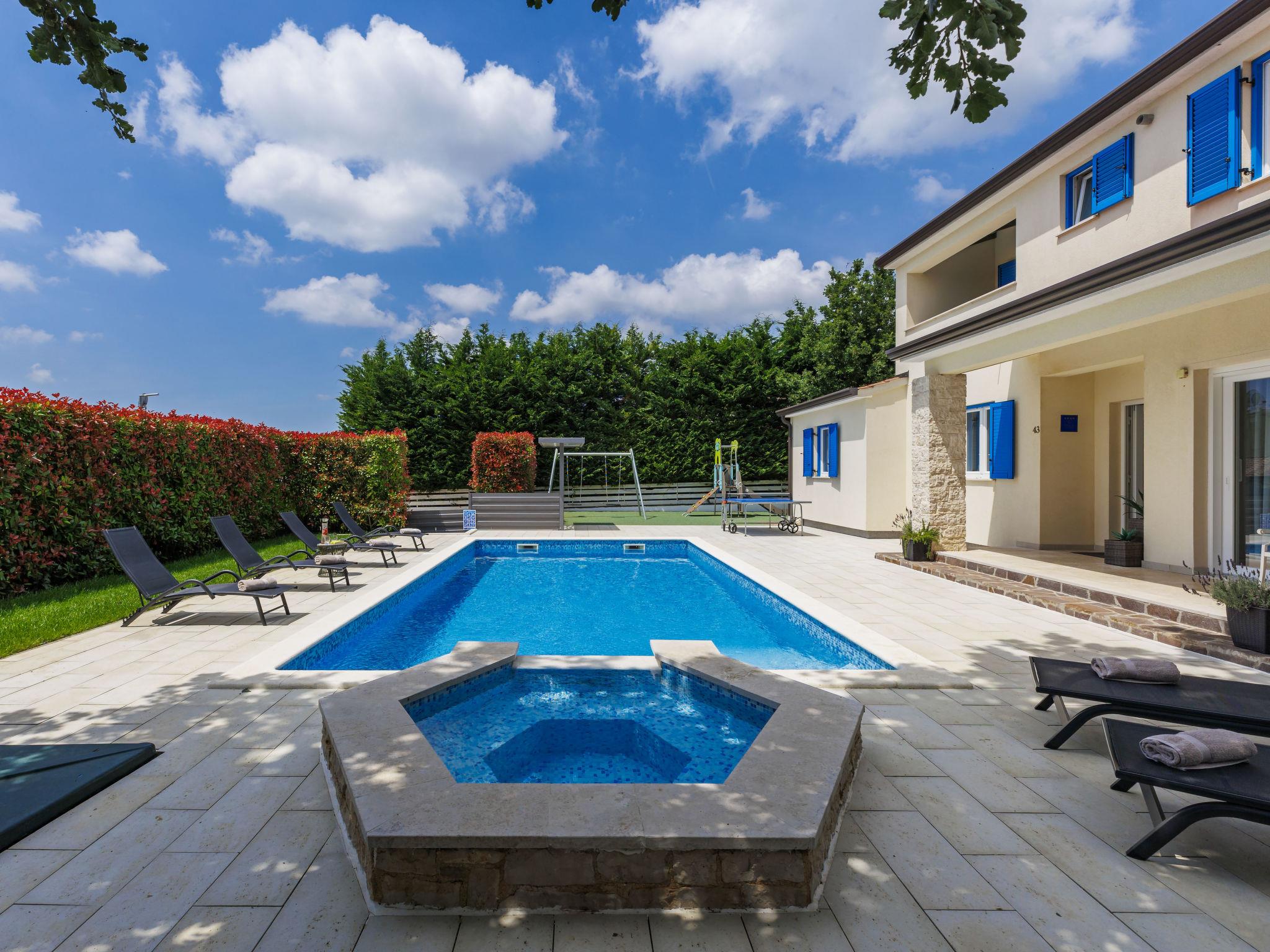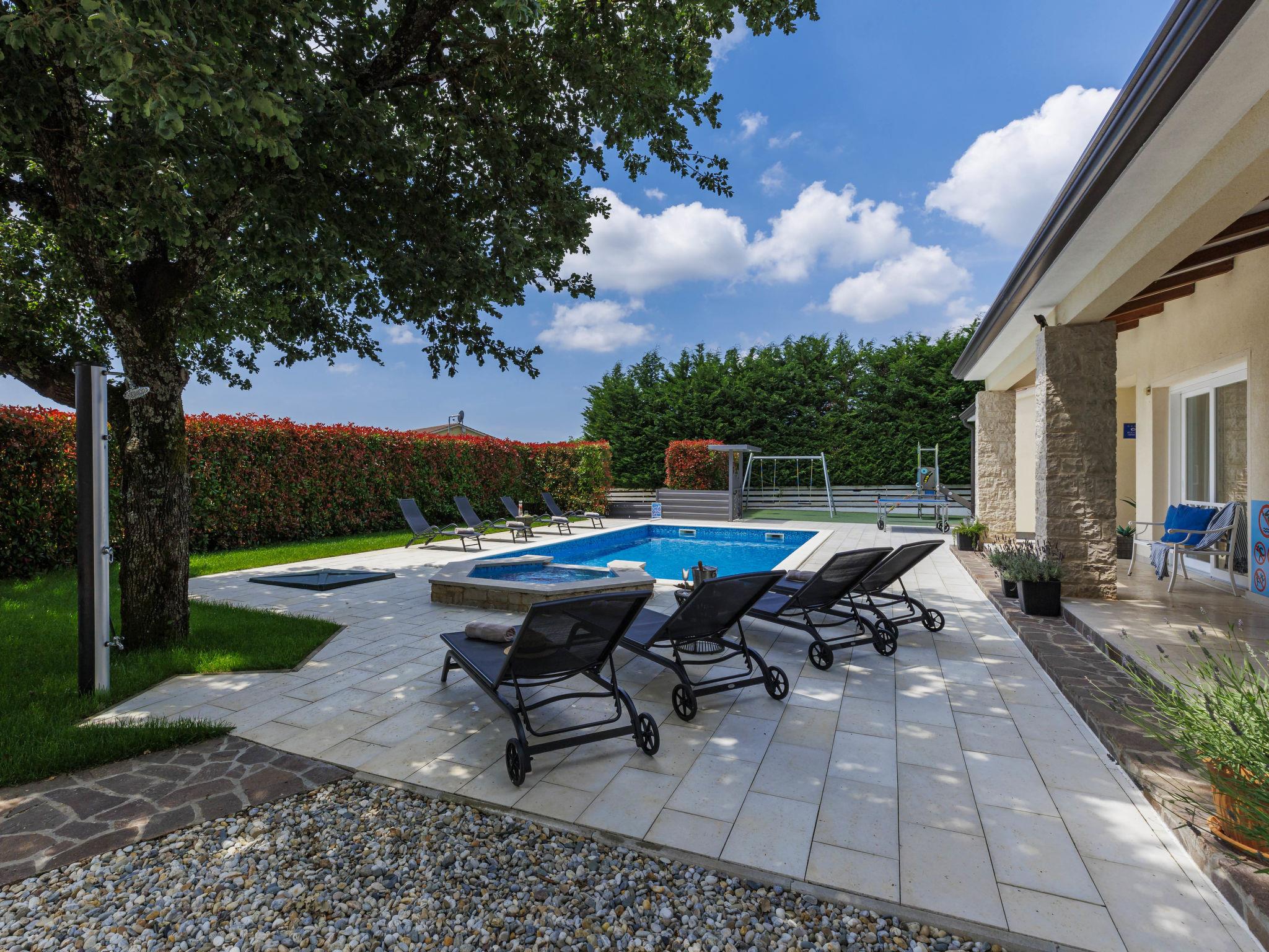 Villa "Augusta", 2 storeys. 25 km from the centre of Rovinj, 3 km from the centre of Žminj, in a secluded position, 25 km from the sea, 25 km from the beach. Private: property 1'000 m2 (fenced) with lawn, swimming pool angular (10 x 5 m, 50 m2, depth 140 cm, seasonal availability: 13.Apr. - 26.Oct.) with internal staircase. Outdoor shower, table tennis, garden furniture, barbecue house, children's playground (swing). In the house: internet access, sauna, trampoline, air conditioning, washing machine. Parking (for 4 cars) at the house on the premises. Shop 3 km, supermarket 3 km, restaurant 3 km, bar 3 km, bus stop 2 km, pebble beach 25 km, shingle beach 25 km, rocky beach 25 km. Marina 25 km, riding stable 3 km. Please note: suitable for families. The owner does not accept any youth groups.