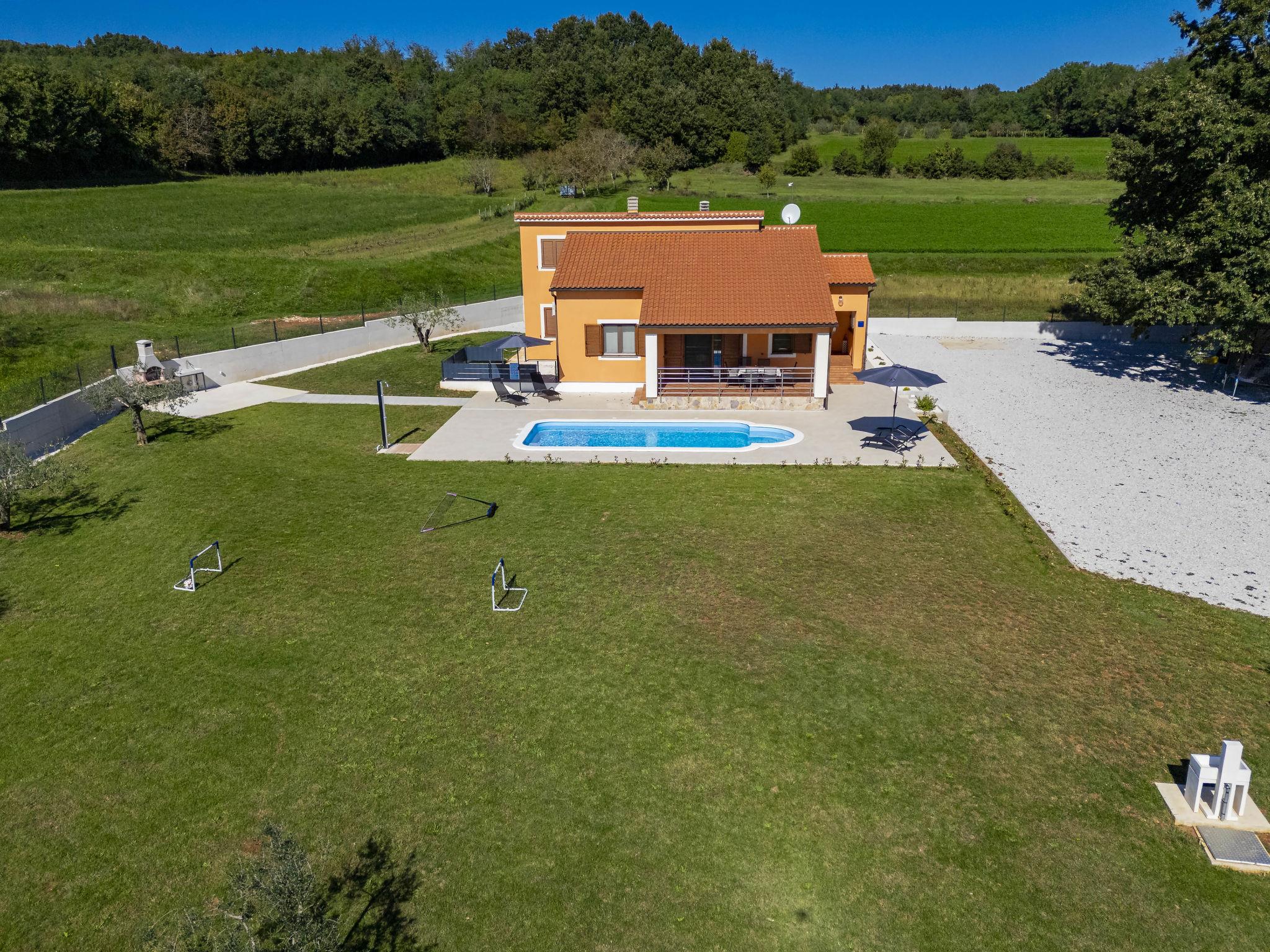 Comfortable single-family house "Tina". In the hamlet Sutivanac 9 km from the centre of Žminj, in a quiet position, 20 km from the sea, in the countryside. Private: property 2'000 m2, beautiful garden with lawn and trees, swimming pool angular (9 x 3 m, 36 m2, depth 140 cm, seasonal availability: 01.May. - 01.Nov.) with internal staircase and salt-electrolysis pool-cleaning system. Outdoor shower, barbecue (swing). In the house: internet access, washing machine, tumble dryer. Parking (for 4 cars) at the house on the premises. Shop 170 m, restaurant 8 km, bus stop 9.2 km, pebble beach 20 km. Riding stable 6000 km. Please note: suitable for families. Groups of teenagers on request only. Airfield 33 km from the property.