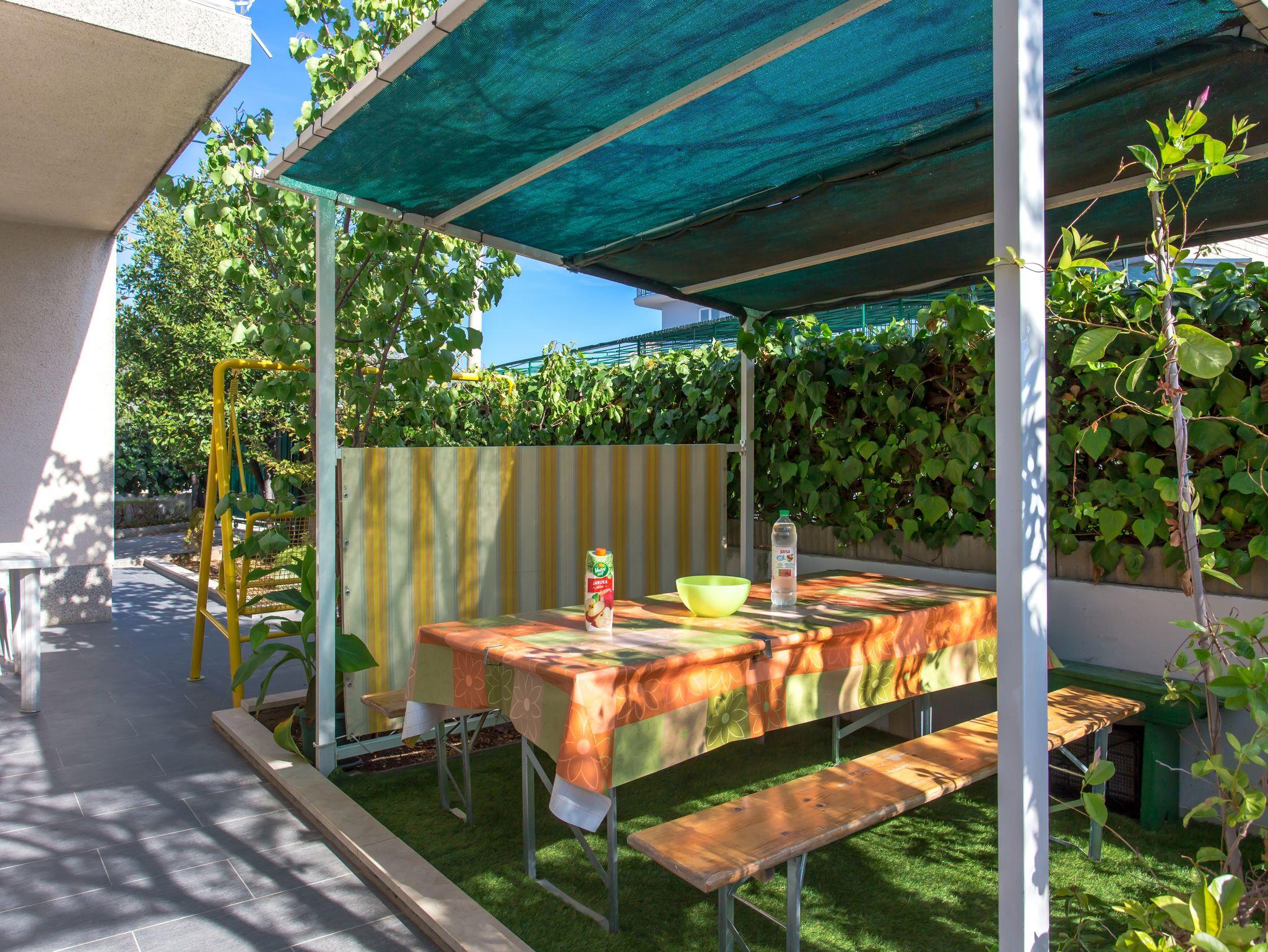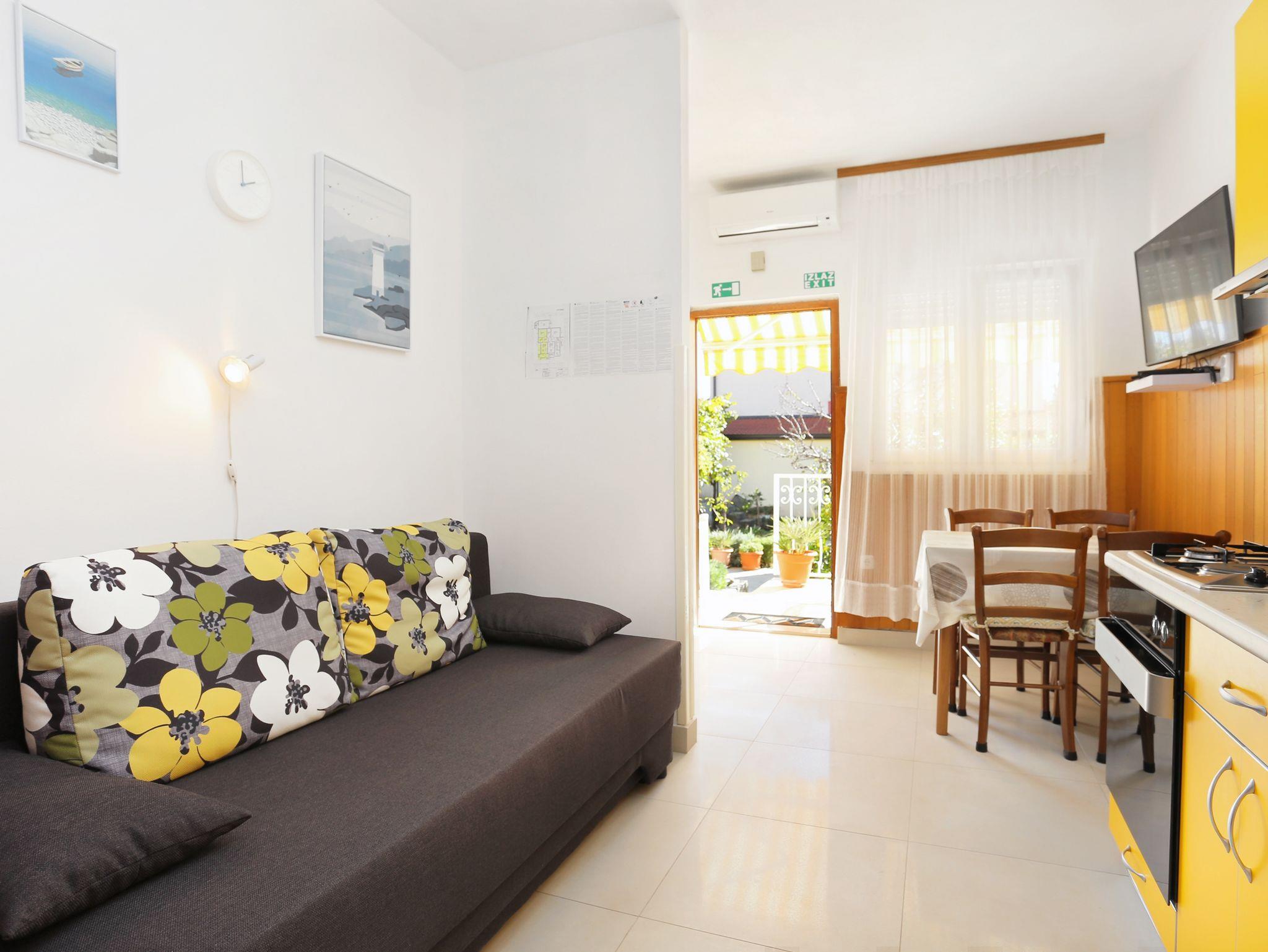 Ferienwohnung bietet Platz für 4 Gäste. Die Betten sind in Schlafzimmern, die es 1 gibt, und in Wohnzimmer, innerhalb einer Gesamtfläche von 34m2, angeordnet. Die Gäste haben eine eigene Terrasse zur Verfügung, auf der sie in warmen Sommernächten genießen können. Es ist erlaubt, Speisen auf dem Gemeinschafts-Grill vorzubereiten. In der Unterkunftseinheit besteht die Möglichkeit des Mitbringens von Haustieren gegen Aufpreis. IM PREIS INBEGRIFFEN: Kurtaxe, Endreinigung, Parkplatz, Internet, Bügeleisen, Bügelbrett, Föhn. VERBINDLICHE ZUSÄTZLICHE KOSTEN: Aufzahlung für Kurzaufenthalte (prozentualer Zuschlag pro Nächtigungsanzahl: 30% - 1, 20% - 2, 10% - 3). UNVERBINDLICHE ZUSÄTZLICHE KOSTEN: Klimatisierung (5,00 € pro Nacht), Haustiere (5,00 € pro Nacht). Die Verfügbarkeit zusätzlicher Dienstleistungen in Ihrem reservierten Termin und die Preise derselben (falls nicht aufgeführt) müssen im Voraus überprüft werden. Zusätzliche Dienstleistungen die in der Zahlungsaufforderung nicht aufgeführt sind werden direkt beim Vermieter bezahlt, angenommen der Gast nutzt auch diese.