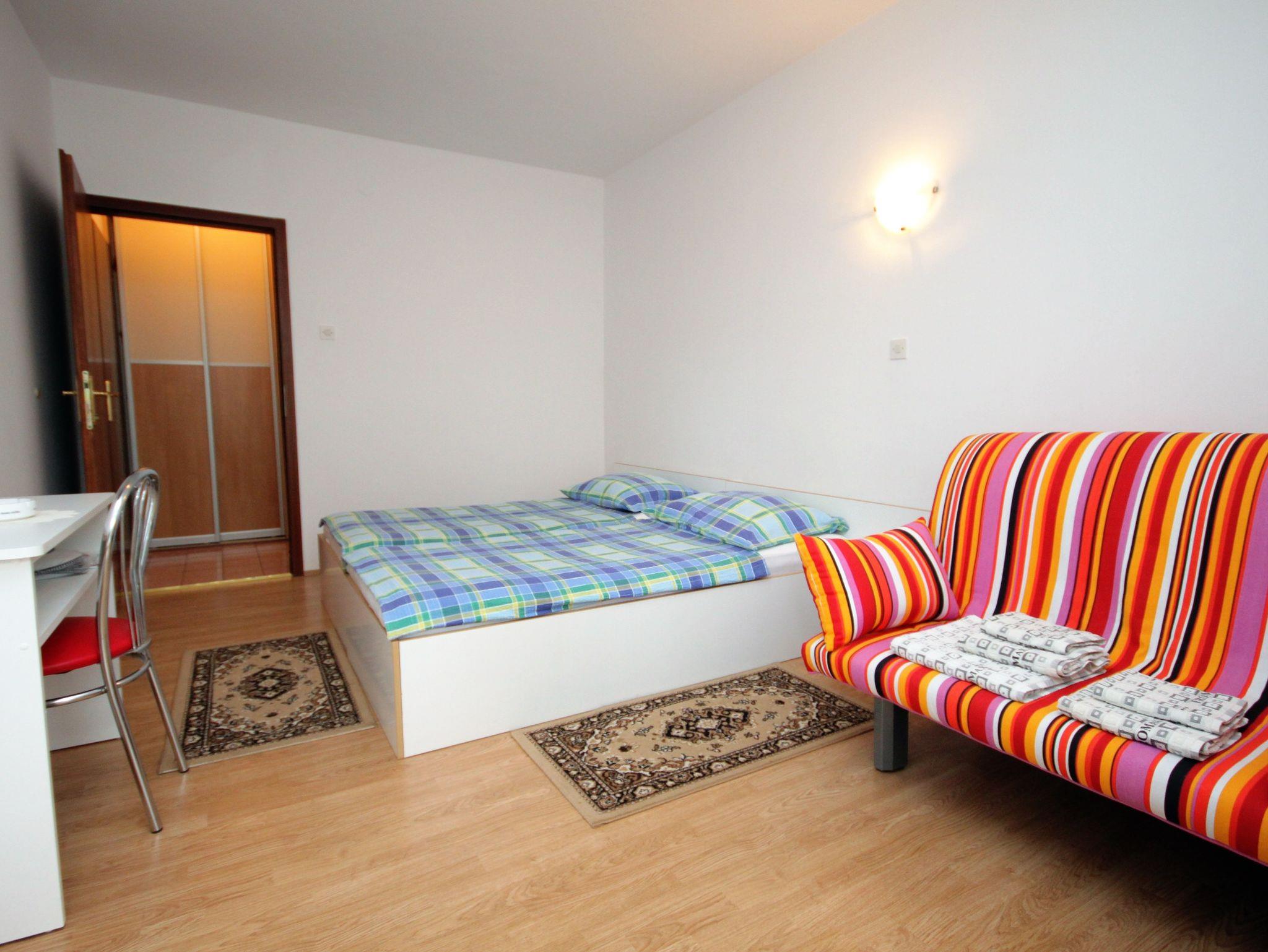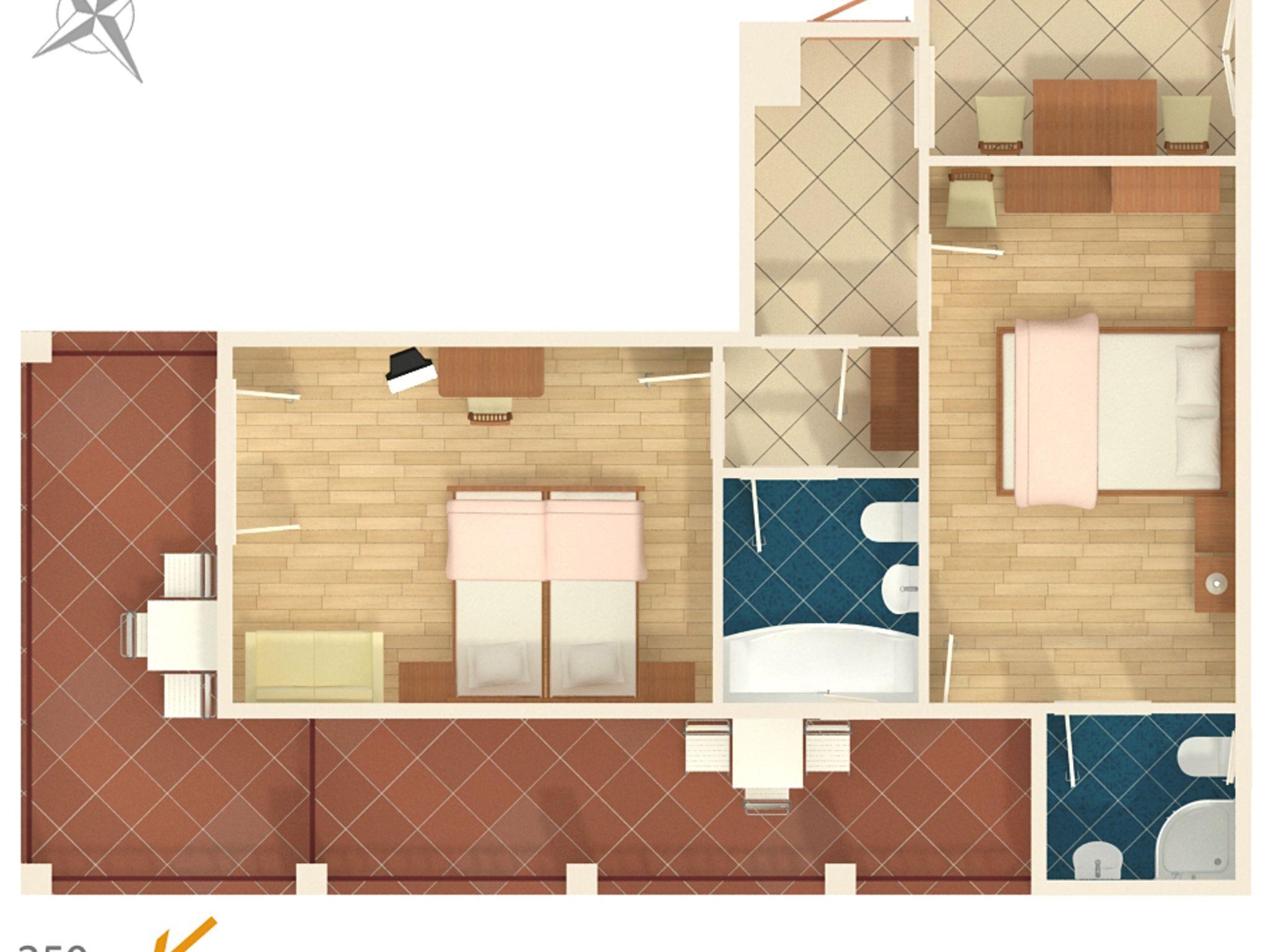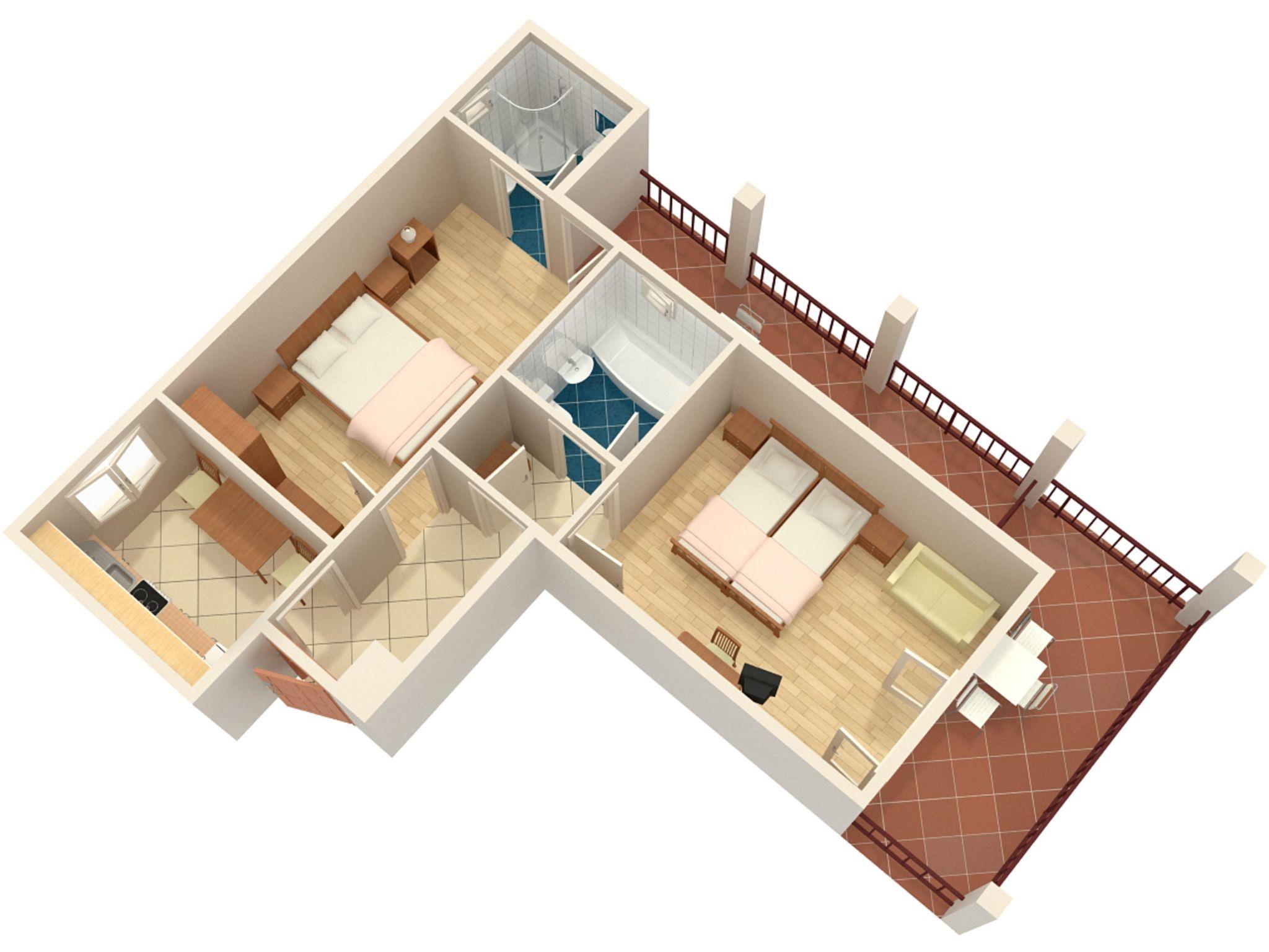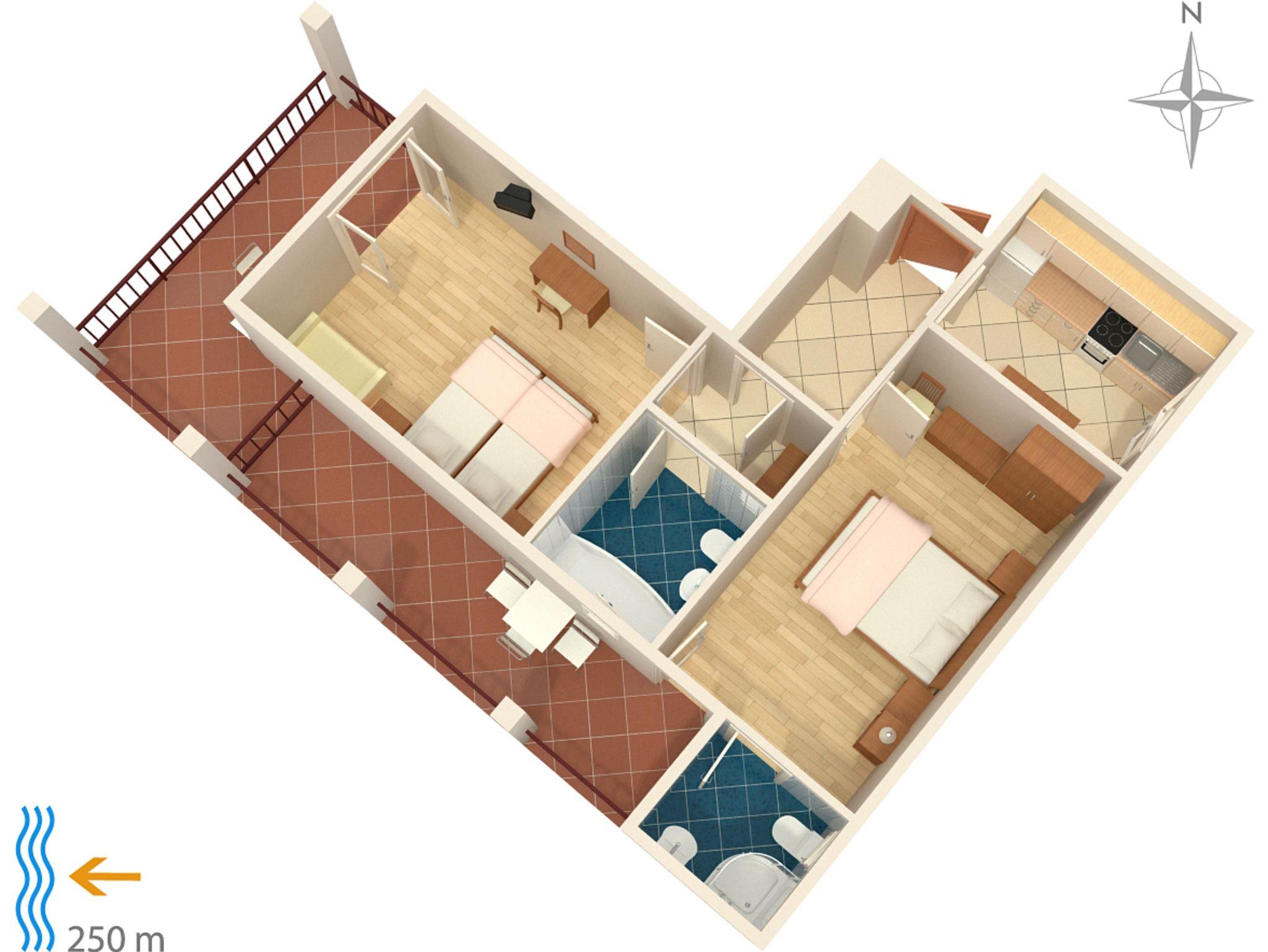 Ferienwohnung bietet Platz für 6 Gäste. Die Betten sind in Schlafzimmern, die es 2 gibt, innerhalb einer Gesamtfläche von 42m2, angeordnet. Die Gäste haben eine eigene Terrasse zur Verfügung, auf der sie in warmen Sommernächten genießen können. Das Apartment bietet Meerblick. Es ist erlaubt, Speisen auf dem Gemeinschafts-Grill vorzubereiten. IM PREIS INBEGRIFFEN: Kurtaxe, Endreinigung, Zentralheizung, Parkplatz, Internet, tragbarer Grill. VERBINDLICHE ZUSÄTZLICHE KOSTEN: Aufzahlung für Kurzaufenthalte (prozentualer Zuschlag pro Nächtigungsanzahl: 30% - 1, 20% - 2, 10% - 3). UNVERBINDLICHE ZUSÄTZLICHE KOSTEN: Klimatisierung (5,00 € pro Nacht), Wäschewaschen (5,00 € Waschen). Die Verfügbarkeit zusätzlicher Dienstleistungen in Ihrem reservierten Termin und die Preise derselben (falls nicht aufgeführt) müssen im Voraus überprüft werden. Zusätzliche Dienstleistungen die in der Zahlungsaufforderung nicht aufgeführt sind werden direkt beim Vermieter bezahlt, angenommen der Gast nutzt auch diese.