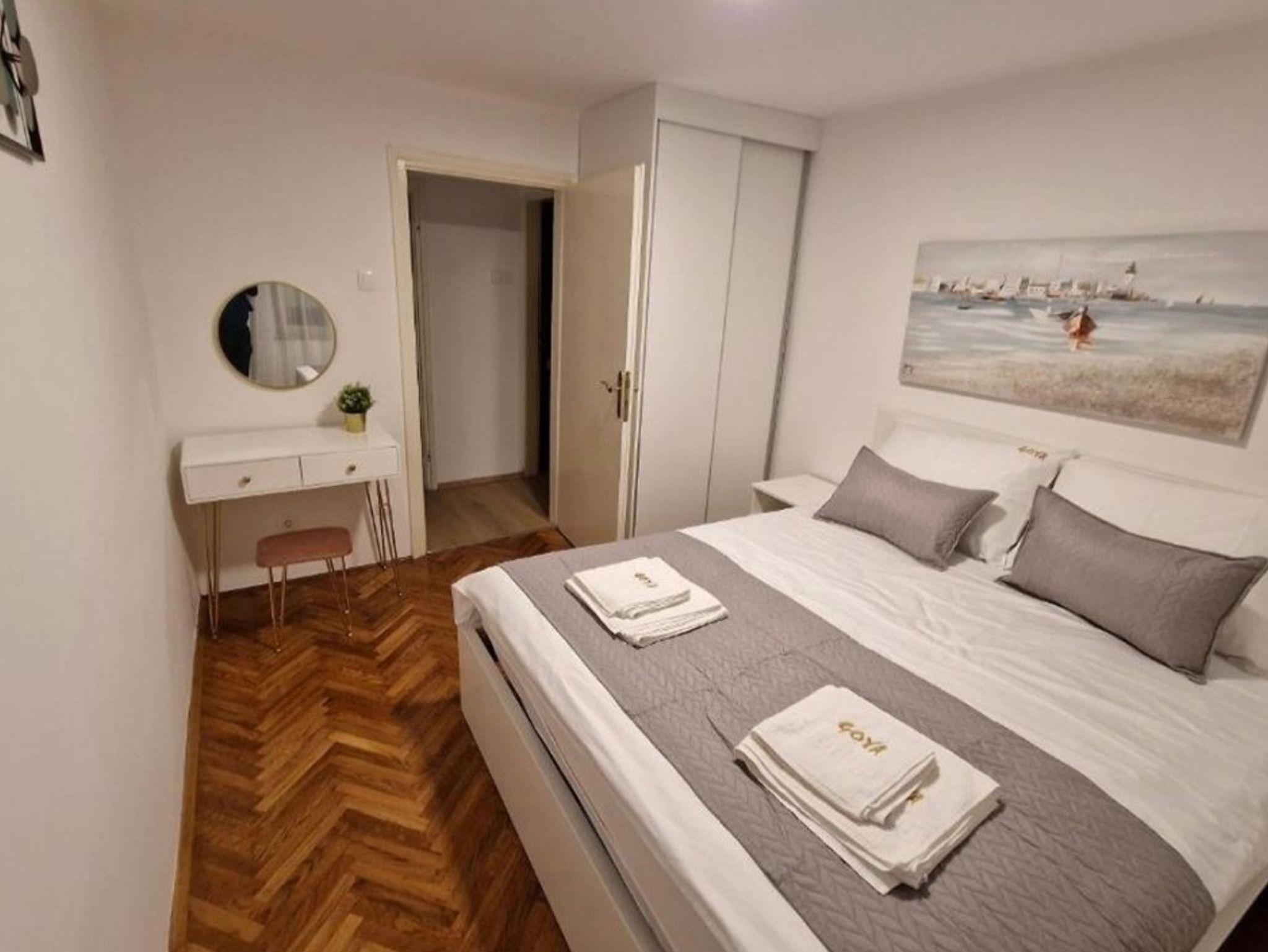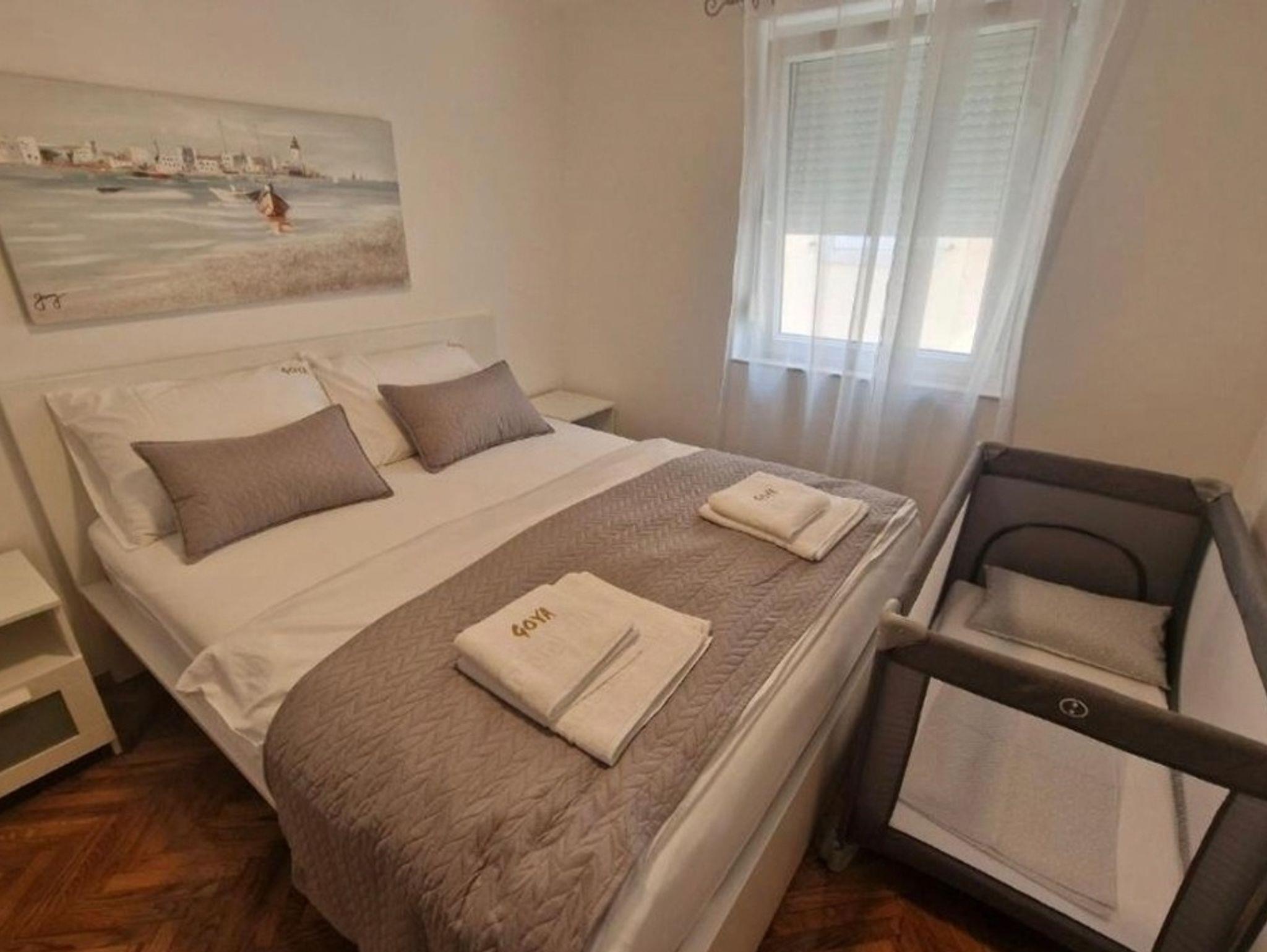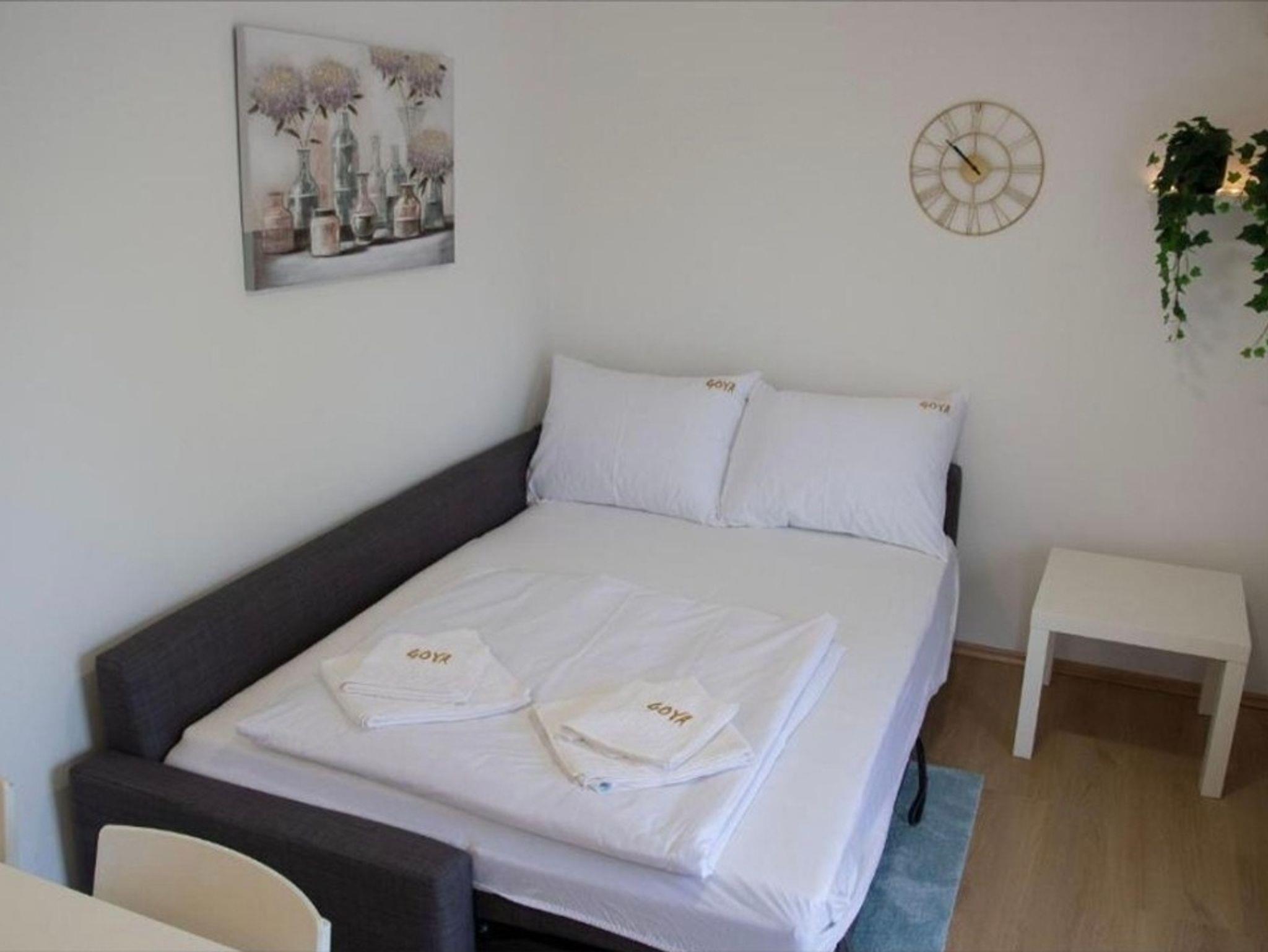 Ferienwohnung bietet Platz für 4 Gäste. Die Betten sind in Schlafzimmern, die es 1 gibt, und in Wohnzimmer, innerhalb einer Gesamtfläche von 33m2, angeordnet. Die Gäste haben einen eigenen Balkon zur Verfügung, auf der sie in warmen Sommernächten genießen können. Das Apartment bietet Meerblick. IM PREIS INBEGRIFFEN: Kurtaxe, Endreinigung, Klimatisierung, Internet, Kinderbett, Bügeleisen, Bügelbrett, Föhn. Die Verfügbarkeit zusätzlicher Dienstleistungen in Ihrem reservierten Termin und die Preise derselben (falls nicht aufgeführt) müssen im Voraus überprüft werden. Zusätzliche Dienstleistungen die in der Zahlungsaufforderung nicht aufgeführt sind werden direkt beim Vermieter bezahlt, angenommen der Gast nutzt auch diese.