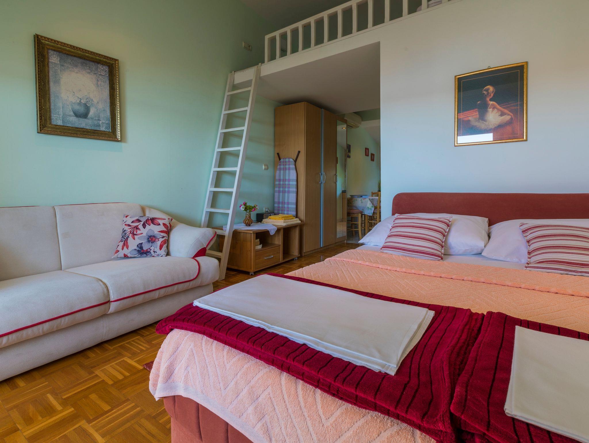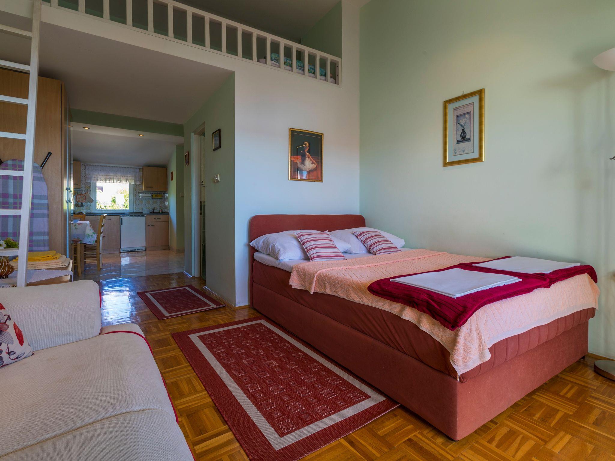 Studio bietet Platz für 3 Gäste. Die Betten sind in Schlafzimmern, die es 1 gibt, innerhalb einer Gesamtfläche von 30m2, angeordnet. Die Gäste haben eine eigene Terrasse zur Verfügung, auf der sie in warmen Sommernächten genießen können. Das Studio-Apartment bietet Meerblick. Es ist erlaubt, Speisen auf dem Gemeinschafts-Grill vorzubereiten. IM PREIS INBEGRIFFEN: Kurtaxe, Endreinigung, Klimatisierung, Parkplatz, Internet, Fahrrad, Kinderbett, Bügeleisen, Bügelbrett, Föhn. VERBINDLICHE ZUSÄTZLICHE KOSTEN: Aufzahlung für Kurzaufenthalte (prozentualer Zuschlag pro Nächtigungsanzahl: 30% - 1, 20% - 2, 10% - 3). Die Verfügbarkeit zusätzlicher Dienstleistungen in Ihrem reservierten Termin und die Preise derselben (falls nicht aufgeführt) müssen im Voraus überprüft werden. Zusätzliche Dienstleistungen die in der Zahlungsaufforderung nicht aufgeführt sind werden direkt beim Vermieter bezahlt, angenommen der Gast nutzt auch diese. Ermäßigung auf den Grundpreis: Gratistag 28=25 (bei einem Aufenthalt von 28 oder mehr Tagen erhalten Sie 3 kostenlose Tage für den Aufenthalt bis 31.12.26).
