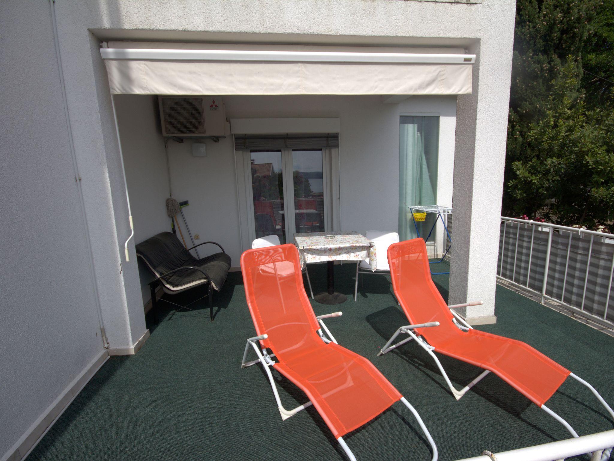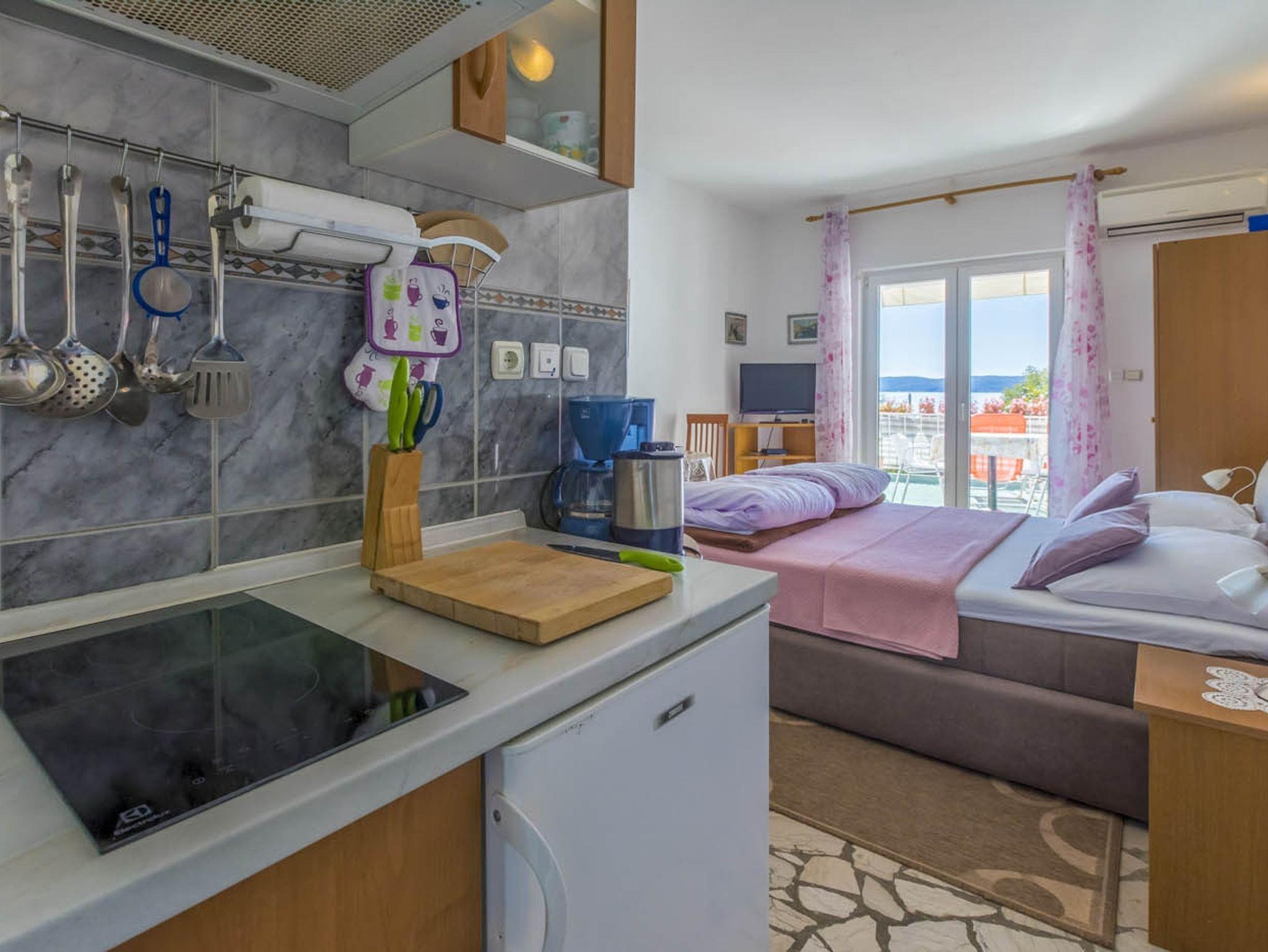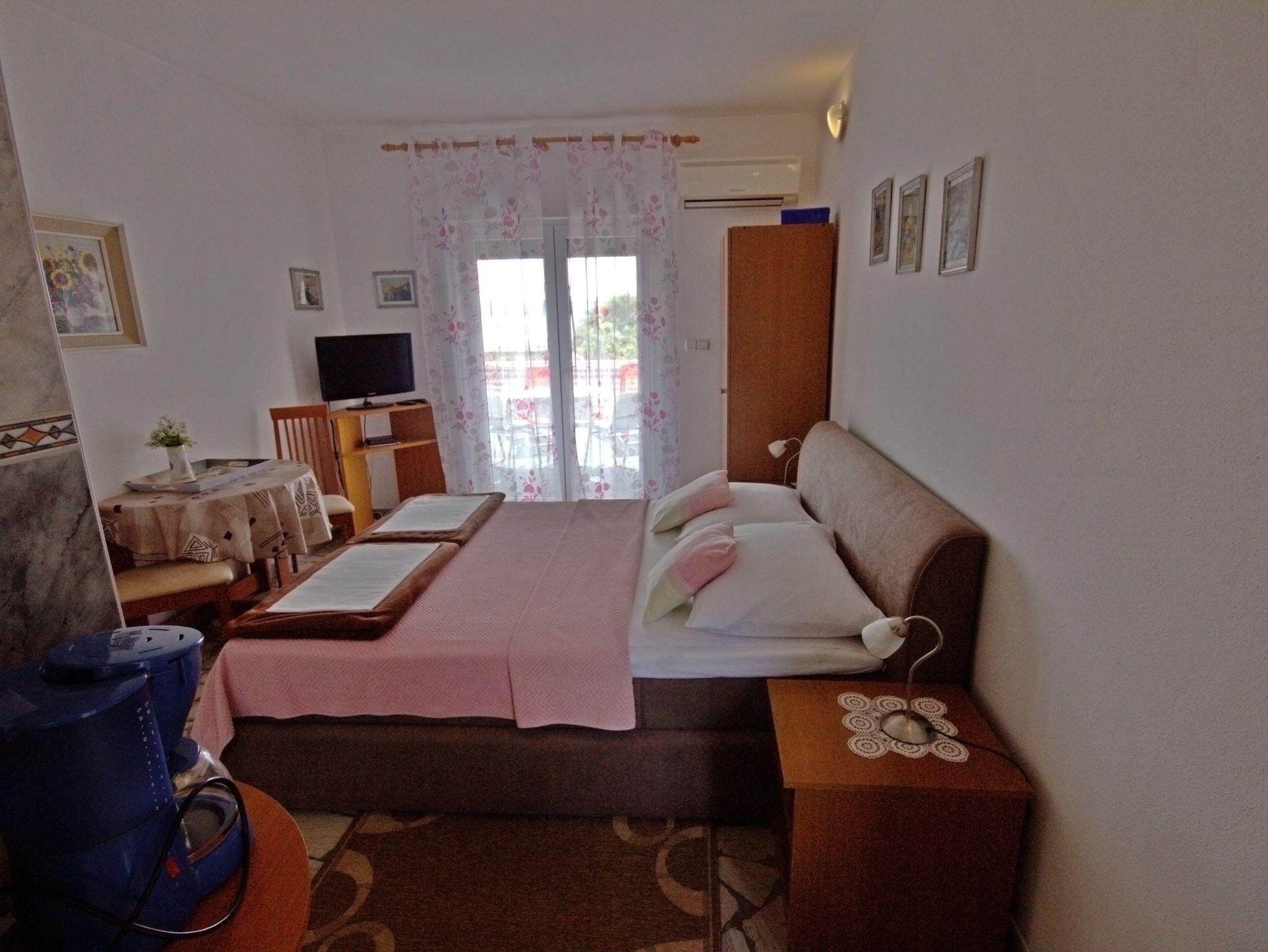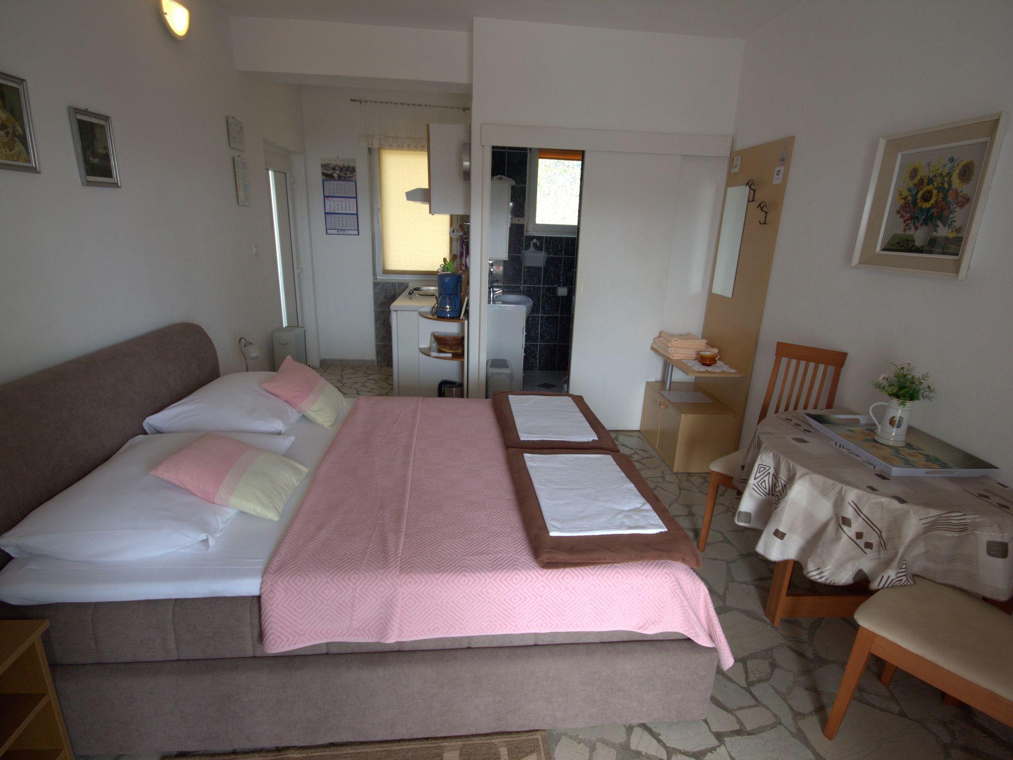 Studio bietet Platz für 2 Gäste. Die Betten sind in Schlafzimmern, die es 1 gibt, innerhalb einer Gesamtfläche von 20m2, angeordnet. Die Gäste haben eine eigene Terrasse zur Verfügung, auf der sie in warmen Sommernächten genießen können. Das Studio-Apartment bietet Meerblick. Es ist erlaubt, Speisen auf dem Gemeinschafts-Grill vorzubereiten. IM PREIS INBEGRIFFEN: Kurtaxe, Endreinigung, Klimatisierung, Parkplatz, Internet, Fahrrad, Kinderbett, Bügeleisen, Bügelbrett, Föhn. VERBINDLICHE ZUSÄTZLICHE KOSTEN: Aufzahlung für Kurzaufenthalte (prozentualer Zuschlag pro Nächtigungsanzahl: 30% - 1, 20% - 2, 10% - 3). Die Verfügbarkeit zusätzlicher Dienstleistungen in Ihrem reservierten Termin und die Preise derselben (falls nicht aufgeführt) müssen im Voraus überprüft werden. Zusätzliche Dienstleistungen die in der Zahlungsaufforderung nicht aufgeführt sind werden direkt beim Vermieter bezahlt, angenommen der Gast nutzt auch diese. Ermäßigung auf den Grundpreis: Gratistag 28=25 (bei einem Aufenthalt von 28 oder mehr Tagen erhalten Sie 3 kostenlose Tage für den Aufenthalt bis 31.12.26).
