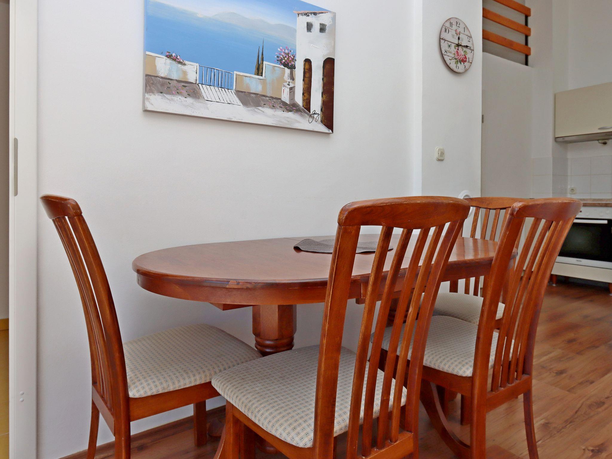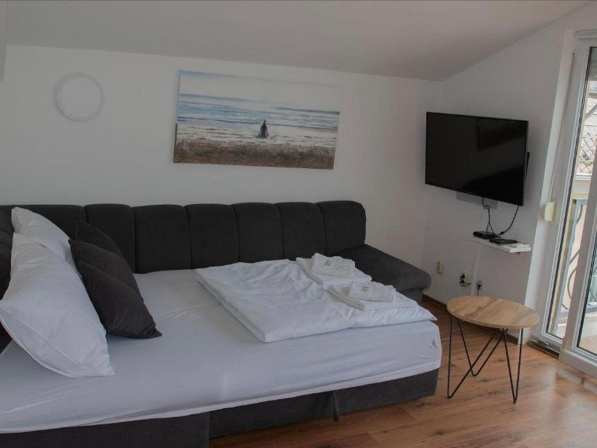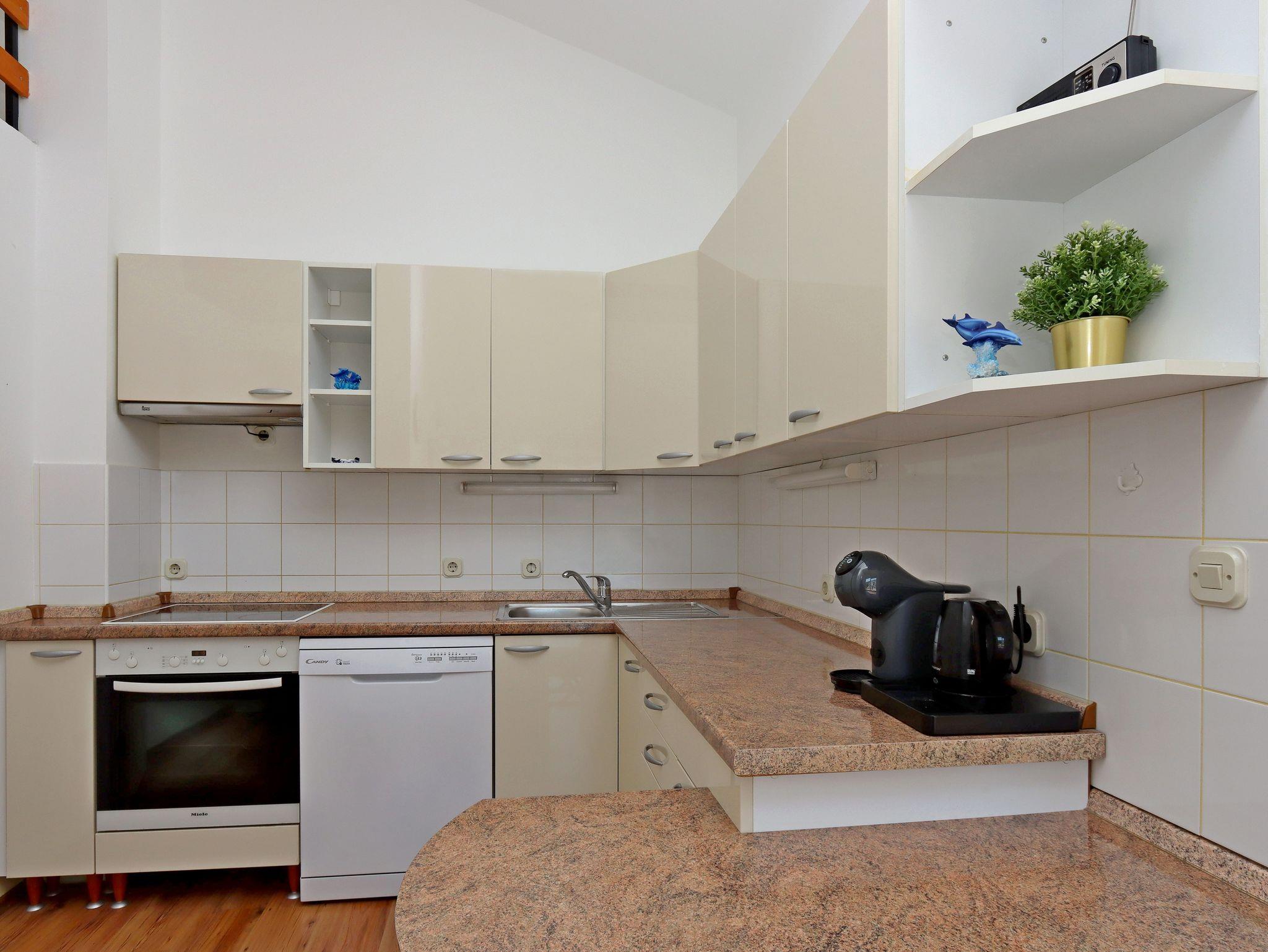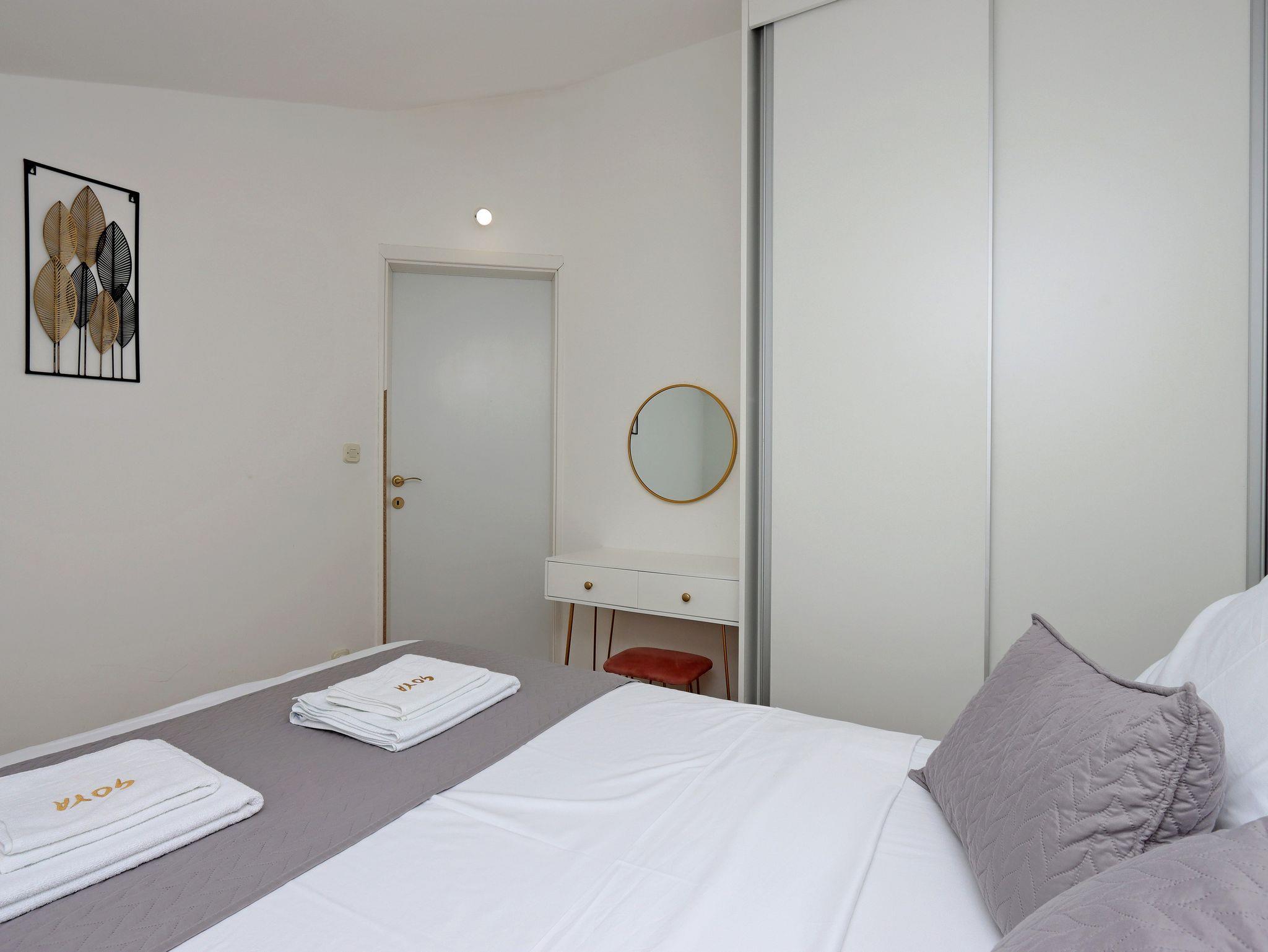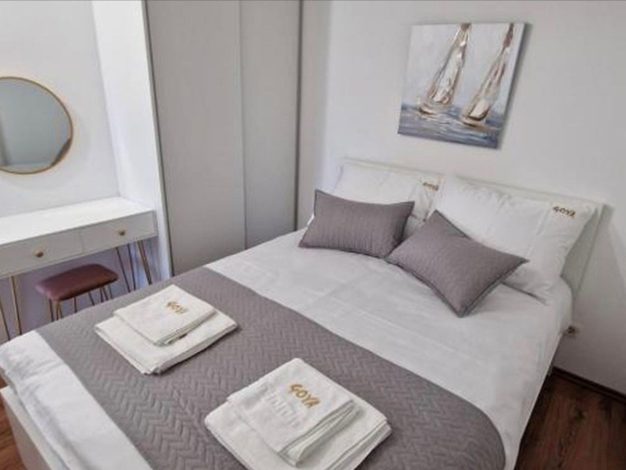 Ferienwohnung bietet Platz für 4 Gäste. Die Betten sind in Schlafzimmern, die es 1 gibt, und in Wohnzimmer, innerhalb einer Gesamtfläche von 35m2, angeordnet. Die Gäste haben einen eigenen Balkon zur Verfügung, auf der sie in warmen Sommernächten genießen können. Das Apartment bietet Meerblick. IM PREIS INBEGRIFFEN: Kurtaxe, Endreinigung, Klimatisierung, Internet, Kinderbett, Bügeleisen, Bügelbrett, Föhn. Die Verfügbarkeit zusätzlicher Dienstleistungen in Ihrem reservierten Termin und die Preise derselben (falls nicht aufgeführt) müssen im Voraus überprüft werden. Zusätzliche Dienstleistungen die in der Zahlungsaufforderung nicht aufgeführt sind werden direkt beim Vermieter bezahlt, angenommen der Gast nutzt auch diese.