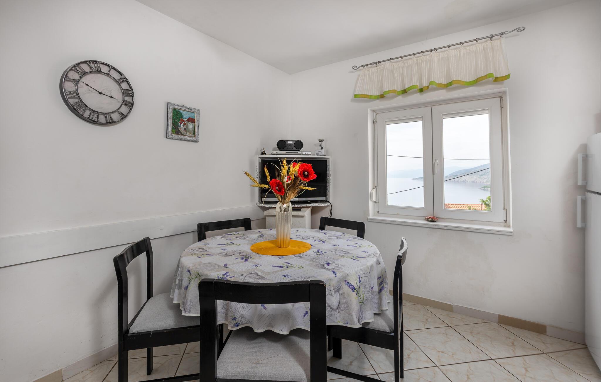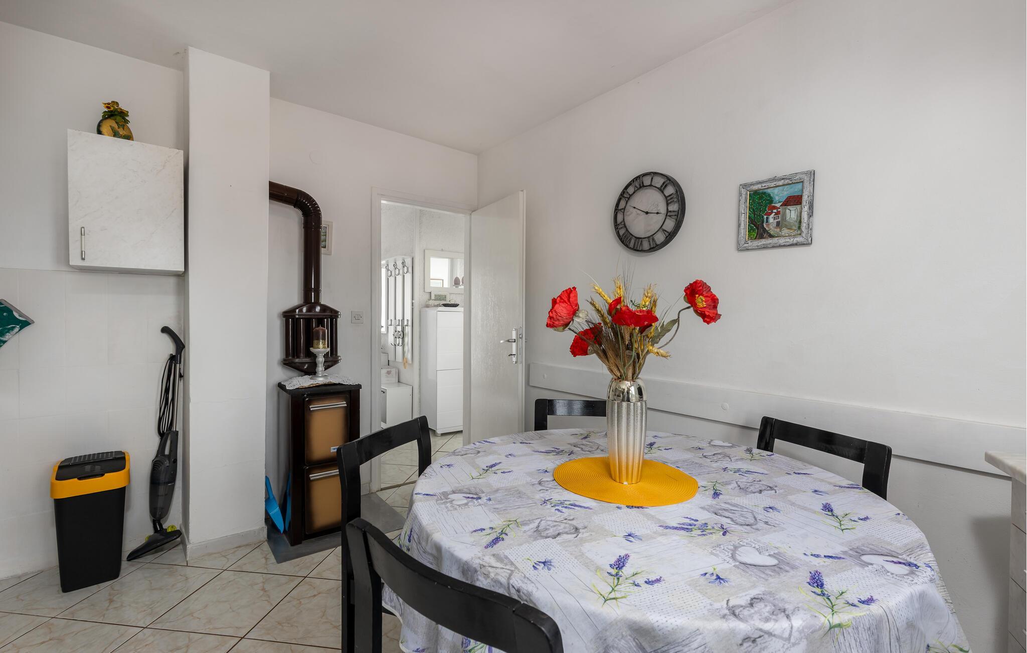Lassen Sie sich von der atemberaubenden Kulisse der Adriaküste verzaubern, die Ihnen diese freundliche Ferienwohnung bietet. Starten Sie Ihren Tag in der hellen, gemütlichen Küche, die bestens ausgestattet ist, um köstliche Mahlzeiten zuzubereiten. Am Esstisch mit bunten Sitzpolstern genießen Sie Ihr Frühstück mit Blick ins Grüne. Planen Sie hier Ihre nächsten Ausflüge und veranstalten Sie gesellige Spieleabende.