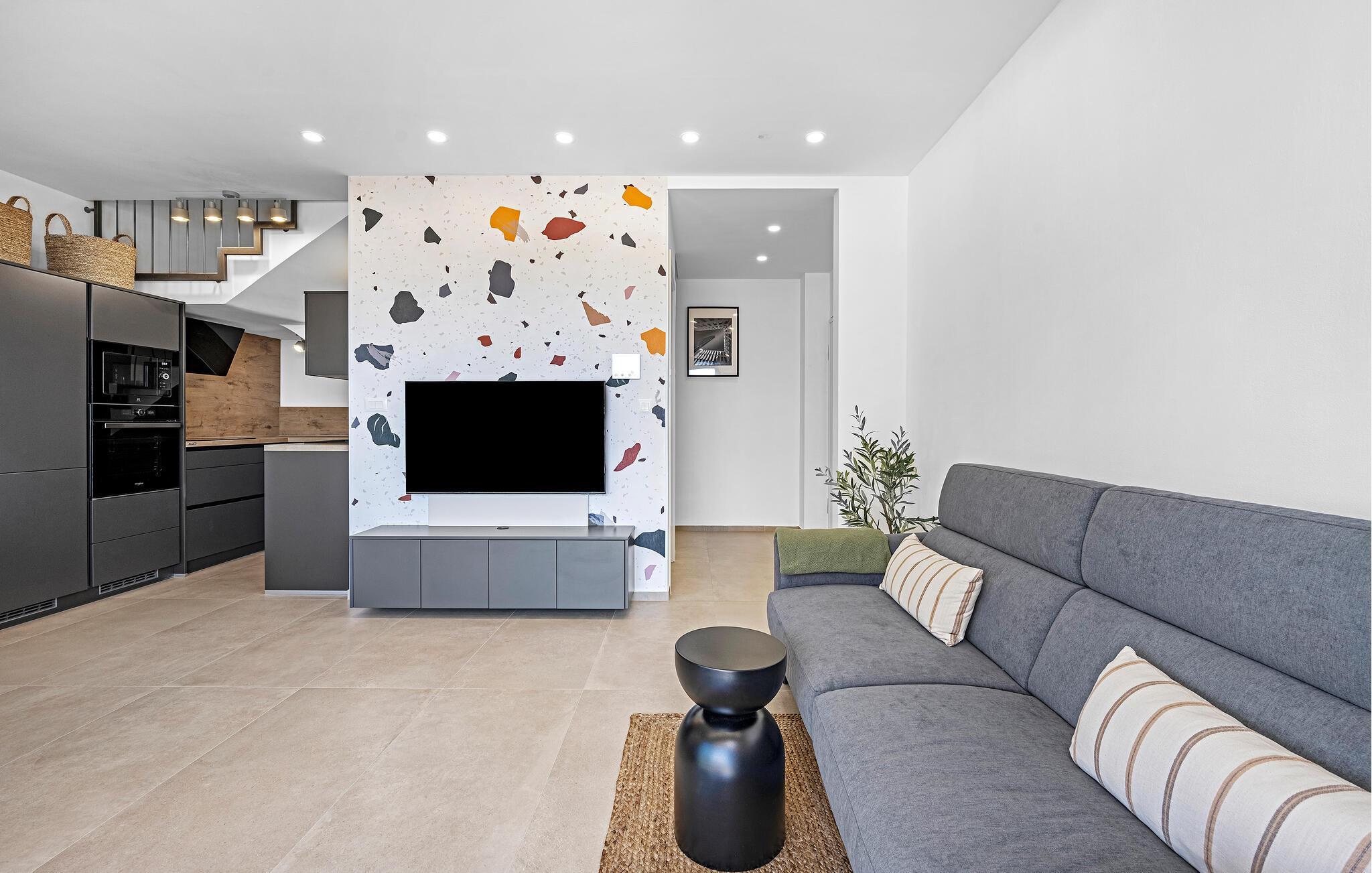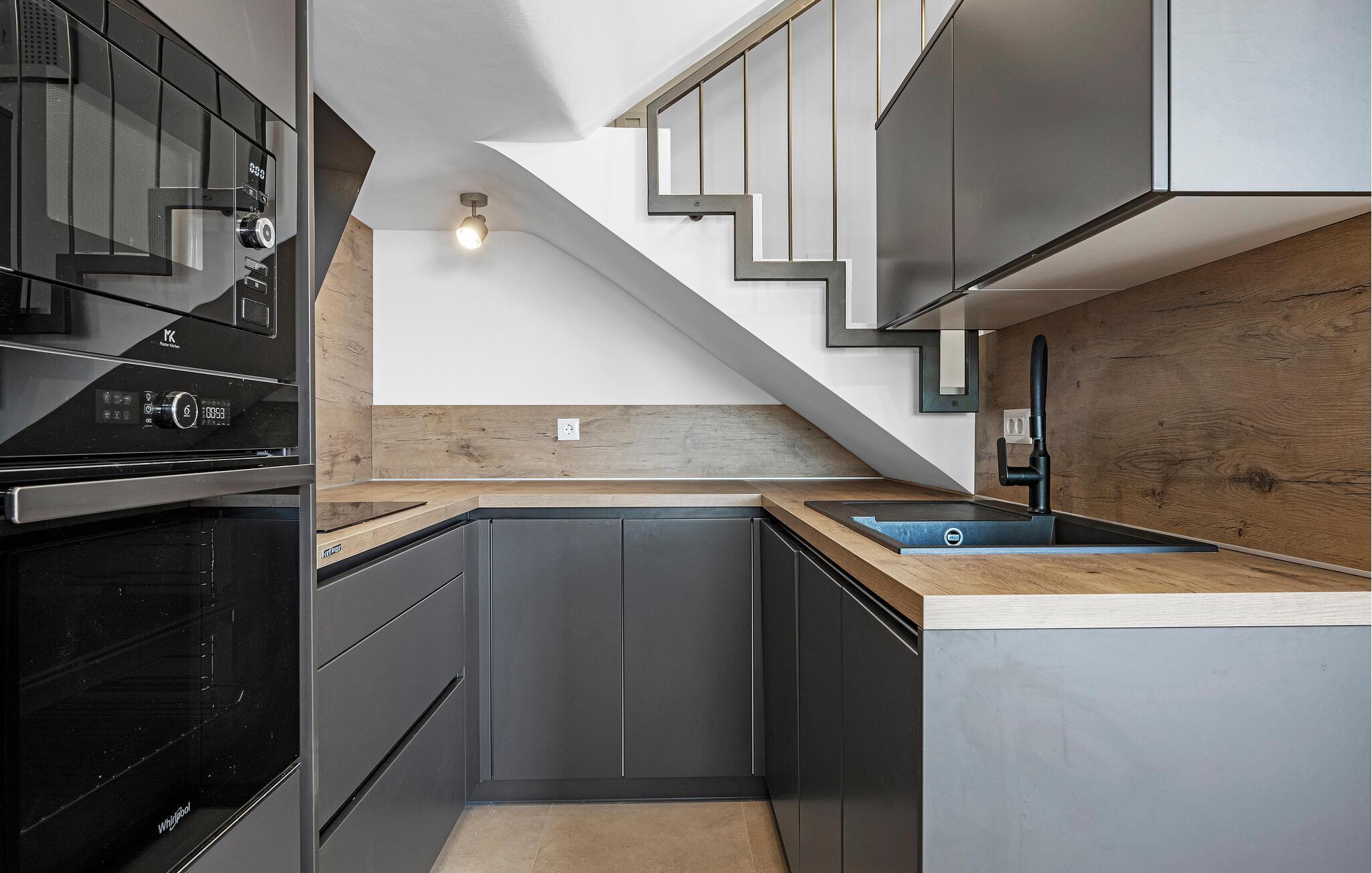 Ihre stilvoll eingerichtete Ferienwohnung kombiniert ruhige Lage mit Strandnähe und bietet gleichzeitig eine ideale Ausgangsbasis für Ausflüge in die Umgebung. Die durchdachte Raumaufteilung auf zwei Etagen, das klare Design und die hochwertigen Möbel sorgen für ein angenehmes Wohngefühl. Bereiten Sie Ihre Mahlzeiten in der eleganten Küche zu, nehmen Sie Platz am Esstisch oder machen Sie es sich auf dem gemütlichen Sofa bequem.