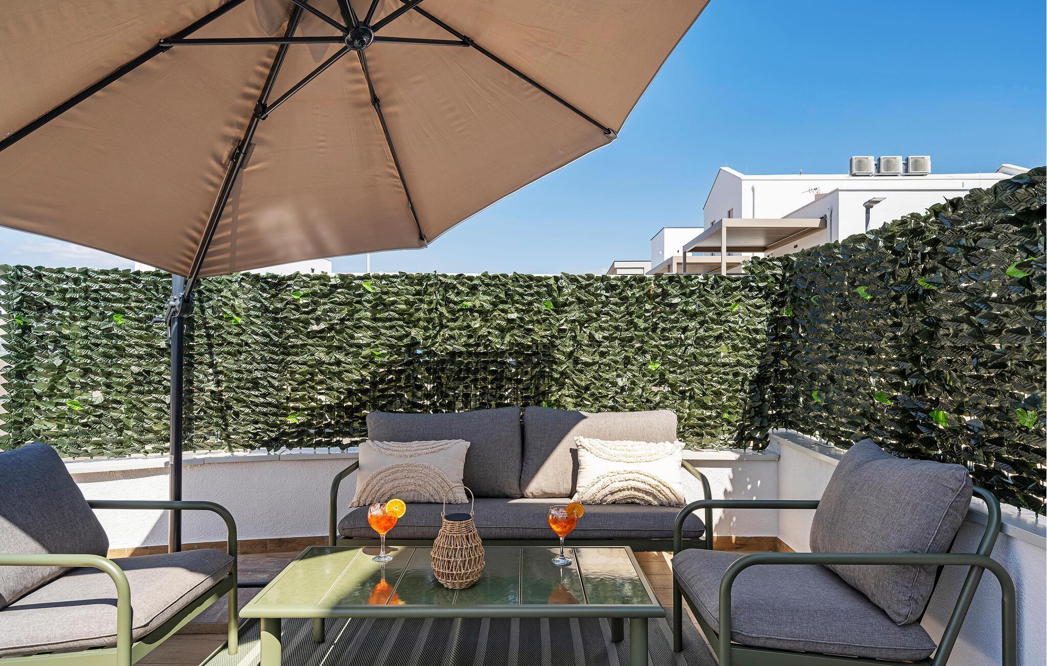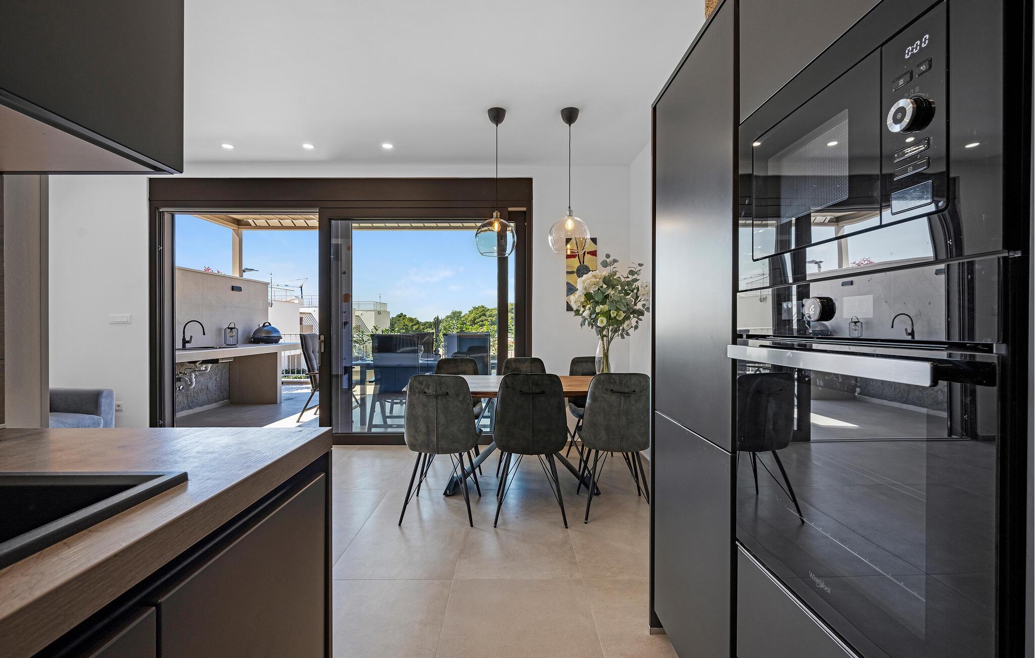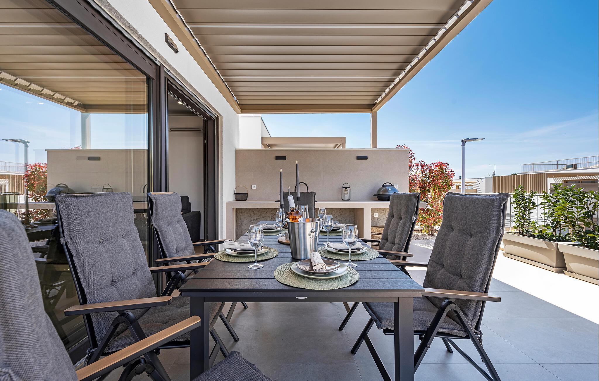 Verbringen Sie schöne Stunden im Freien auf der überdachten Terrasse, die mit einer Außenküche ausgestattet ist und Ihnen Meerblick bietet. Genießen Sie Ihre Mahlzeiten unter freiem Himmel oder lehnen Sie sich zurück und lassen Sie den Tag mit einem Glas Wein ausklingen. Auf den Lounge-Möbeln unter dem Sonnenschirm finden Sie Ruhe und Erholung nach Ihrem Strandbesuch, der nur wenige Schritte entfernt liegt.