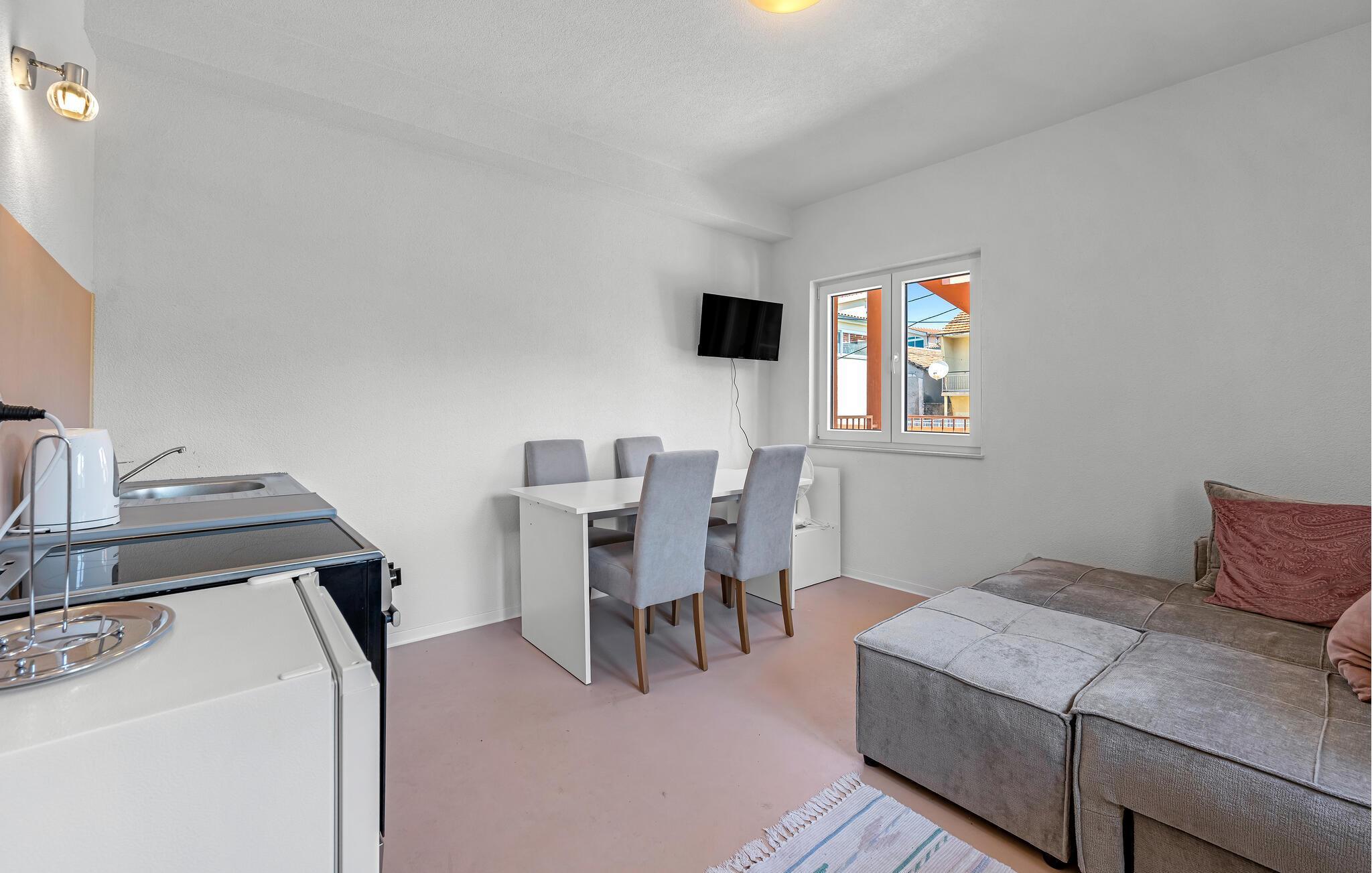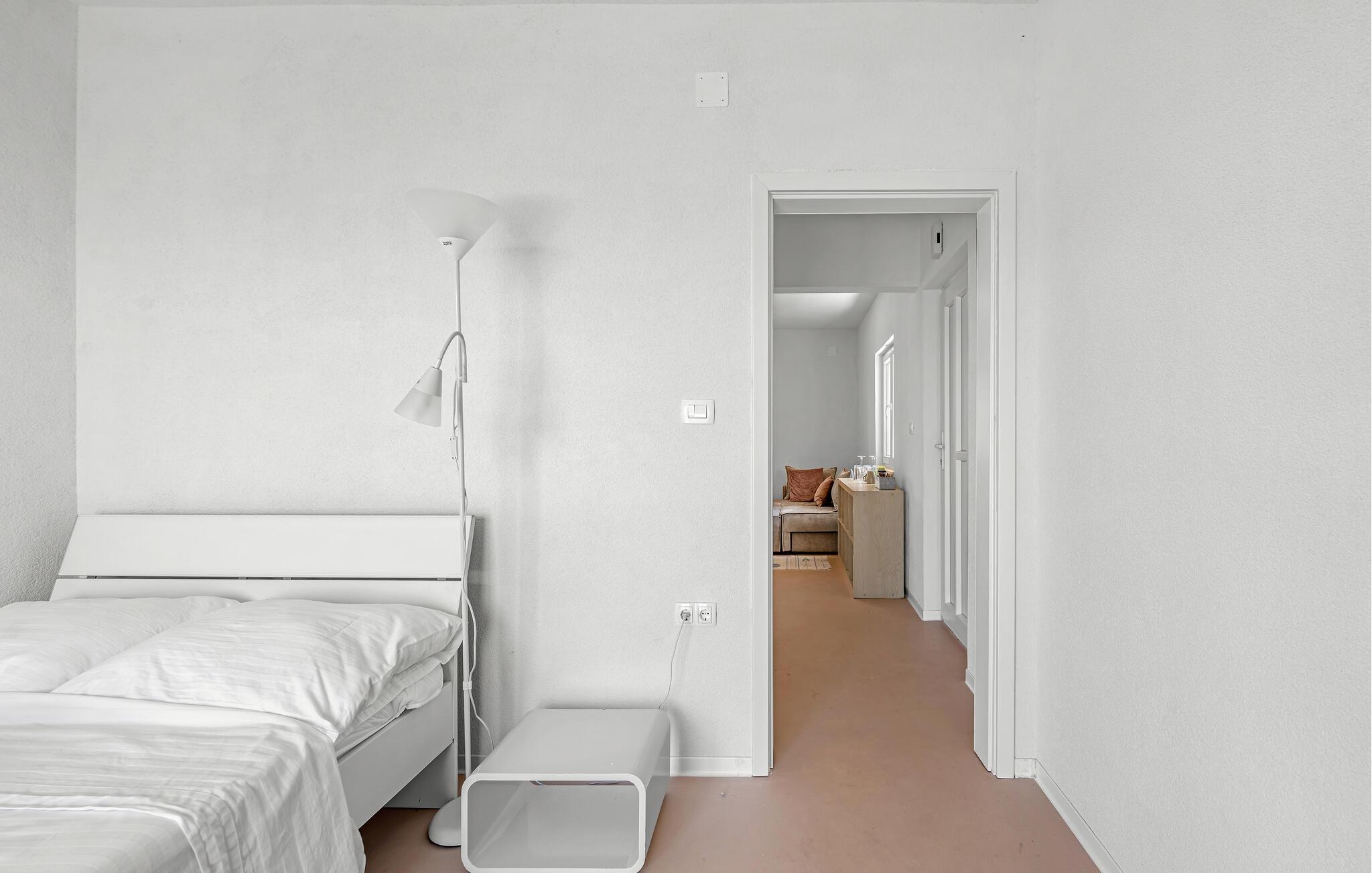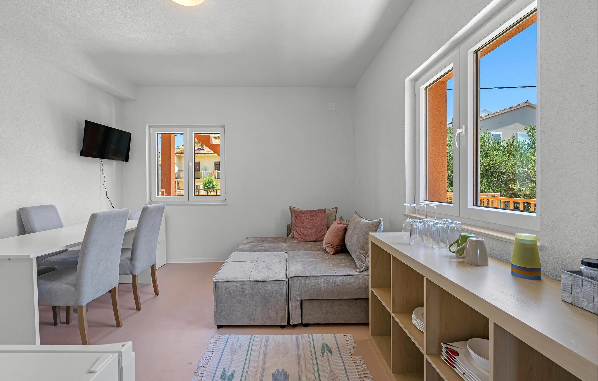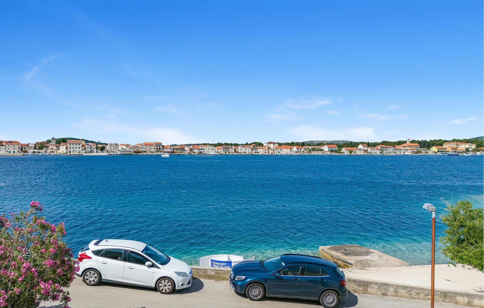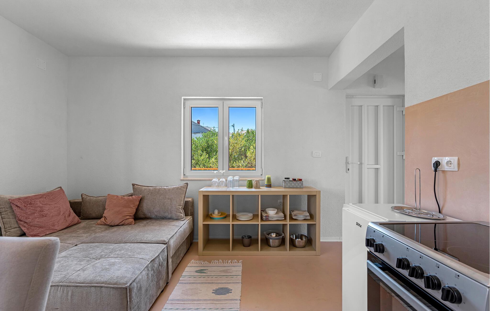 Diese helle und geschmackvoll eingerichtete Ferienwohnung liegt so nah am Strand, dass Sie das türkisfarbene Meerwasser vor Ihrer Haustür fast als Ihre Badewanne betrachten können. Zaubern Sie in der offenen Küche mediterrane Gerichte, planen Sie Ihre Unternehmungen im freundlichen Wohnbereich und streamen Sie nach einem sonnigen Tag abends Ihre Lieblingsserie auf dem gemütlichen Sofa.