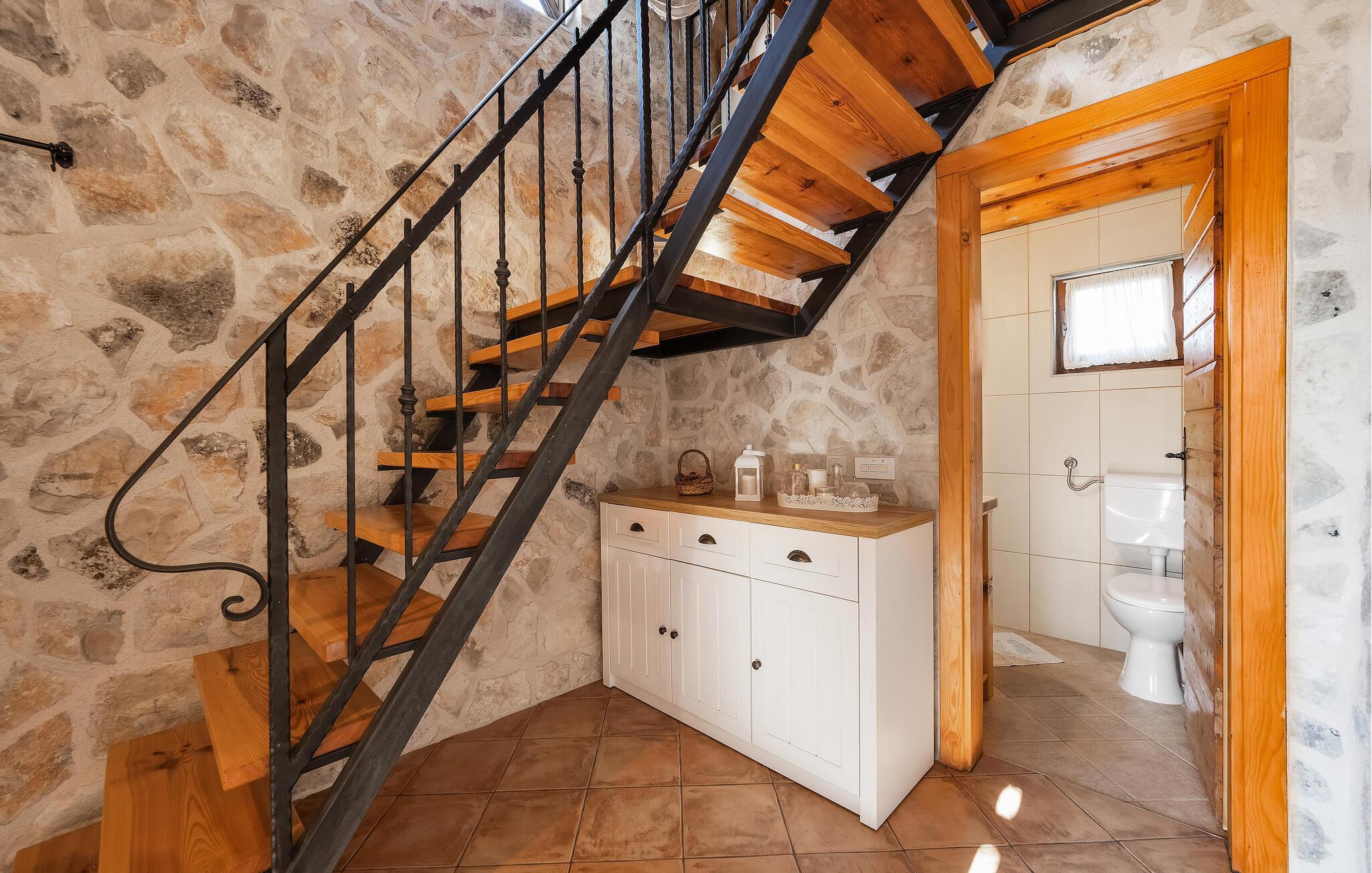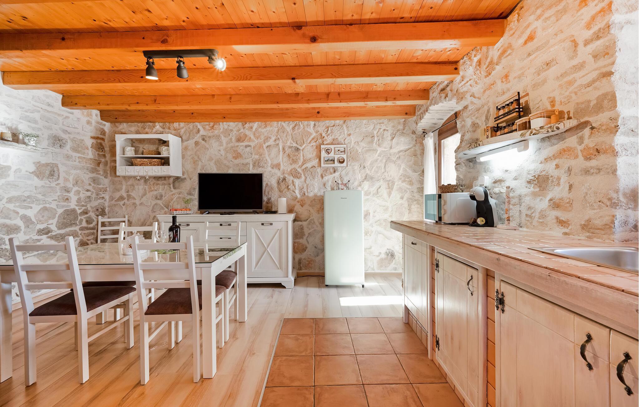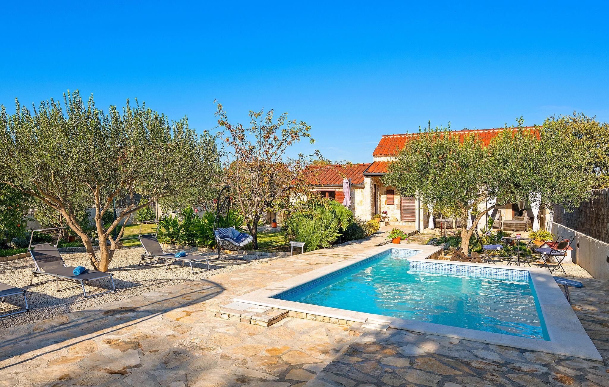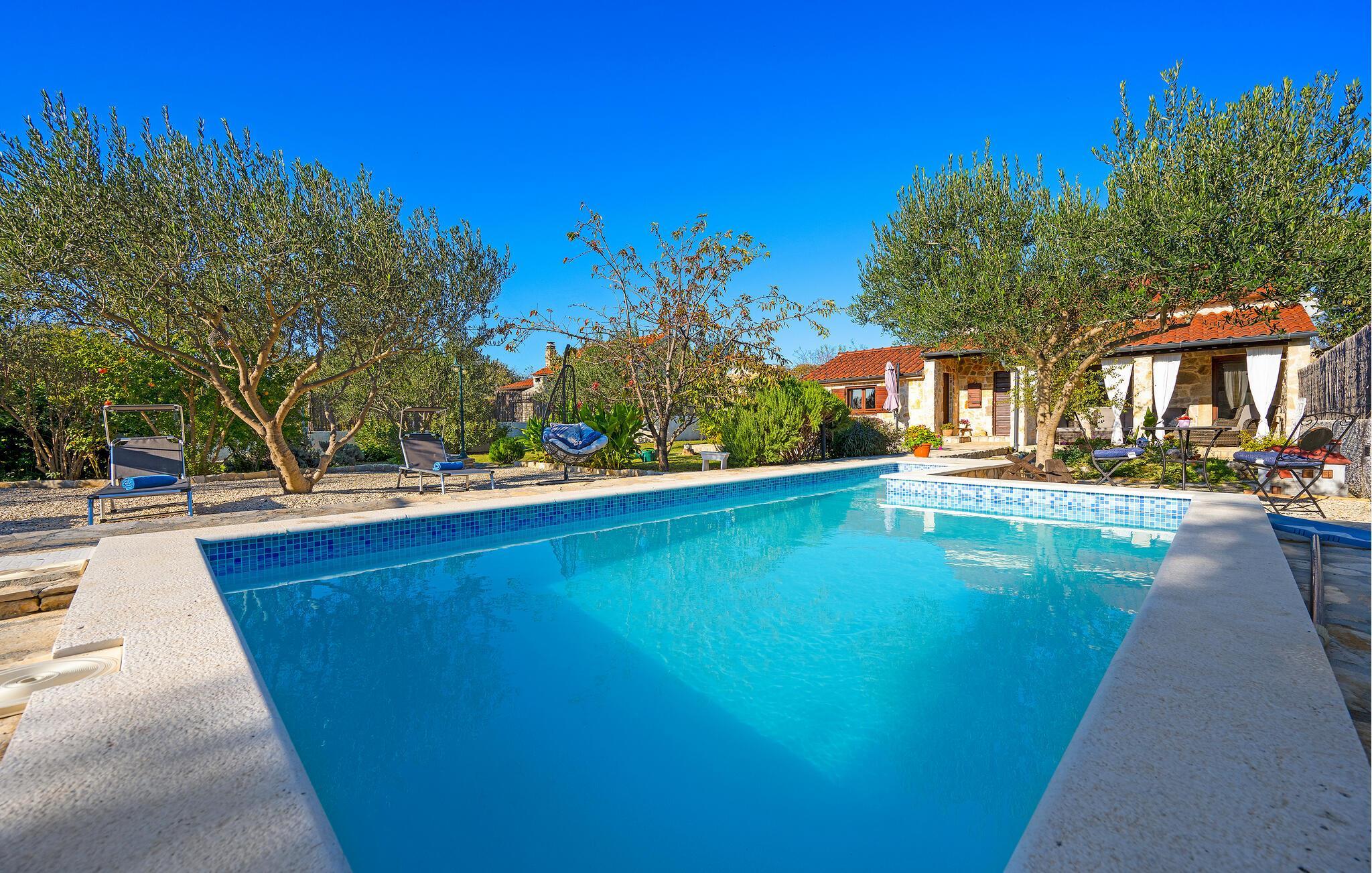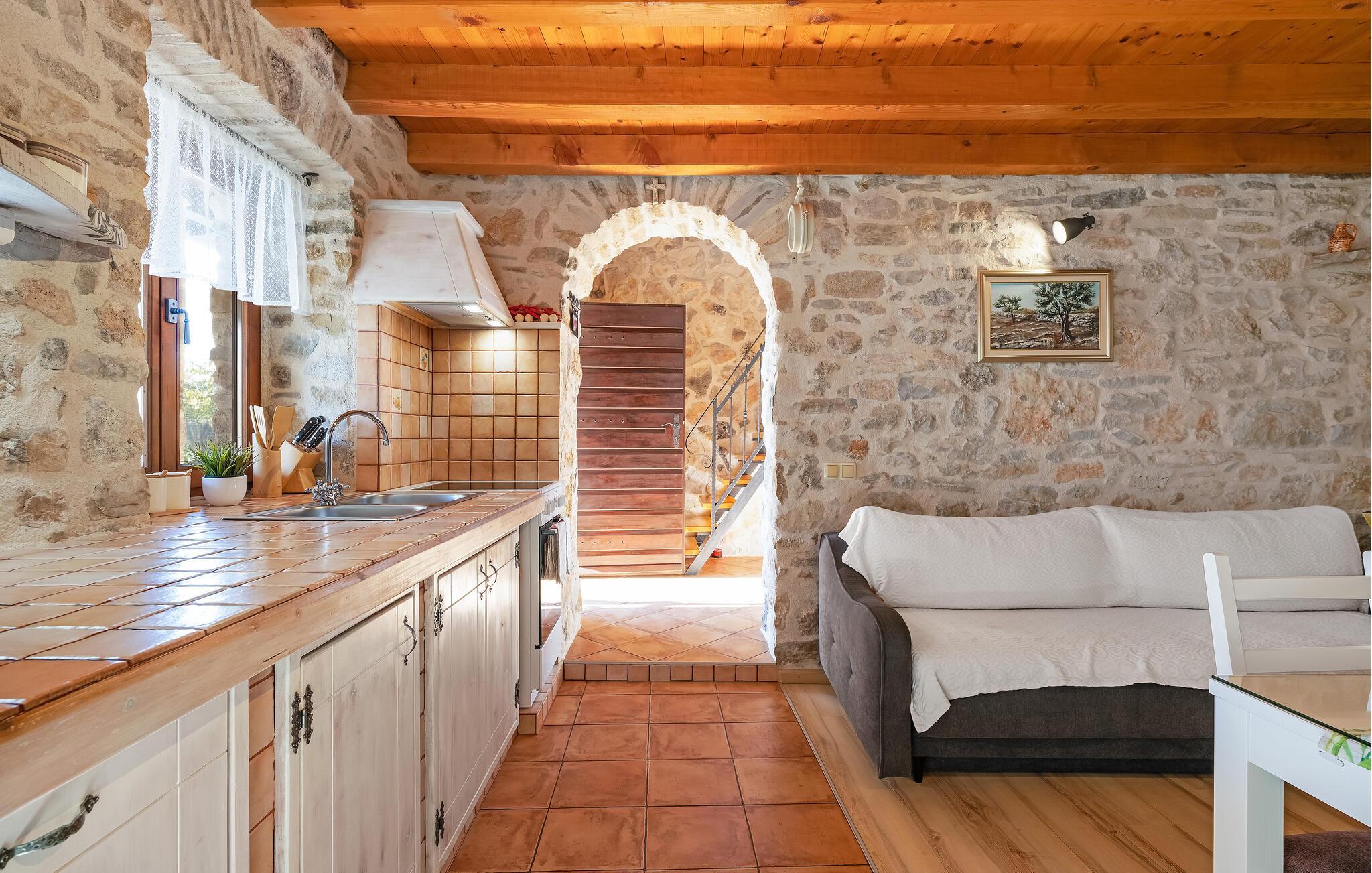 Dieses charmante Ferienhaus aus Stein befindet sich in einem kleinen, ruhigen Dorf in der Nähe von Šibenik, im Krka Nationalpark.Die Galerie ist über eine steile Treppe erreichbar und das Schlafzimmer mit Bad hat einen separaten Eingang auf der überdachten Terrasse. Sie können angenehme Sommermomente am Pool verbringen oder sich mit den Annehmlichkeiten für Kinder vergnügen. Machen Sie einen gemütlichen Spaziergang zu den wunderschönen Krka Wasserfällen, die nicht weit vom Ferienhaus entfernt sind. Es gibt auch die historische Stadt Skradin und das antike Scardona, ein hübscher Ort mit einem reichhaltigen gastronomischen Angebot. Der erste Strand und das Meer sind ca. 10 km entfernt.