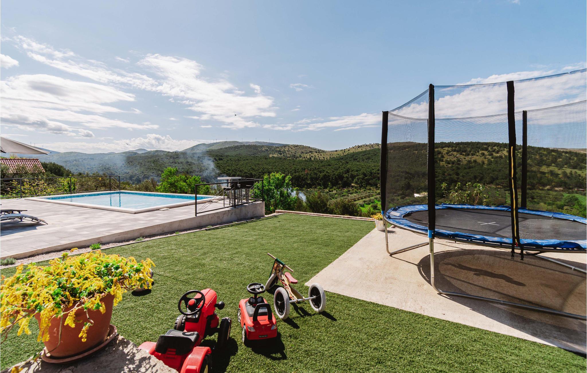 Die Panoramaaussicht vom Garten ist entschleunigend und lässt Sie beim Baden und Sonnen entspannen. Ihre Kinder werden mit Freude im Garten spielen, auf dem Trampolin hüpfen und den Garten mit Lachen erfüllen.